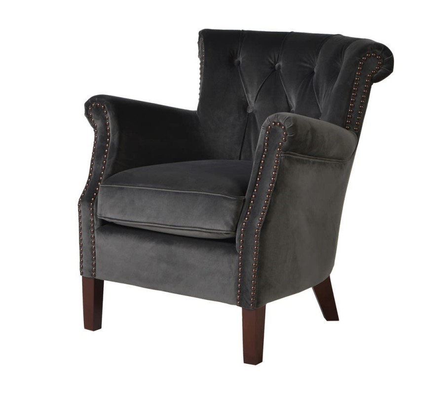 Luxusné Chesterfield kreslo Denvy v sivom zamate s tmavo hnedými drevenými nohami 77cm