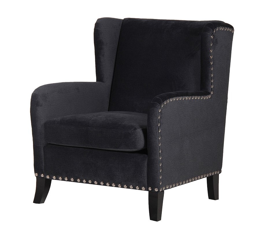 Luxusné čierne kreslo s kovovými ozdobnými prvkami a čiernym zamatovým čalúnením bude ideálnym doplnkom moderne zariadených interiérov, ktorým zároveň dodá honosný nádych.