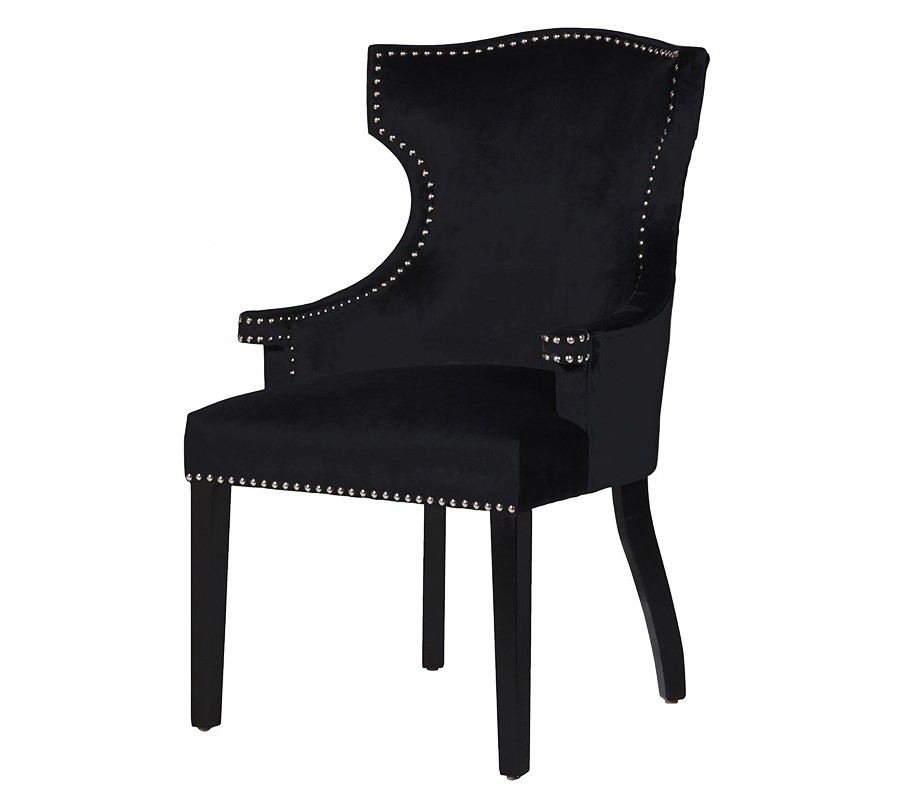 Čierna stolička v štýle glamour je vyrobená z dreva a čalúnenie má potiahnuté čiernym zamatom. Dominantnou je jej zdobenie v striebornej lesklej farbe, čo jej dodáva luxusný glamour štýl. Stolička disponuje opierkami na ruky a aj opierkou na hlavu, vďaka čomu je sedenie v nej komfortným a veľmi pohodlným. Hodí sa do kombinácie napríklad so zrkadlovým nábytkom alebo do iných v striebornej farbe ladených interérov v kombinácii s čiernou.