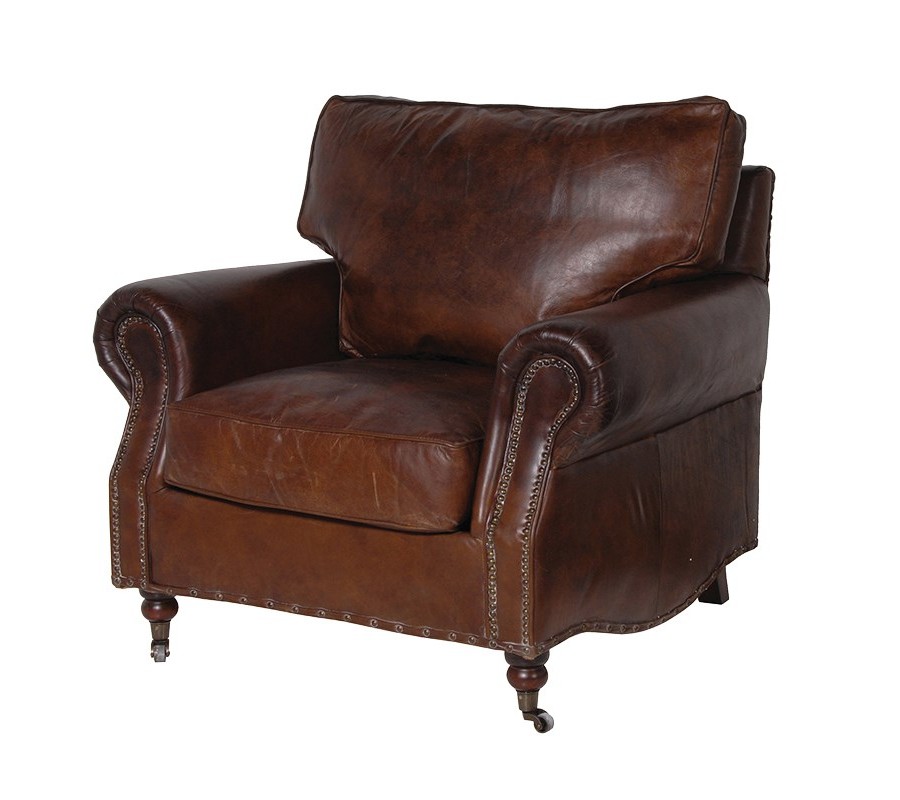 Luxuné kožené kreslo má dominantné oblúkové opierky a vankúš sčalúneným z pravej talianskej kože v mieste chrbtovej opierky. Vyzdobené je decentnými vybíjanými cvokmi na svojom spodnom okraji a po bokoch opierok. Vďaka cvokom v starej medennej farbe a tmavohnedej koži kreslo dodá interiéru vintage vzhĺad. Kreslo má mäkké sedenie, vďaka čomu sa v ňom bude každý komfortne cítiť. S kreslom sa pohodlne manipuluje vďaka kolieskam umiestneným na jeho predných vyrezávaných nožičkách. Vhodné je do miestnosti s honosným nábytkom z dreva v tmavej hnedej farbe.