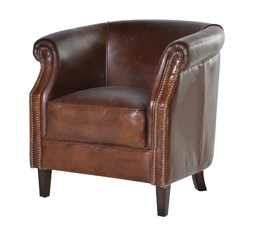 Hnedé kreslo je čalúnené pravou kožou s lesklou sýtohnedou úpravou na povrchu. Pravá koža, ktorou je toto kreslo potiahnuté, je príjemná na dotyk a pôsobí luxusne a honosne. Bočné strany opierok sú lemované ozdobnými cvokmi v starozlatej farbe vďaka čomu kreslo získava vintage vzhľad. Kreslo je vhodné do reprezentatívnych priestorov kancelárii, do luxusnejších barov a aj obývačiek. Vhodné je do kombinácie s kvalitným drevenným nábytkom hnedej farby so zachovalou štruktúrou dreva.