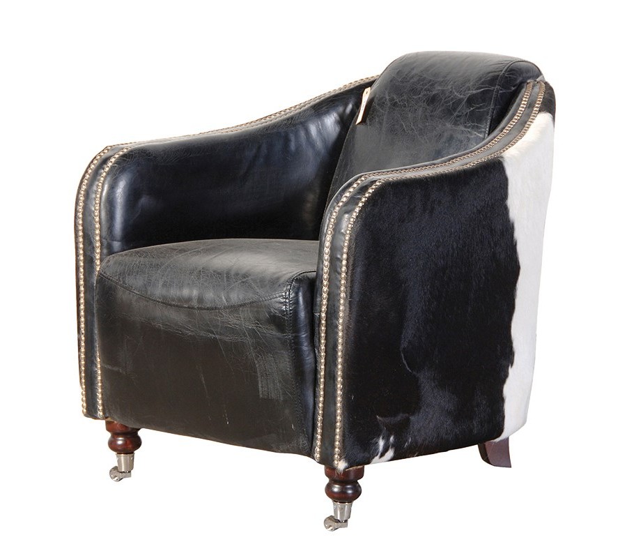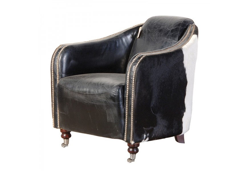 Výnimočné štylové kreslo Belmont v prevedení z pravej kože sa zaručene stane neprehliadnuteľným prvkom každého vidiecky ladeného interiéru, luxusnej knižnice či pánskeho salónu. Pohodlie na sedadle a operadle je zabezpečené hladkým koženým čalúnením, ktoré je po vonkajších okrajoch kresla doplnené poťahom s autentickou srsťou v čierno-bielom prevedení. Autentický vzhľad koženého čalúnenia je doplnený decentnými nožičkami z dreva, na ktorých sú pridané praktické kolieska.