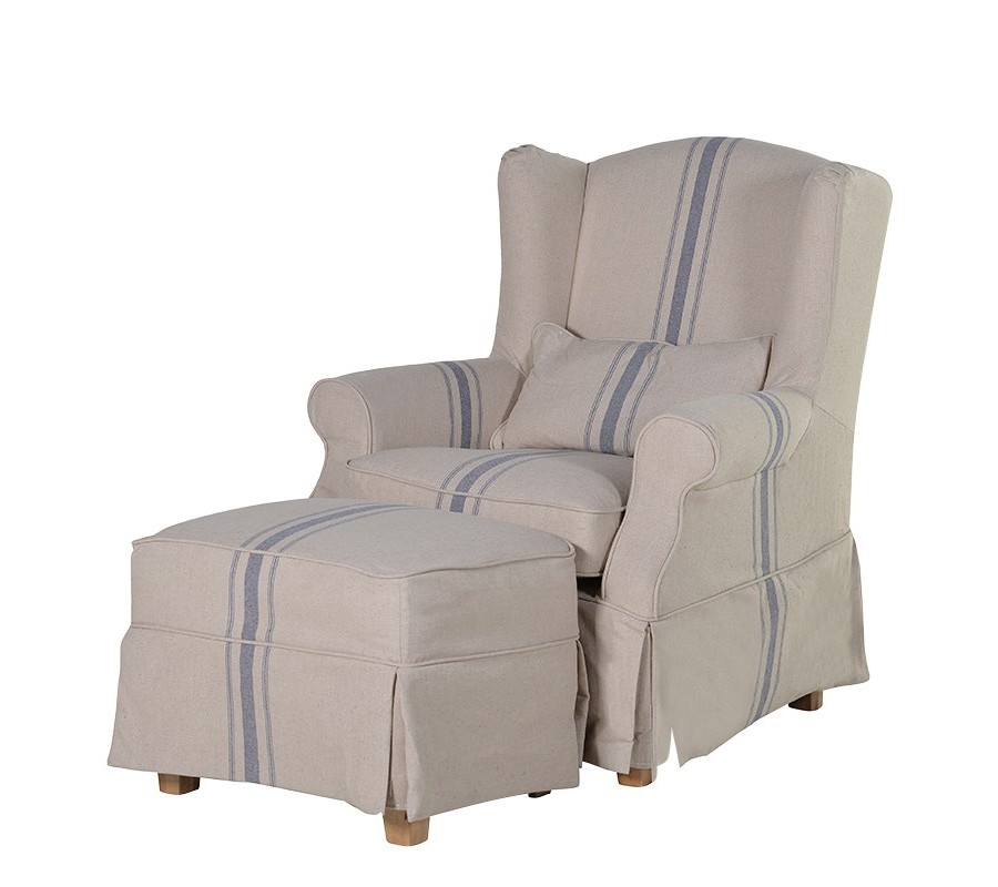 Nadčasový dizajn kresla Benicia je vhodný do každého klasického vidieckeho interiéru. Obľúbený ležérny vzhľad kresla prináša do interiéru pocit komfortu a pohodlia. Mäkké čalúnenie s jemnými pásikmi modrej farby na bledej poťahovej látke sa harmonicky dopĺňa s prírodným vzhľadom drevených nôh kresla. Súčasťou kresla je bedrový vankúšik a praktický taburet v rovnakom dizajne. Vďaka výške čalúneného operadla v tvare ušiak a pohodlných opierok na ruky je kreslo Benicia vhodné aj na dlhé odpočinkové sedenie. Kreslo krásne vynikne ako solitérny prvok v kombinácii s príručným stolíkom a stojacou lampou. Pocit pohodlia počas odpočinku v kresle môžete umocniť pridaním menšieho koberca.