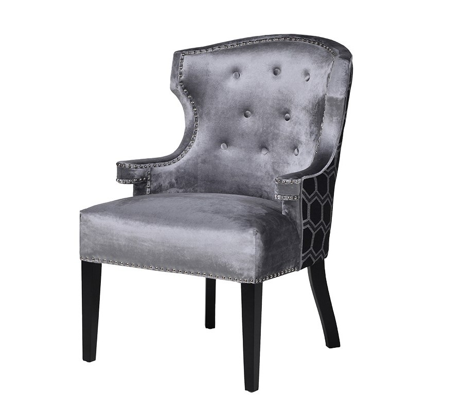 Atypické kreslo Leeroy sa pýši naozaj jedinečným a exklzívnym prevedením. Kombinácia sivého zamtového čalúnenia, ktoré mu dodáva chesterfield nádaych, poťahovej látky na chrbtovej strane kresla s výrazným vzorom včelieho úľa a samotných dizajnových prvkov v podobe drobných strieborných cvokov pôsobí naozaj odvážne a exktravagantne. Nohy kresla Leeroy sú, rovnako ako i telo kresla, z masívneho dreva s čiernym lesklým náterom, jemné zakrivenie nožičiek zabezpečuje stabilitu a vytvára čerešničku na torte tohoto masívneho art-deco kúska.