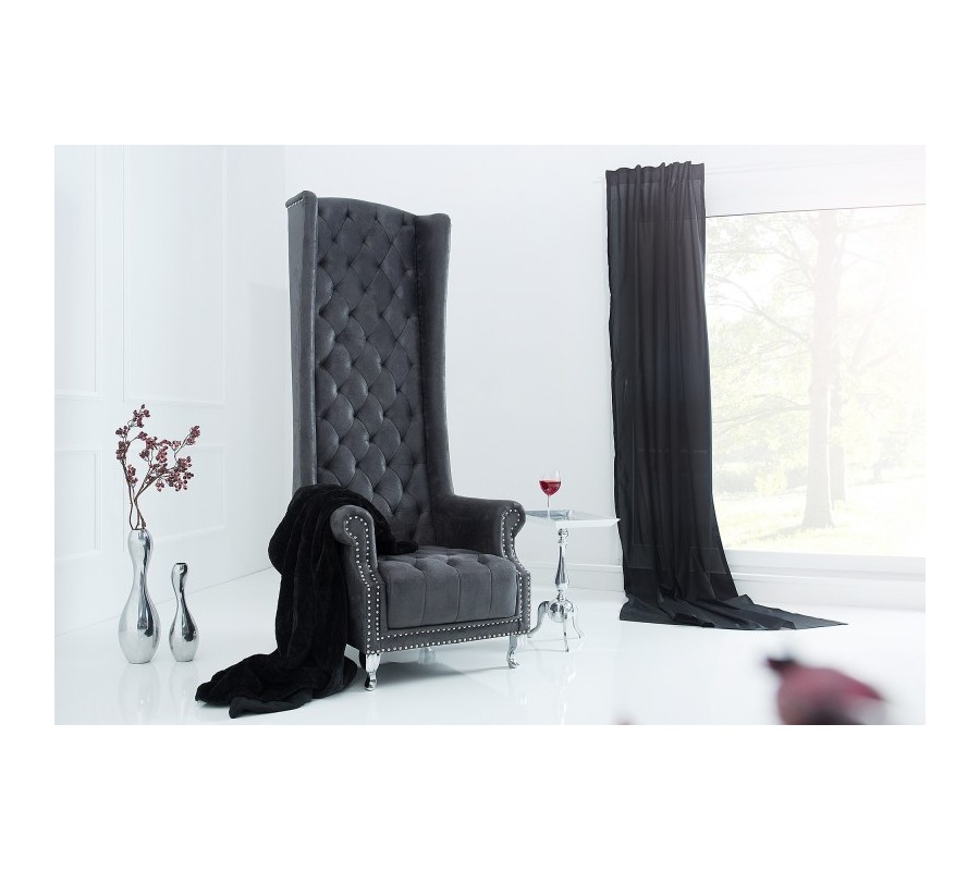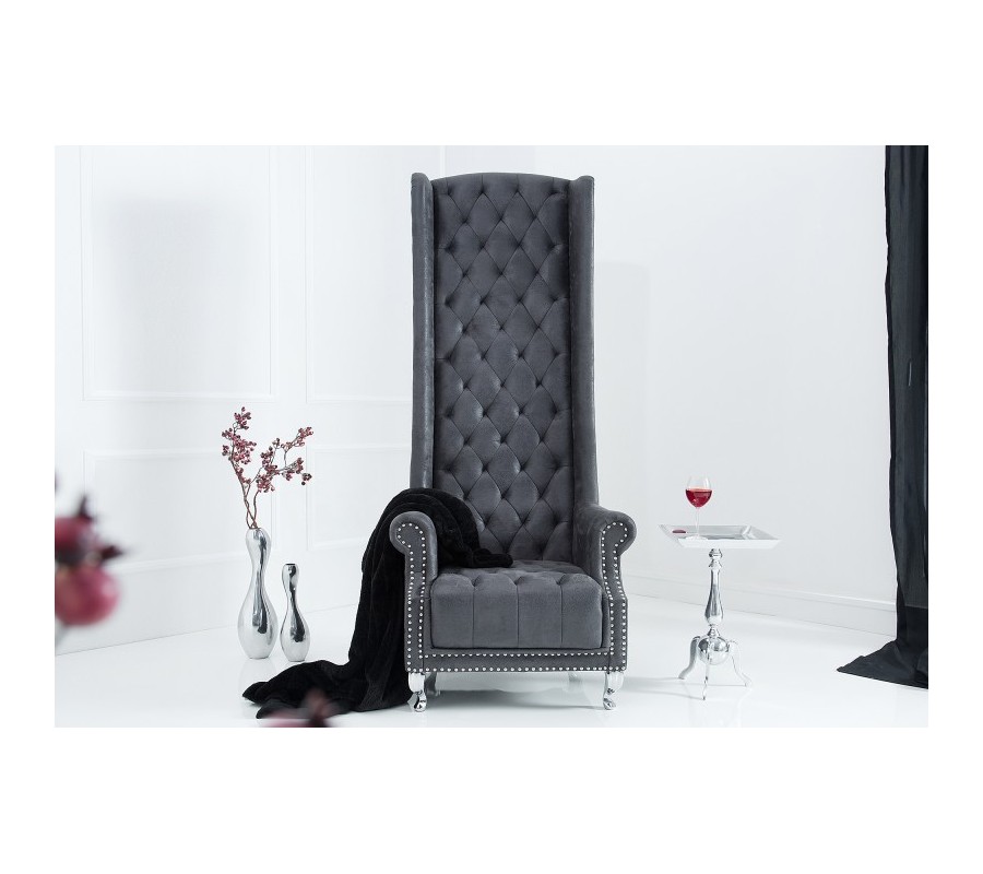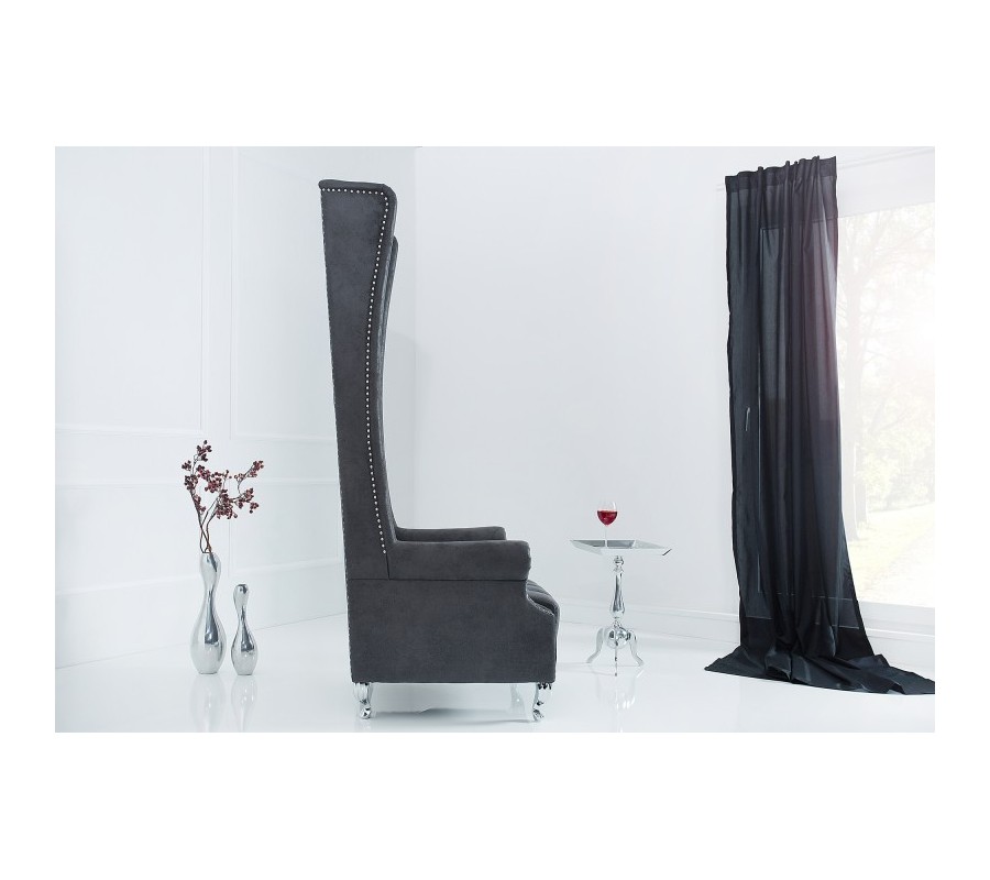 Luxusné vintage kreslo Royal v nadčasovom, šedom farebnom prevedení na prvý pohľad upúta svojim neprehliadnuteľným, vysokým operadlom a elegantným, prešívaným a zdobeným čalúnením. Kreslo sa skvelo hodí či už do moderných, ale aj typických vintage priestorov, ktorým vďaka svojmu neprehliadnuteľnému vzhľadu dodá nádych elegancie a luxusu.