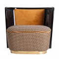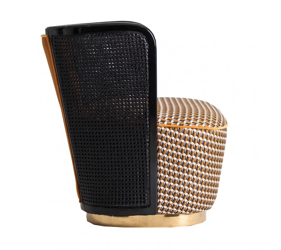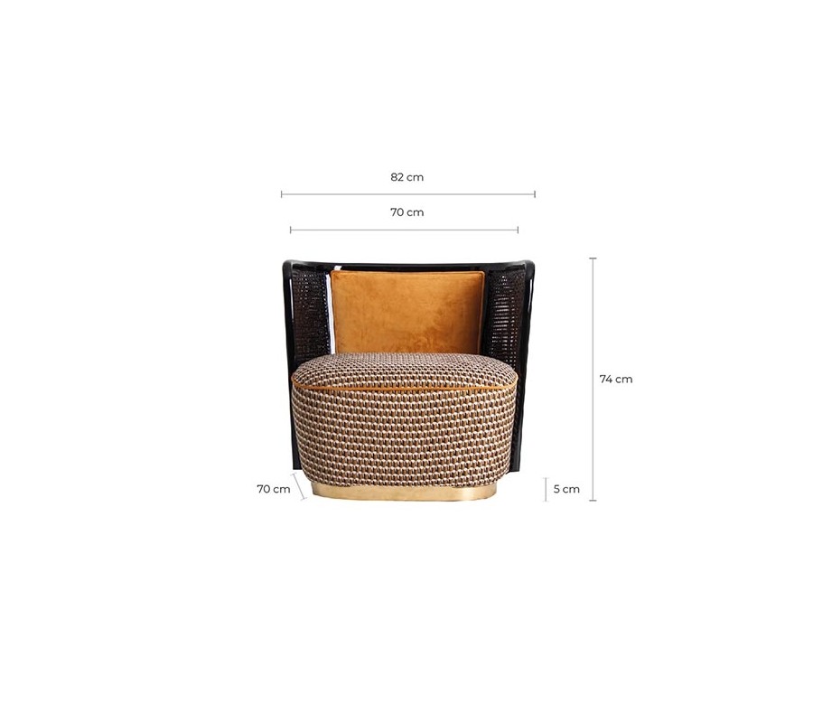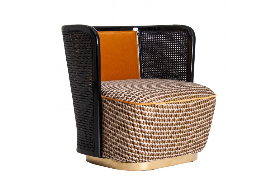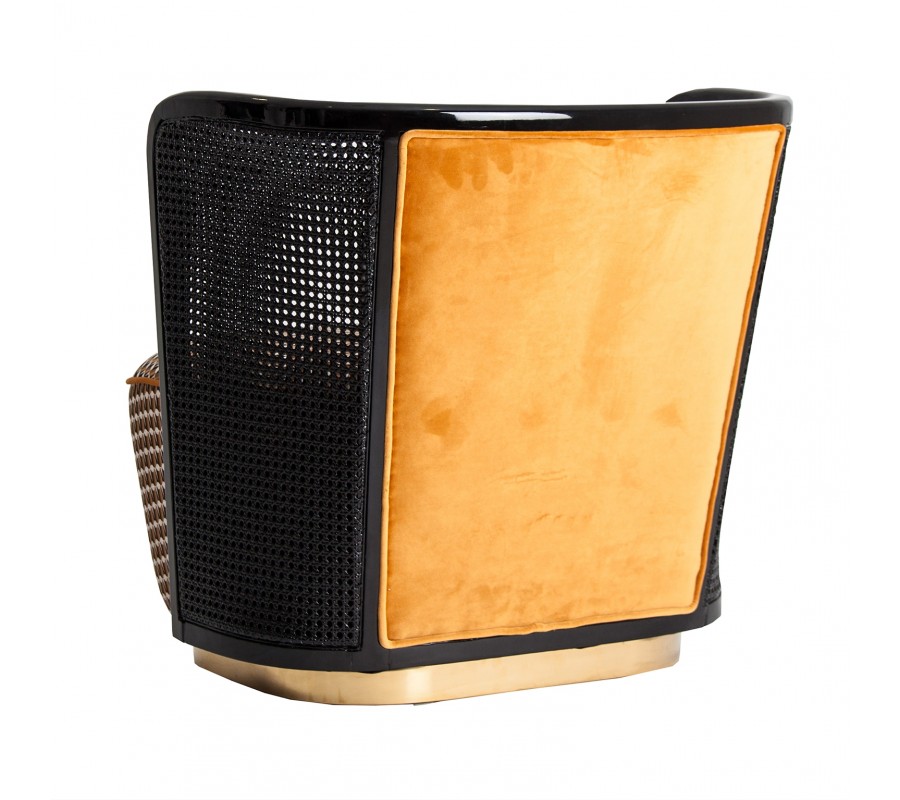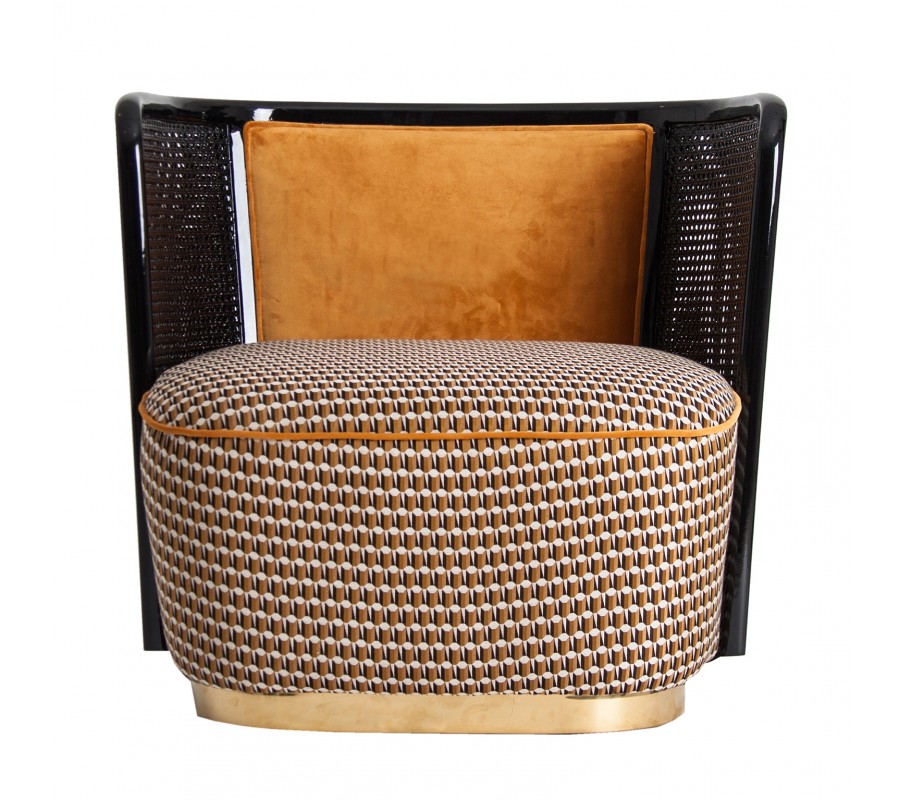 Jedinečné kreslo Brilon v luxusnom Art-deco štýle sa stane strojcom nezameniteľného pohodlia vo vašom interiéri. Rafinované zaoblené masívne operadlo, ktoré plynule prechádza do opierok na ruky je vypletané ratanom v tmavom odtieni a celkový vzhľad operadla tak značne odľahčuje. Pohodlie počas sedu je zabezpečené zamatovým čalúnením na operadle v horčicovej farbe, ktoré je doplnené geometrickým vzorom na poťahu sedadla v ladiacich odtieňoch. Elegancia a pôvab kresla Brilon sú podčiarknuté kovovou podstavou v tvare kruhu v luxusnom zlatom prevedení. Tento mimoriadny kúsok sa nestratí v žiadnom luxusnom priestore plnom Art-deco prvkov z kovu, masívnych povrchov z exotických drevín či drahých kameňov. Odporúčame ho kombinovať s ďalšími prvkami z našej rovnomennej kolekcie Brilon v rovnakom štýle a prevedení.