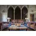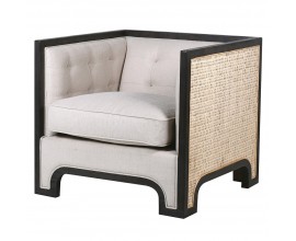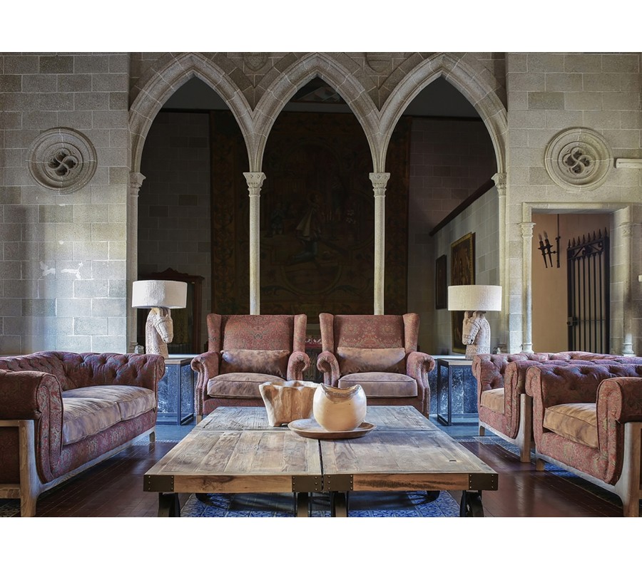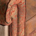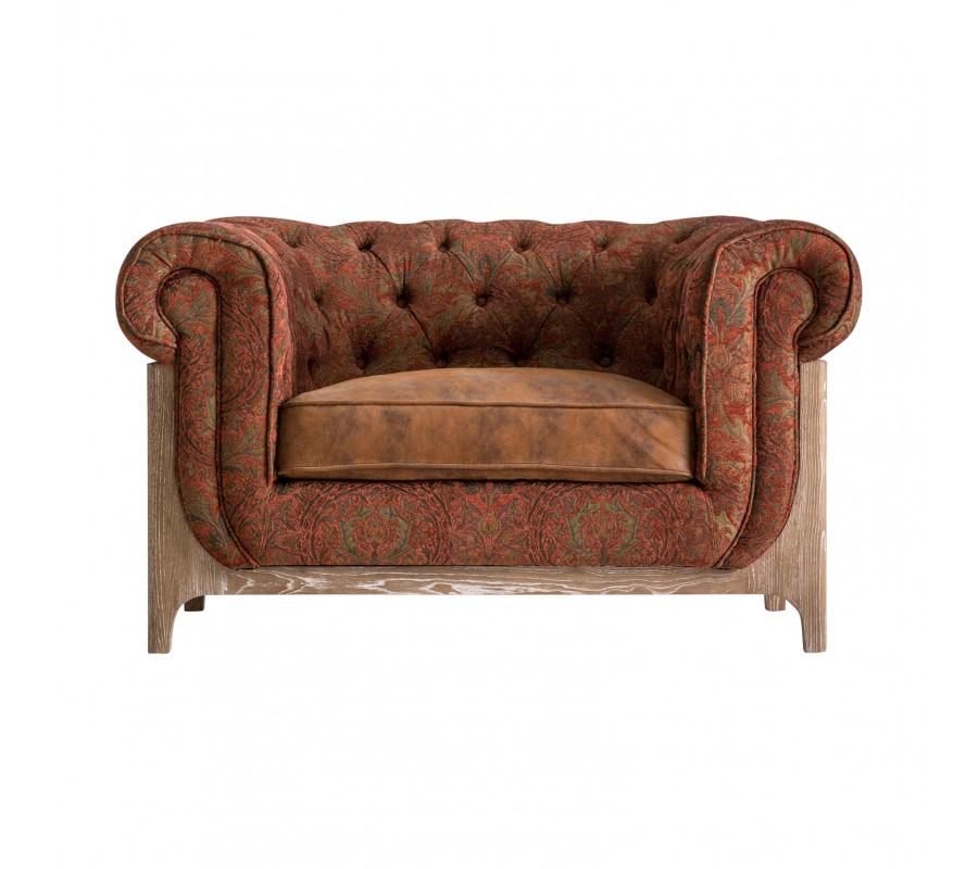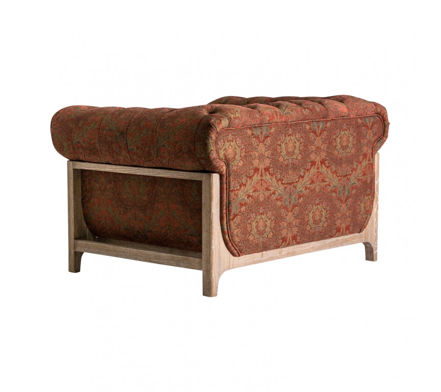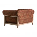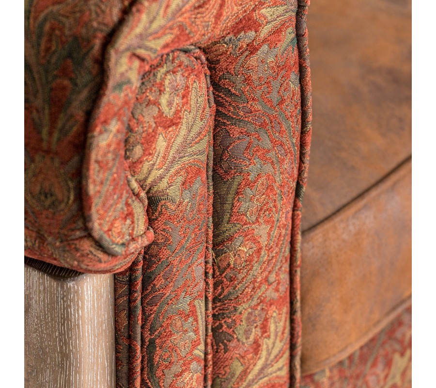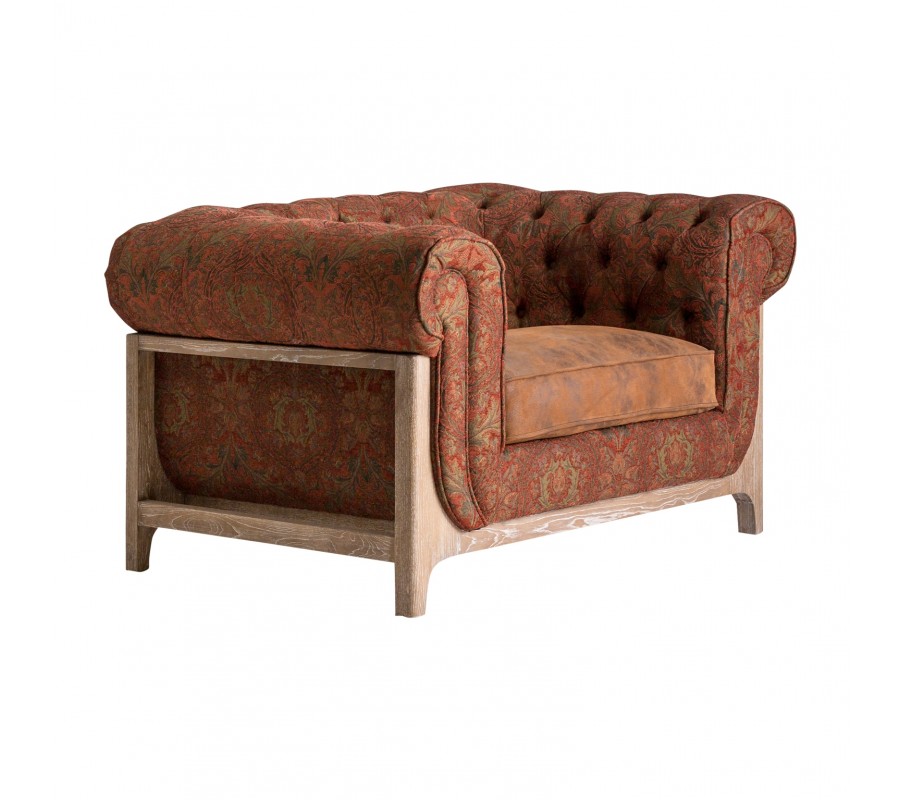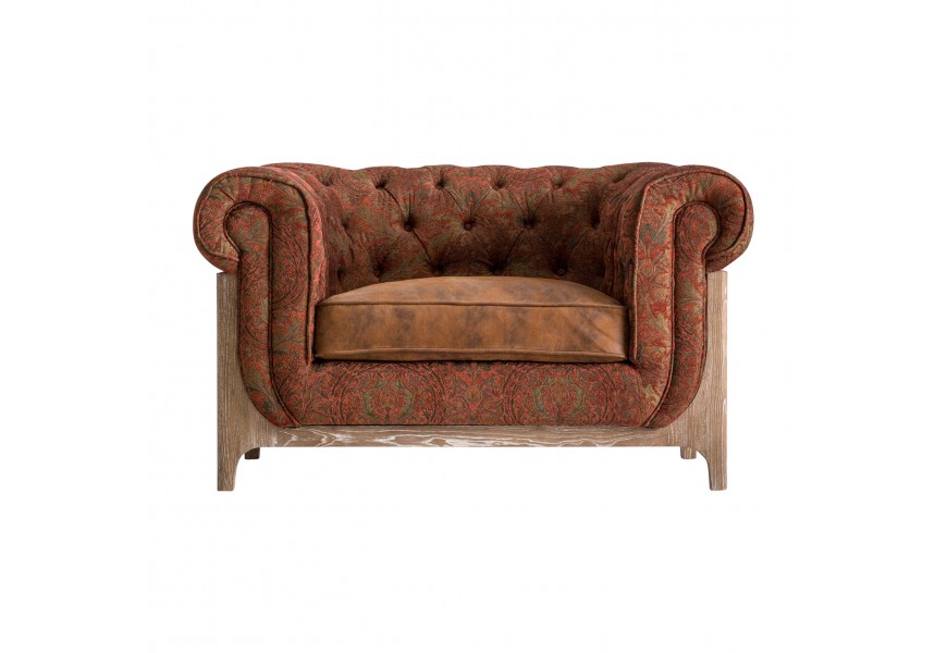 Štýlové vintage kreslo Bath v červenohnedej farbe zaujme na prvý pohľad svojim ornamentálnym vyšívaným zdobením svojho čalúneného poťahu. Čalúnenie opierok na ruky a chrbta je zároveň prešívané v štýle chesterfield. Konštrukcia kresla je z masívneho dreva s povrchovým sfarbením v štýle zostarnutej bielej farby (washed white). Kreslo je doplnené o podsedák potiahnutý pravou kožou v hnedom zvetranom prevedení.