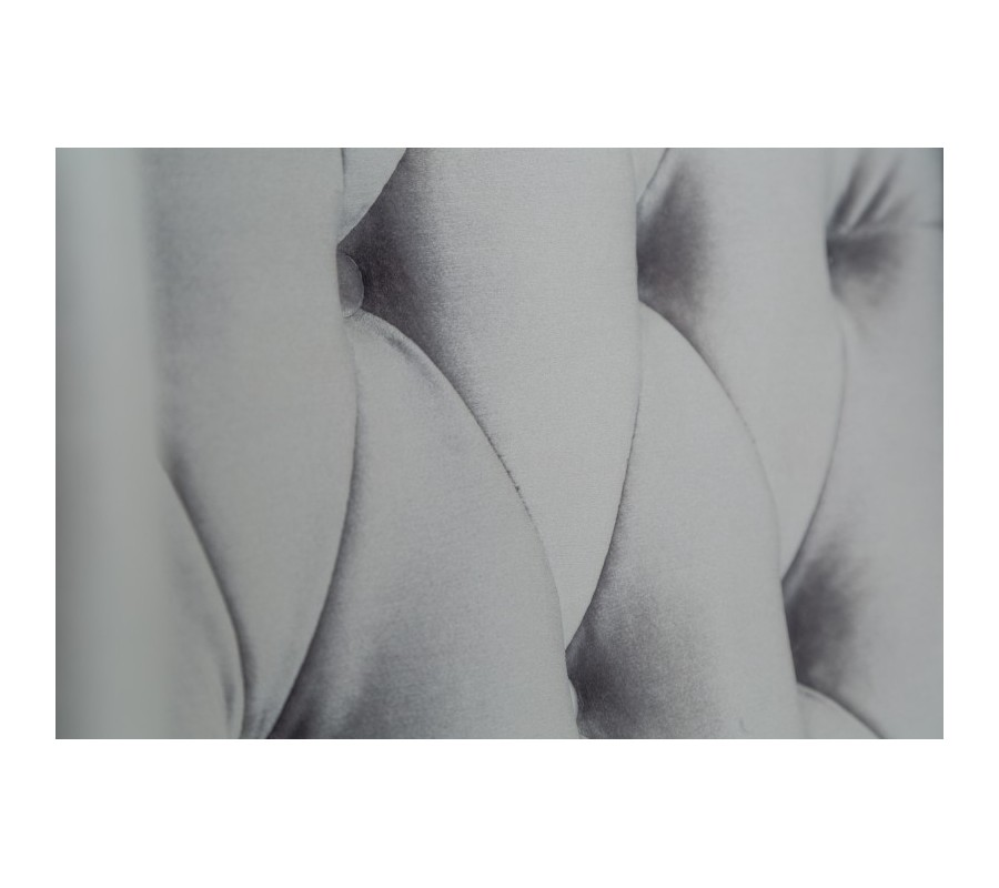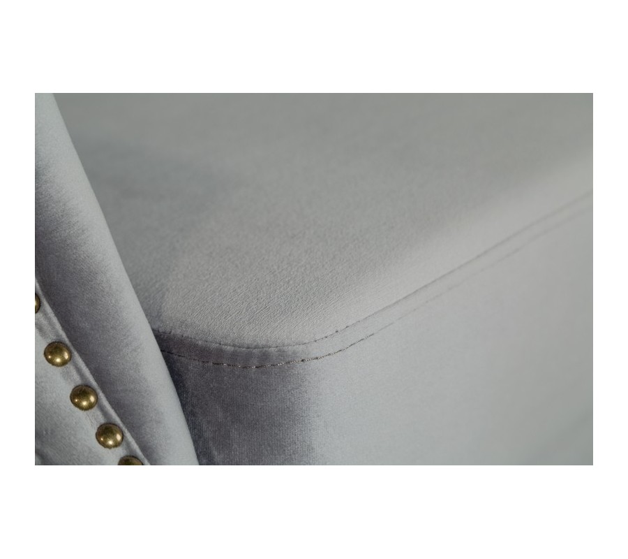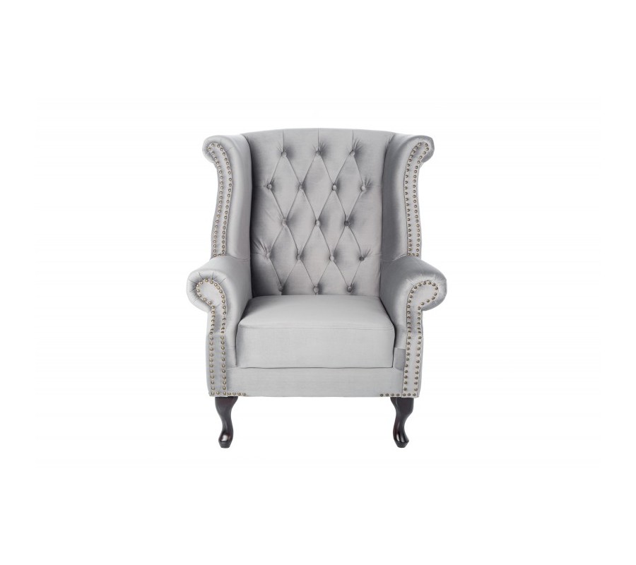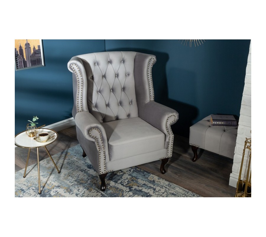 Zamatové dizajnové kreslo v sivej farbe na drevených nožičkách z masívu. Klasické anglické prešívanie Chesterfield v spojení s barokovým štýlom spracovania drevených nožičiek vytvára elegantný kúsok vhodný do každej modernej domácnosti. Vzhľad je vyšperkovaný vybíjaním prvkami zlatej farby. Vysoká opierka na chrbát a hlavu a pohodlné opierky na ruky v kombinácii s pružinovým jadrom zabezpečia komfort pri čítaní vašej obľúbenej knihy. Kreslo vynikne v obývačke pri kombinácií s taburetkou rovnakého štýlu a taktiež s lesklými či sklenými prvkami.