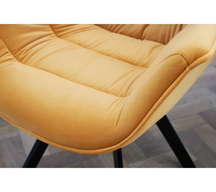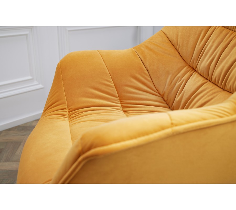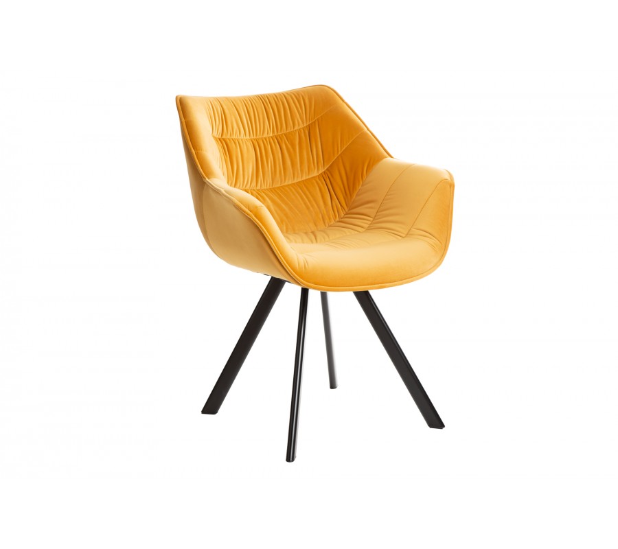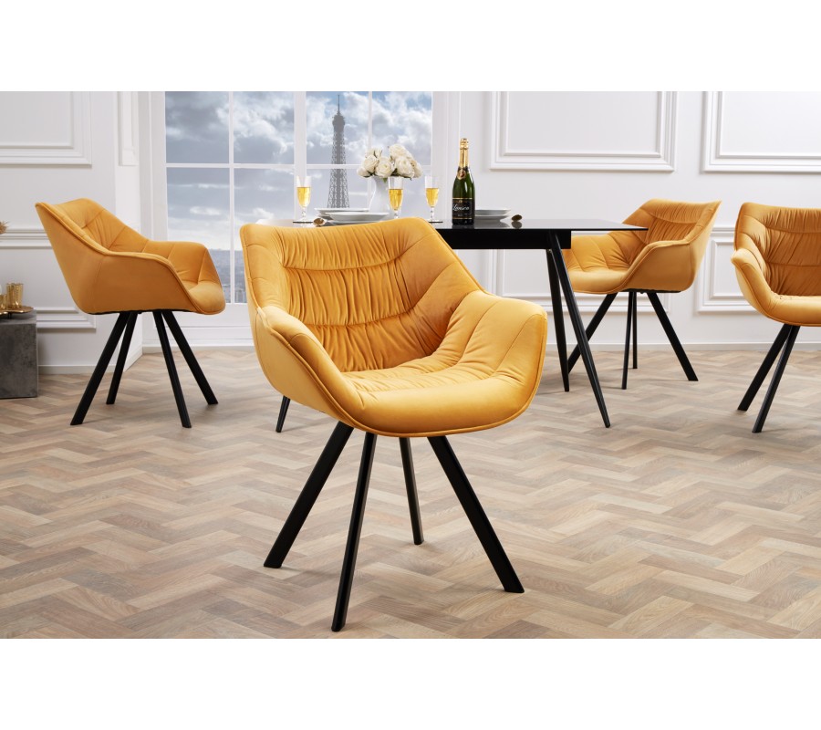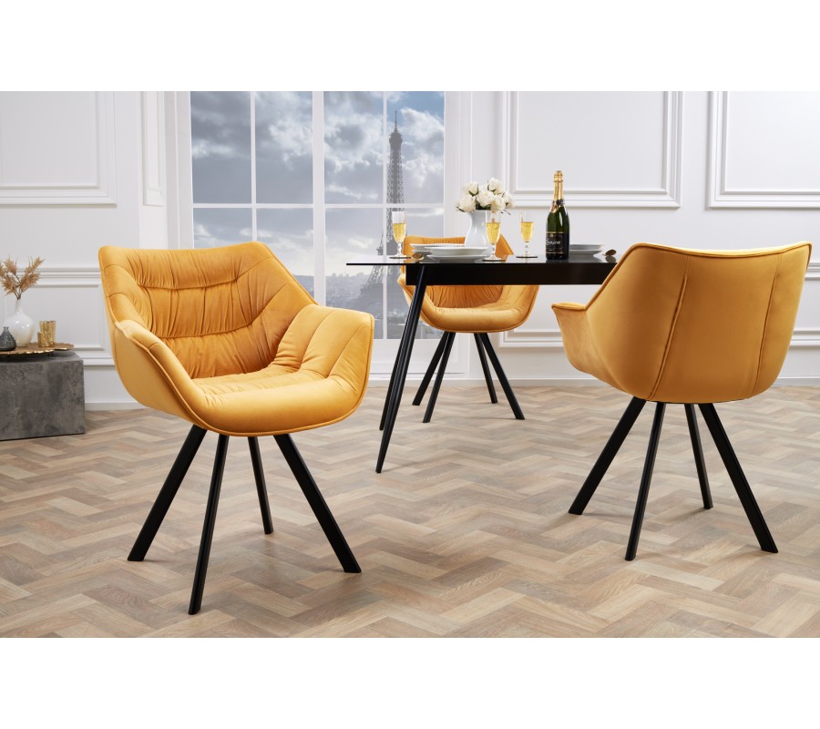 Štýlová stolička Antik na prvý pohľad zaujme svojím žiarivo žltým poťahom, ktorý u vás doma vyčaruje moderný a nadčasový vzhľad. Poťah je vyrobený z príjemného zamatu, vďaka ktorému bude vaša práca či stolovanie komfortnou záležitosťou. K tomu prispieva aj tvarovanie sedacej časti, operadla a podrúčok, ktoré vytvárajú jeden celok uspôsobený k pohodlnému sedu. Horčicovo žltý poťah dopĺňajú čierne kovové nohy, ktoré tvoria dizajnový kontrast a zároveň dodávajú kreslu retro vzhľad. Hodí sa najmä do tmavšie ladených interiérov, či už sa jedná o jedáleň, obývačku alebo pracovňu, kde vytvorí kontrastný prvok a vašu miestnosť skutočne rozžiari.