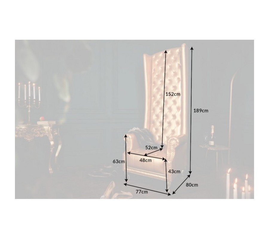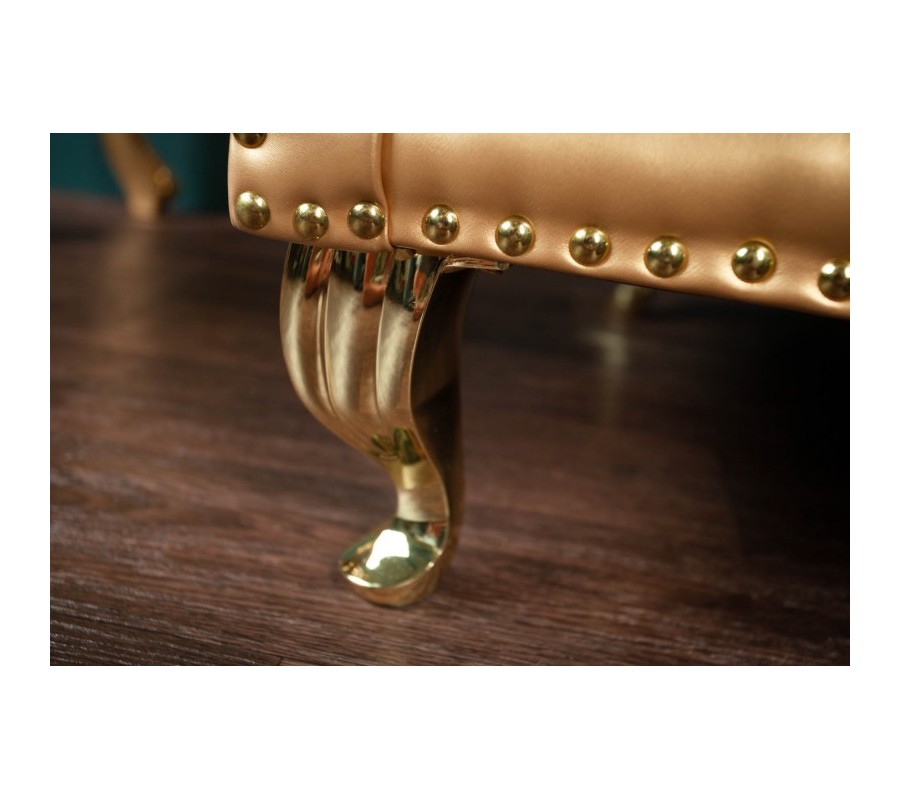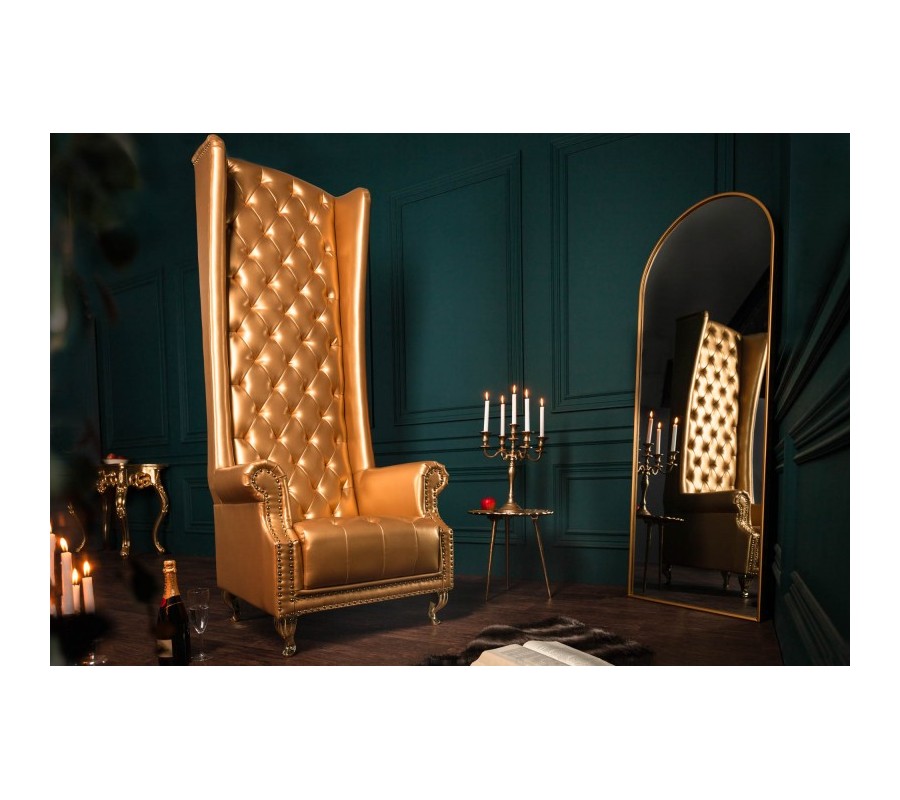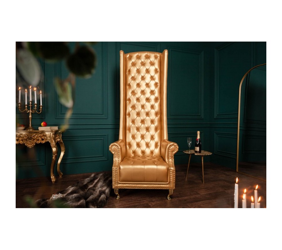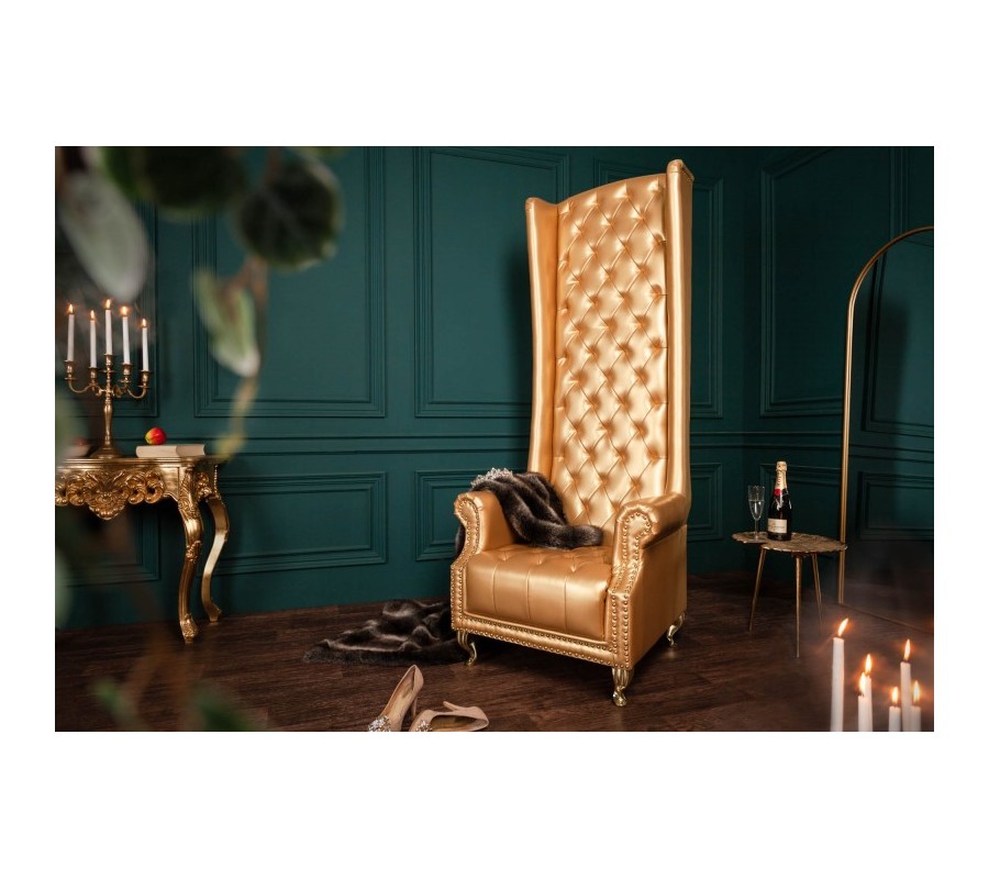 Jedinečné kreslo Royal je extravagantným kúskom, ktorý nádherne vynikne v priestranných obývačkách či luxusných verejných priestoroch hotelov. Na prvý pohľad zaujme najmä vďaka svojmu vysokému operadlu s nadčasovým chesterfield prešívaním. Poťah z ekokože sa nesie v štýlovej zlatej farbe a je doladený zlatými kovovými nožičkami. Celkový dizajn dopĺňajú štýlové kovové cvoky v prednej časti kresla, ktoré veľmi zľahka zapadne i do priestoru vďaka čalúnenej zadnej časti. Kreslo Royal vynikne najmä v luxusných barokovo či zámocky ladených priestoroch a dá sa krásne doladiť farbami ako je smaragdovozelená, rubínovo červená, purpurová či tmavomodrá.