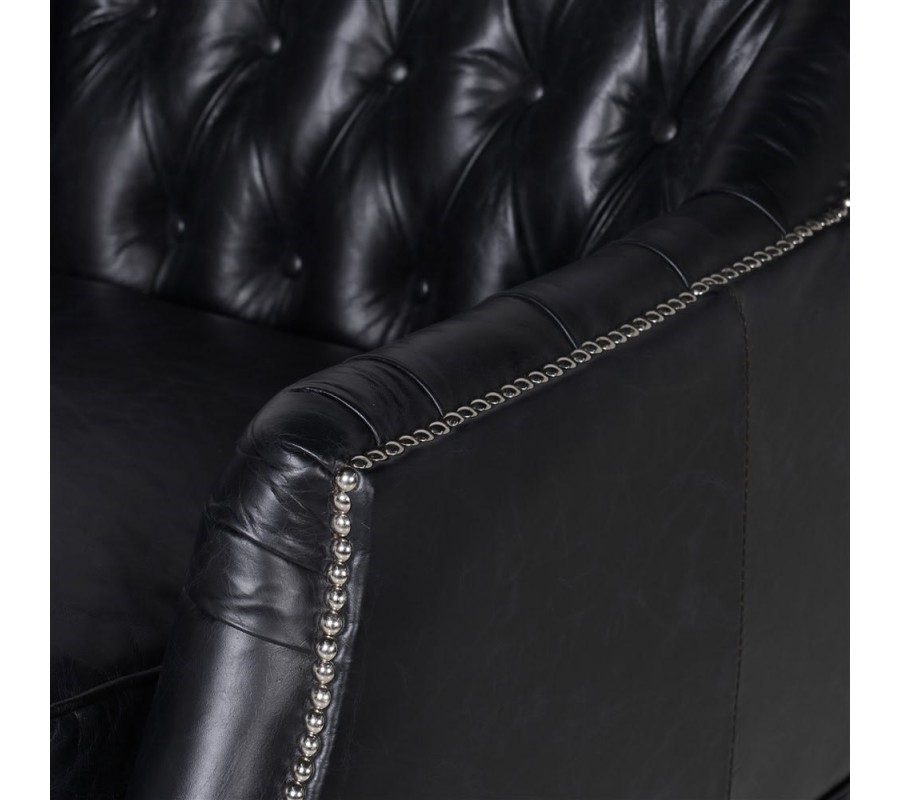 Luxusné čierne kreslo z pravej kože v Chesterfield štýle s drevenými nohami z masívu 87cm