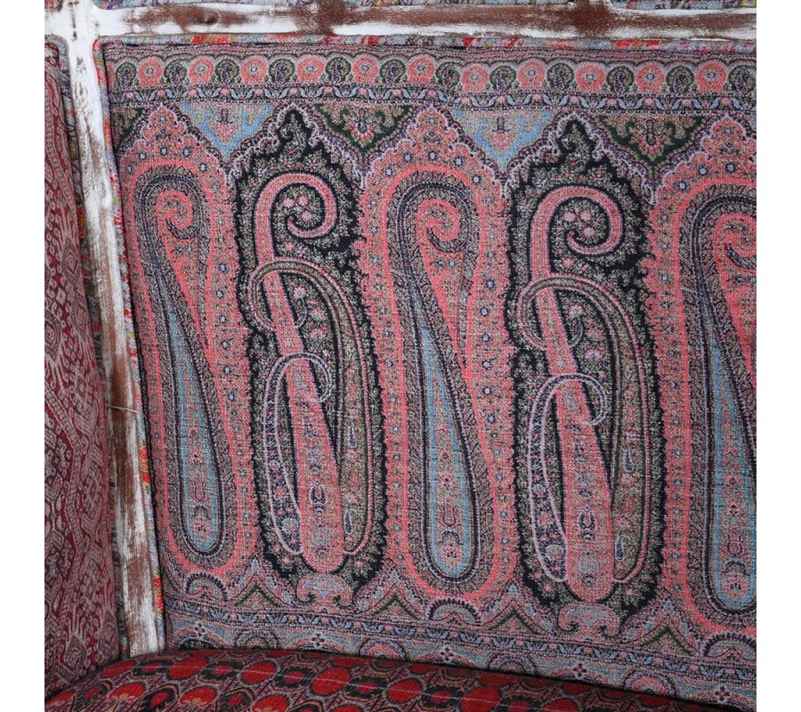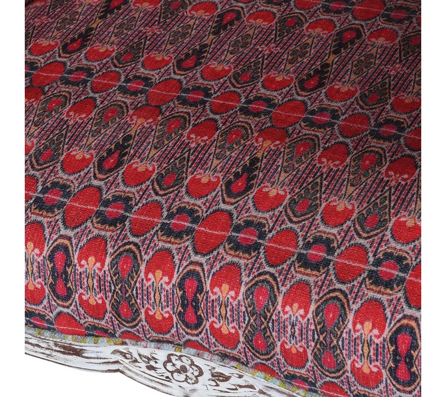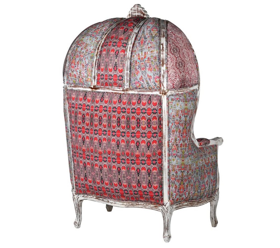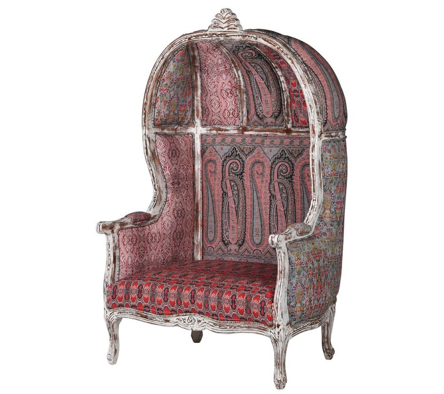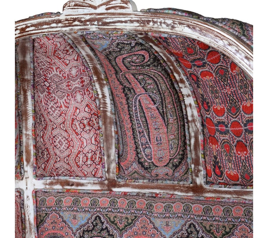 Originálne vintage kreslo Alia určite neprehliadnete. Spojením viacerých výrazných kúskov vzniká jedinečný eklekticý dizajn, ktorý nadchne vašich hostí. Na prvý pohľad vás zaujme vysoká opierka ukončená na vrchole polovičnou kupolou, ktorá je typická pre kreslá typu porter. V minulosti boli takéto kreslá určené pre sluhov čakajúcich na pánov a vrchná časť ich chránila pred nepriaznivým počasím. Rám z mangového dreva je natretý bielou farbou, ktorá je následne opracovaná a ošúchaná tak, aby pôsobila štýlovým vintage dojmom. Rám je ozdobený drážkovaním, pri ktorom vyniknú jeho delikátne krivky. V centrálnej spodnej časti sa nachádza vyrezávaný florálny ornament, ktorý svojou prírodnou tematikou korešponduje s väčším ornamentom korunujúcim vrchnú časť kresla a tiež paisley vzorom na čalúnením. Poťah je zhotovený z látok s rozličnými bohatými ornamentálnymi vzormi, ktoré sú prepojené odtieňmi červenej a ružovej farby. Každý kus je originálny výrobok, takže vzory čalúnenia sú na každom výrobku jedinečné. Ďalším precíznym detailom, ktorý sa postará o vaše pohodlie, je čalúnená časť na opierkách na ruky. Kreslo Alia môžete umiestniť do pracovne či knižnice, kde ho môžete doplniť ďalším vintage nábytkom, napríklad s bielym náterom podobným tomu na ráme kresla. Bude tiež dominantným prvkom vo vašej obývačke, kde prinesie nádych luxusu a veselú šarmantnú rozšafnosť.