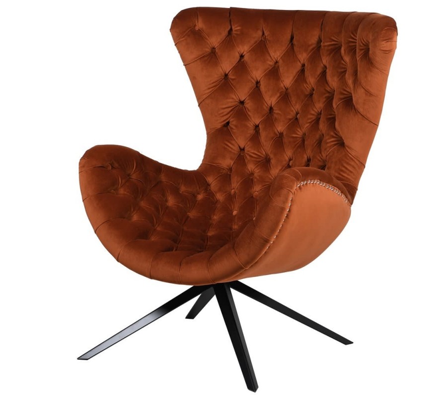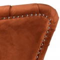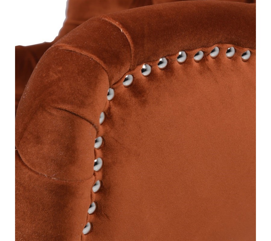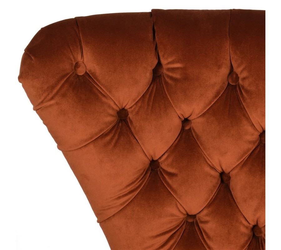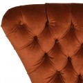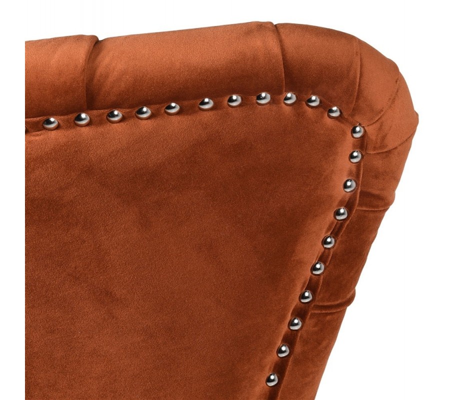 Jedinečné kreslo sa pýši svojim prevedením typickým pre Chesterfield sedačky. Vkusný zamatový poťah tmavooranžovej farby dokonale ladí s masívnymi nohami z borovicového dreva v čiernej farbe. Prešívané dizajnové prevedenie vnútorných častí operadla prepožičiava nadčasový staroanglický vzhľad kresla. Chesterfield kreslo s dekoratívnymi cvočkami v striebornej farbe vyniká svojou nadčasovou klasikou a práve preto očarí každého milovníka vintage štýlu. Kreslo môžete kombinovať rôznymi neutrálnymi bytovými doplnakmi a nábytkami.