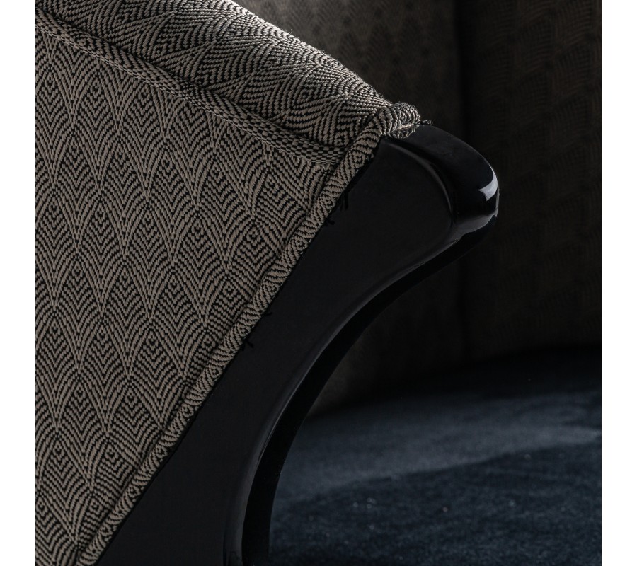 Z našej kolekcie Ampelio II vám prinášame toto jedinečné kreslo, ktoré vás zaručene zaujme svojím nevšedným art-deco dizajnom. Nadčasová čierna farba príjemne oživí váš interiér a geometrické vzory v štýle art-deco na operadle činia kreslo ešte originálnejším a štýlovejším. Vďaka príjemnému zamatu si s kreslom Ampelio II môžete dopriať ozajstný komfort a ničím nerušené chvíle oddychu. Nohy kresla v lesklej čiernej farbe sú štýlovo doplnené kovovým zakončením v zlatej farbe a tvoria s farebnosťou poťahu luxusný kontrastný súlad v štýle art-deco, ktorý možno obohatiť rôznymi doplnkami či už v lesklých čiernych a zlatých farbách alebo v inej výraznejšej farbe.