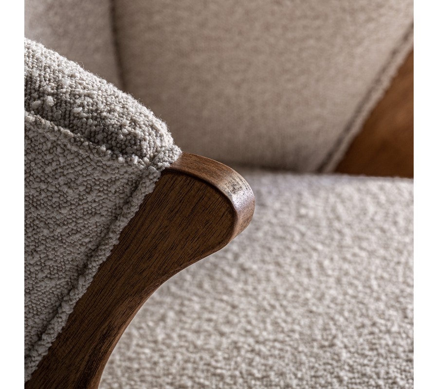 Nadčasové kreslo Aurélia vo vintage štýle je tvorené nádhernou kombináciou borovicového masívneho dreva v jeho naturálnych odtieňoch a nadčasového poťahu z buklé krémovej farby. Bavlnené buklé je typické svojim honosným vzhľadom, ktorého hutnosť a pohodlný vzhľad mu dodáva množstvo uzlov a hustota tkania. Vintage kreslo Aurélia sa nesie v jemnom nádychu retro štýlu najmä vďaka dizajnovému prevedeniu masívnych hnedých nožičiek, ktoré sú v tvare obráteného písmena V, pričom zadná z nôh je predĺžená a poskytuje oporu opierkam na ruky, ktoré zvyšujú komfort pri sedení a dovoľujú Vám pohodlne sa usadiť s vyloženými rukami. Komfort pri užívaní zaručuje taktiež hutná oblá chrbtová časť sedadla. Kreslo Aurélia odporúčame v rámci nadčasových obývačiek, kancelárií, dámskych salónov ši luxusných kaviarní kombinovať najmä so živou zeleňou, zlatými dekoráciami a luxusnými doplnkami. Jemný vzhľad kresla taktiež vynikne pri kombinácii s veľkoformátovými obrazmi.