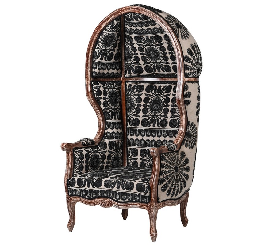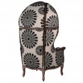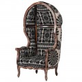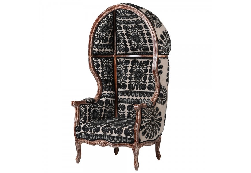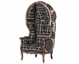 Luxusné vintage orientálne kreslo Muneca typu porter so strieškou s čierno-bielym vzorovaným čalúnením 162 cm
