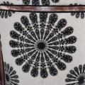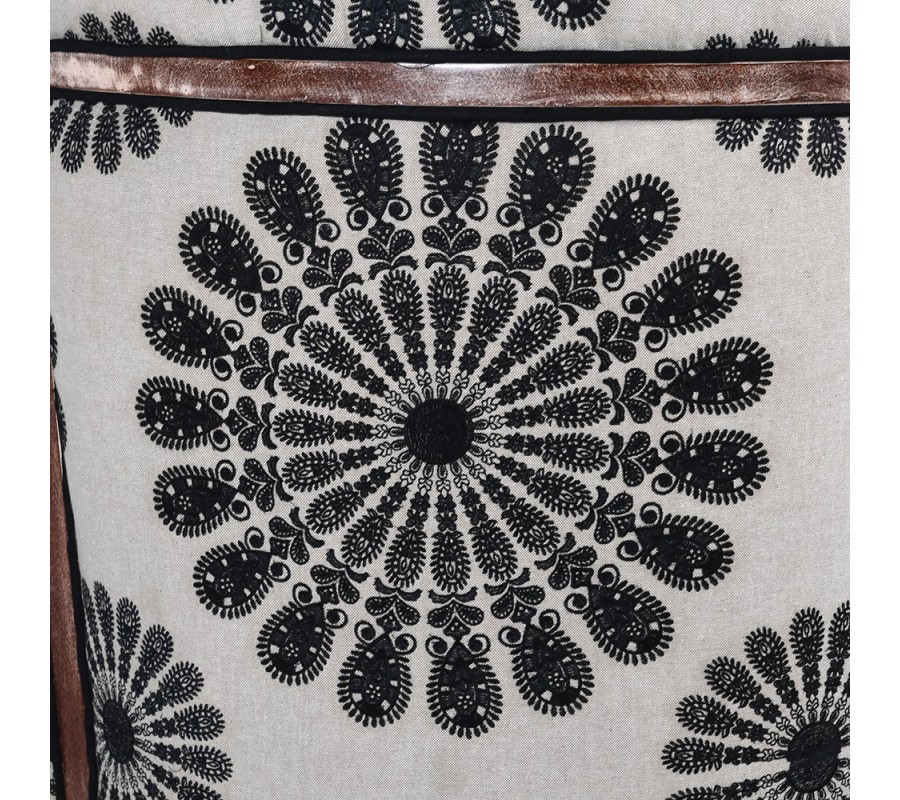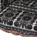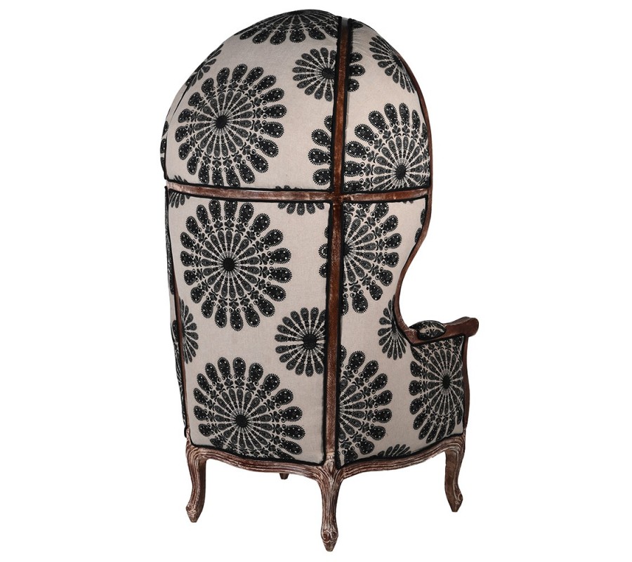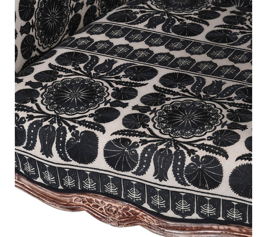 Kreslo má rám vyrobený z mangového dreva, zdobený vrezávaním. Má hnedú farbu s pozostatkami svetlého náteru s vymytým efektom. Toto spracovanie prináša do dizajnu pôvabný vintage nádych. Línie kresla sa prehýbajú v elegantných jemných krivkách a tieto ladné tvary výborne dopĺňa čierno-biela poťahová látka s orientálnym vzorom. Na vnútornej časti sa nachádzajú hustejšie florálne motívy s prevahou čiernej farby, zatiaľ čo chrbtovú opierku zdobia väččie kruhové ornamenty a prevažuje biela farba.