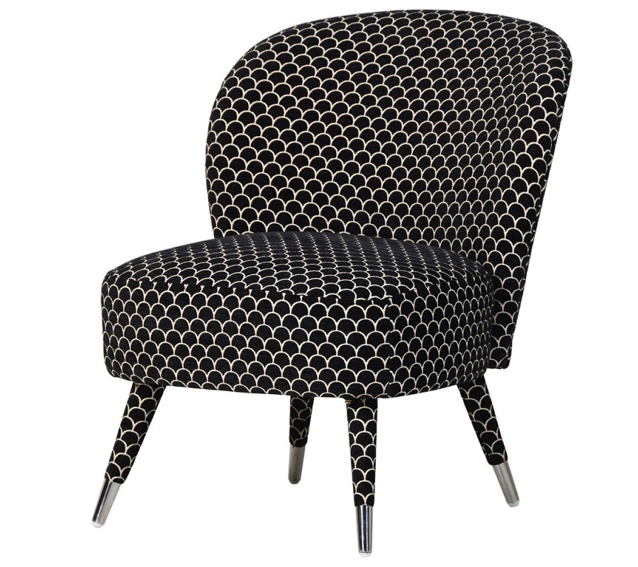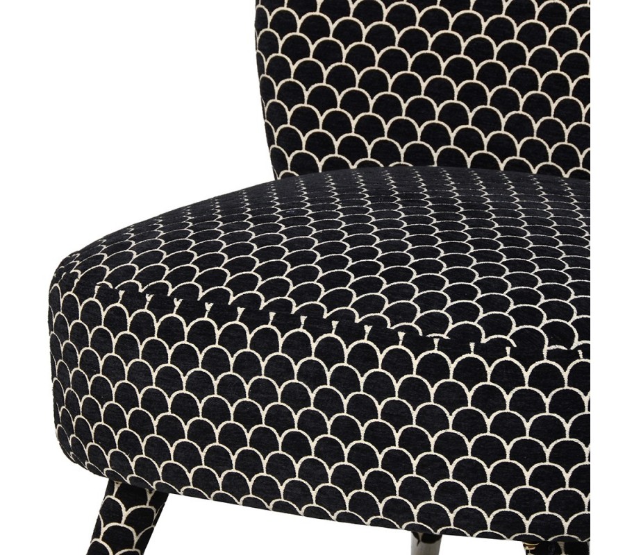 Kreslo Breca v extravagntnom art-deco štýle sa pýši nevšedným dizajnovým prevedením, ktoré môže osviežiť dizajn vo vašom interiéri. Čierne zamatové čalúnenie kresla je oživené bielymi horizontálne zoradenými oblúkmi, ktoré vytvoria vzhľad pripomínajúci šupiny rýb. Vzorované čalúnenie sa nesie po jemne zaoblenej chrbtovej opierke, po bohato polstrovanej sedacej časti, a taktiež sa dostane aj k nožičkám s kovovým zakončením striebornej farby. Štýlový dizajn kresla Breca je vynikajúci na kombináciu so vzorovanou podlahou, so striebornými dekoráciami v art-deco štýle a s nábytkom s čiernymi a bielymi farebnými prvkami.