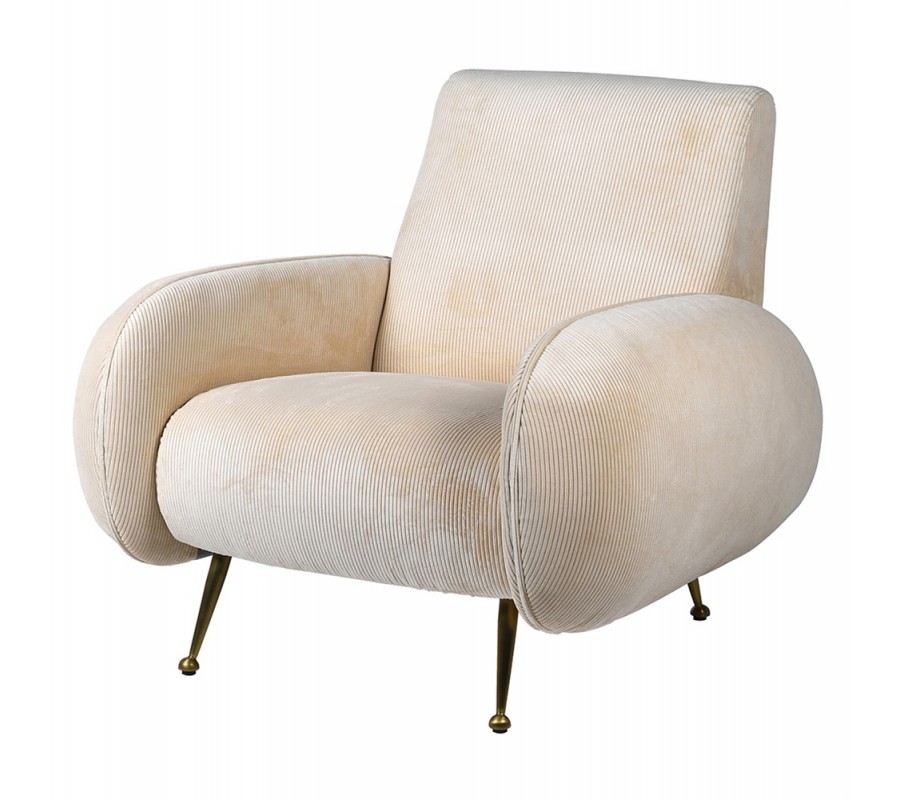 Art deco dizajnové čalúnené kreslo Butter s mohutnými opierkami v krémovej farbe na kovových nožičkách 94cm