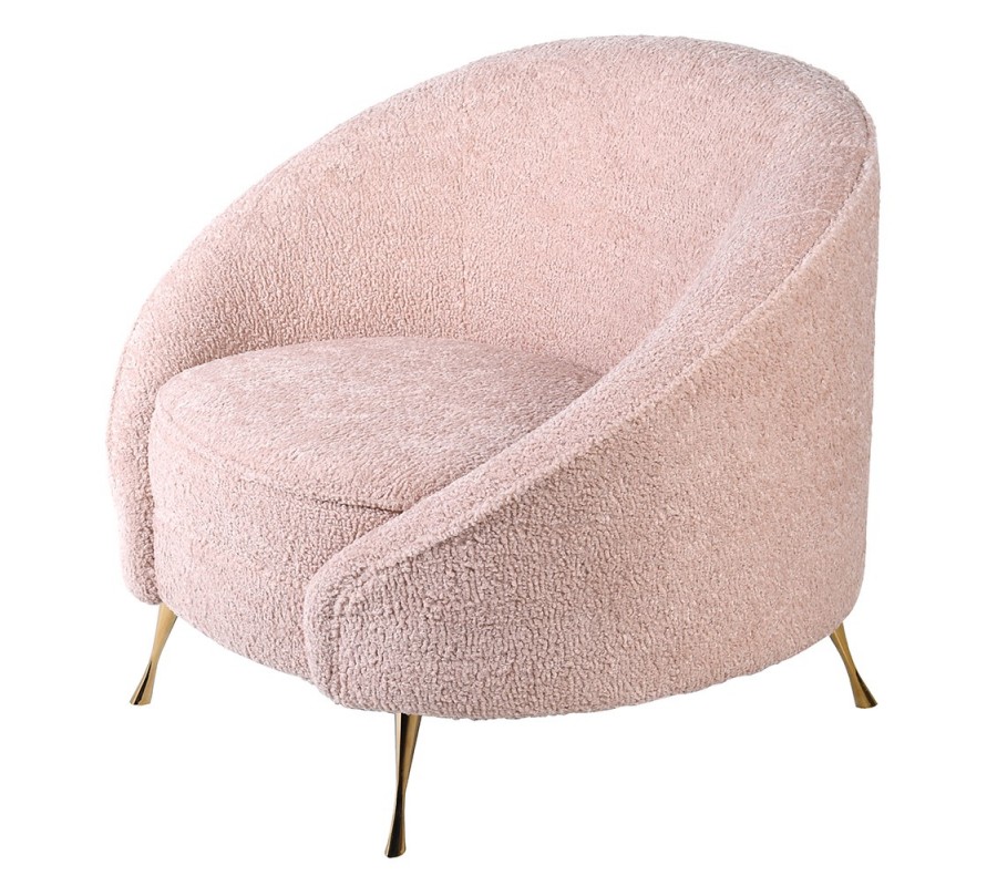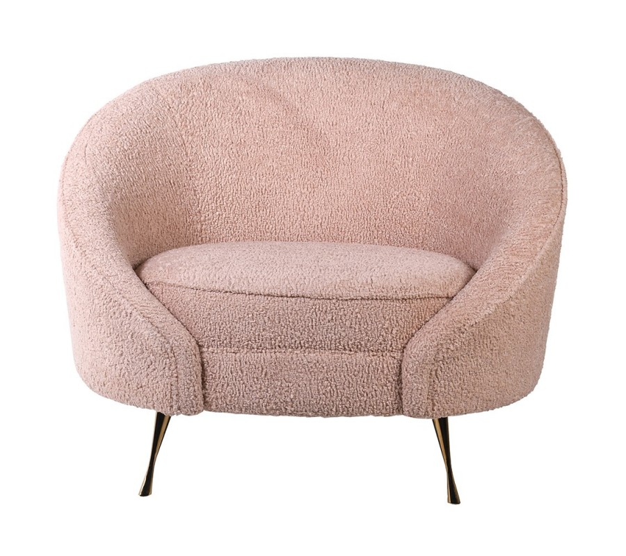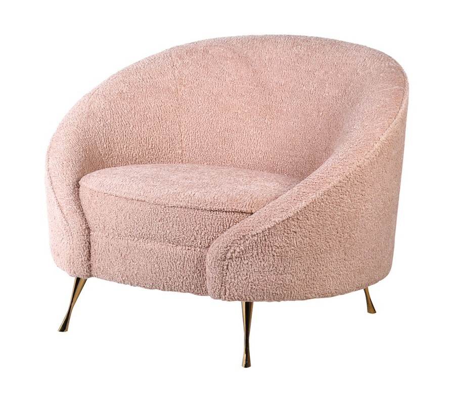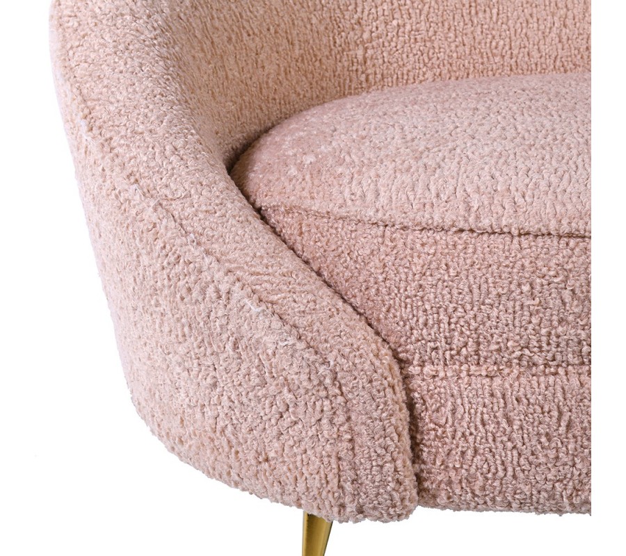 Buklé zaoblené kreslo Blush vo svetlo rúžovom čalúnení s kovovými nožičkami zlatej farby 100cm