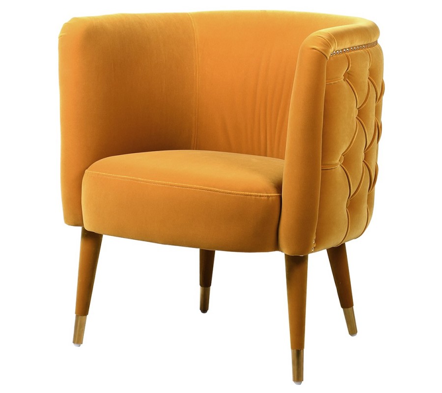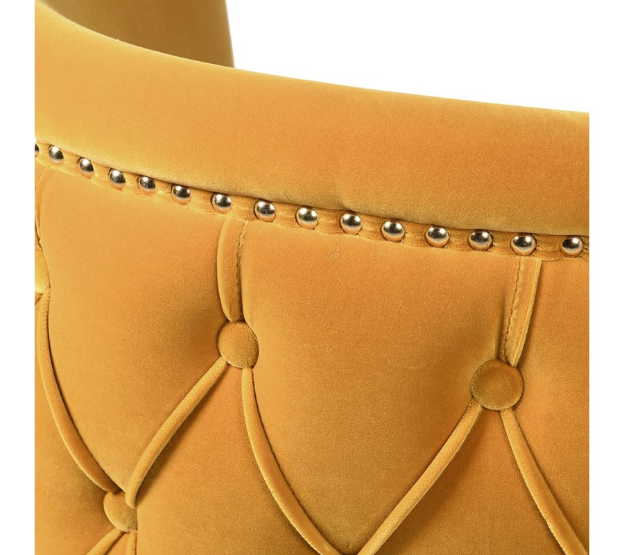 Kreslo Button sa pýši veľmi výrazným a zároveň nádherným dizajnovým prevedením, ktoré sa vo vašej obývačke stane priam magnetom pre oči. Dizajn kresla Button sa nesie v elegantnom prevedení, čomu dosvedčujú bočné opierky v jednej línií so zaoblenou chrbtovou opierkou, prešívanie na štýl Chesterfield z vonkajšej časti opierok, a v neposlednom rade dizajnové cvoky nachádzajúce sa ponad štýlovým prešívaním. Horčicovo žlté zamatové čalúnenie je doplnené o bohato polstrovanú sedaciu časť, ktorá vám prinesie komfort pri sedení. Kreslo Button je postavené na štyroch oranžových kovových nožičkách, pričom zakončenie nožičiek sa nesie v kovovom vyhotovení zlatej farby. Spomenuté zakončenie nožičiek a zlaté prevedenie cvokov umožňuje ľahkú kombinovateľnosť so zlatými dekoráciami a doplnkami, ktoré vyniknú taktiež aj s horčicovo žltým čalúnením.