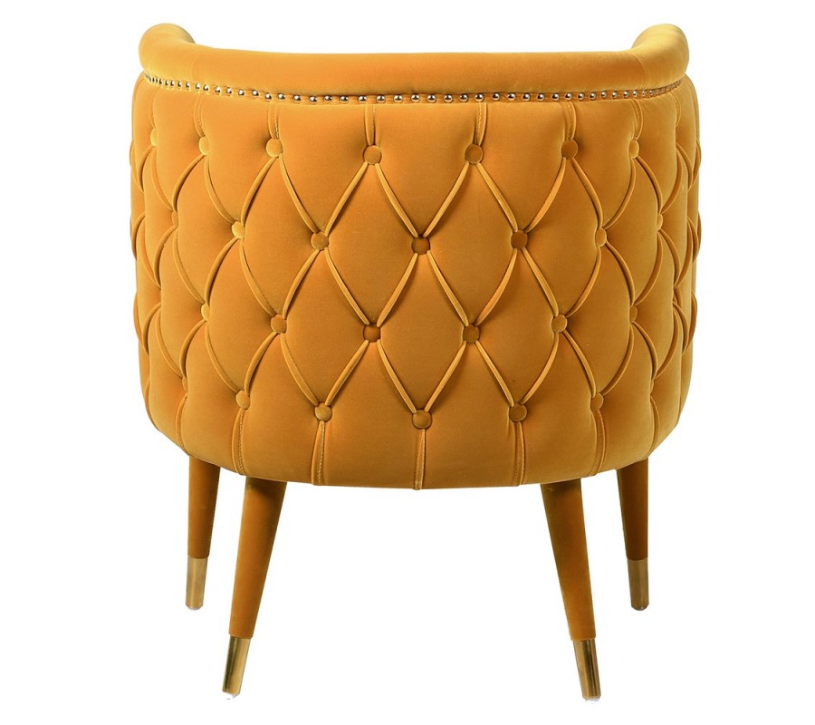 Dizajnové art-deco kreslo Button v horčicovom čalúnení s Chesterfield prešívaním na zadnej časti opierok 78cm