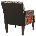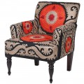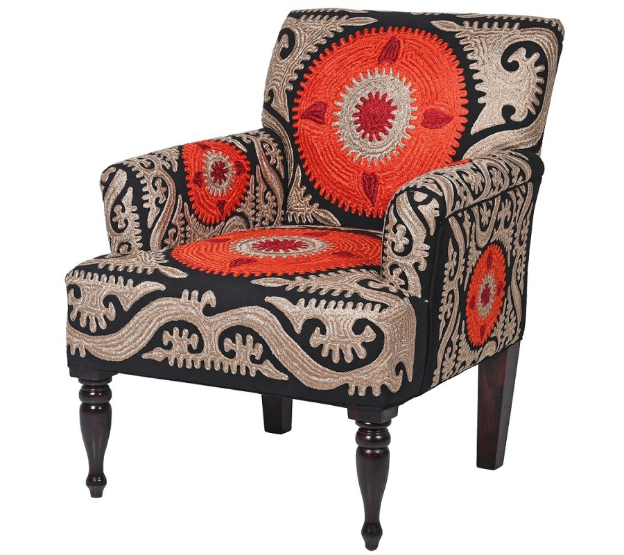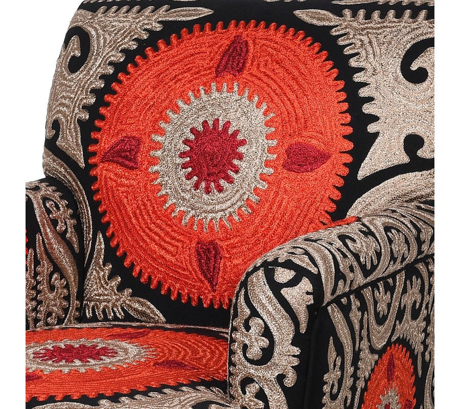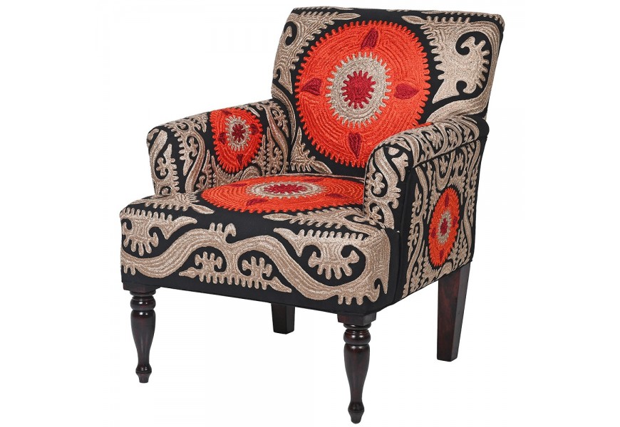 Orientálne čalúnené kreslo Dorkas s tradičnou béžovo-oranžovou crewel výšivkou s čiernou konštrukciou z mangového dreva 88cm