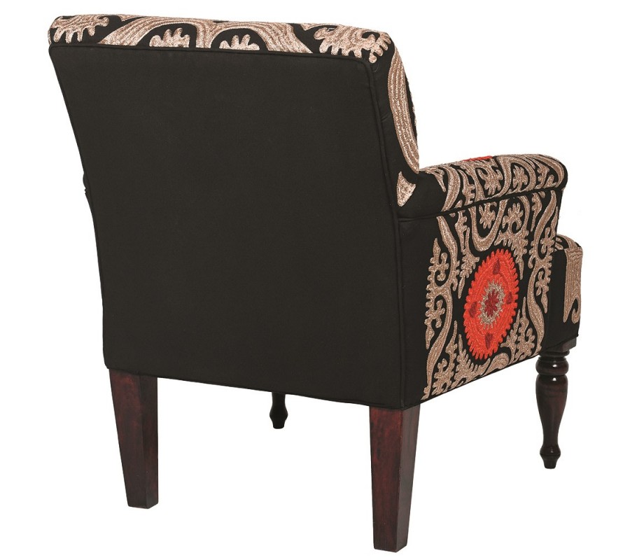 Ak ste milovníkom nábytku, ktorý ma vlastnú unikátnu nepoškvrnenú dušu a nesie so sebou odkaz umeleckých rozmerov- kreslo Dorkas naplní vaše očakávania do poslednej bodky. Okrem kvalitnej drevenej konštrukcie z tropického mangového dreva s čiernou povrchovou úpravou nesie orientálne zdobenie vo forme čalúnenia. Je zdobené crewel výšivkou s históriou siahajúcou až do sedemnásteho storočia, kde sa táto metóda zdobenia využívala s obľubou na vyšívanie závesov či posteľných prestieradiel, populárna bola v mnohých krajínách od Veľkej Británie po Japonsko. Táto metóda je skvelou voľbou pri dekorovaní čalúneného nábytku kvôli rôznorodosti výberu stehov a vlny, ktorá je typickým materiálom používanom pri crewel výšivke. Na kresle Dorkas vyniká krásna sýta oranžová výšivka tlmená neutrálnou béžovou na čiernom podklade. Skvelo sa bude hodiť k orientálnym bohato vyrezávaným komodám či konferenčným stolíkom v etno ladených obývačkách, jedálňach či vstupných halách.