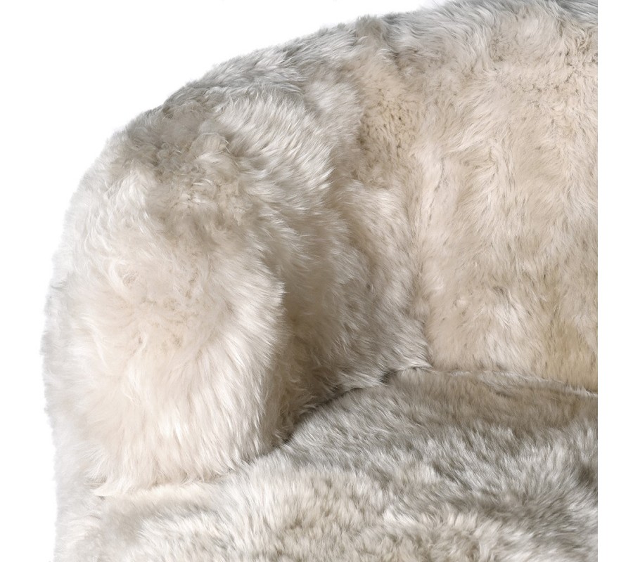 Exkluzívne kreslo Elaine disponuje poťahom vyhotoveným z kvalitnej kožušiny z jahňaťa, čo je jeho nosným dizajnovým prvkom a zaručí vám skutočný luxus a ohúri nejedného hosťa. Na krásnom prirodzenom poťahu sa vynímajú dlhé vlasy príjemnej krémovej farby, ktoré sa pri využívaní jemne vlnia a menia svoj smer i pri letmom dotyku, čo dodáva inak jednoduchému tvaru kresla dynamický nádych. Chrbtová oporná časť kresla je mierne zaoblená a postupne sa transformuje do decentne znížených opierok na ruky a je dostatočne vysoká na podopretie pliec dospelého človeka a poskytnutie dostatočného komfortu. Sedacia časť kresla Stelmaria je vkusného a decentného kruhového tvaru, ktorý je obohnaný opieracími časťami a pri jeho poťahu sa v ňom tak budete cítiť ako v bavlnke. Kreslo Elaine je zasadené na štyroch nežných úzkych nohách zlatej farby, ktoré sa v dolnej časti rozširujú do guľatých útvarov a kreslo tak v miestnosti vizuálne ukotvujú. V rámci vkusných obývačiek, kancelárií či salónov odporúčame kombinovať kreslo Elaine s art deco či glamour nábytkom s detaliami či celým telom zlatej farby. Rovnako tak odporúčame do miestností zaradiť i zrkadlá v širokých ornamentálnych zlatých rámoch, ktoré príjemne opticky miestnosť rozšíria.