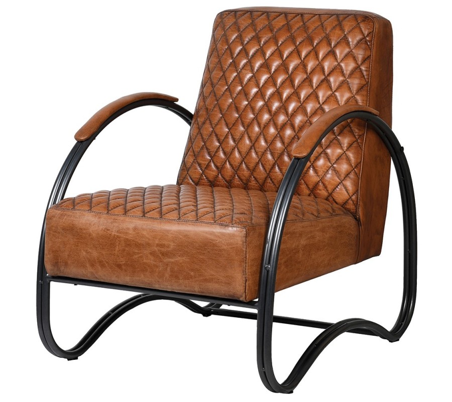 Hnedé kožené kreslo Serhy z pravej kože s čiernou kovovou konštrukciou s retro vzorovaným čalúnením 89cm