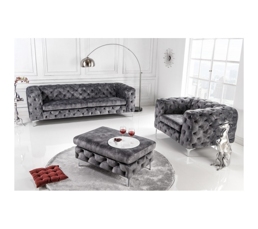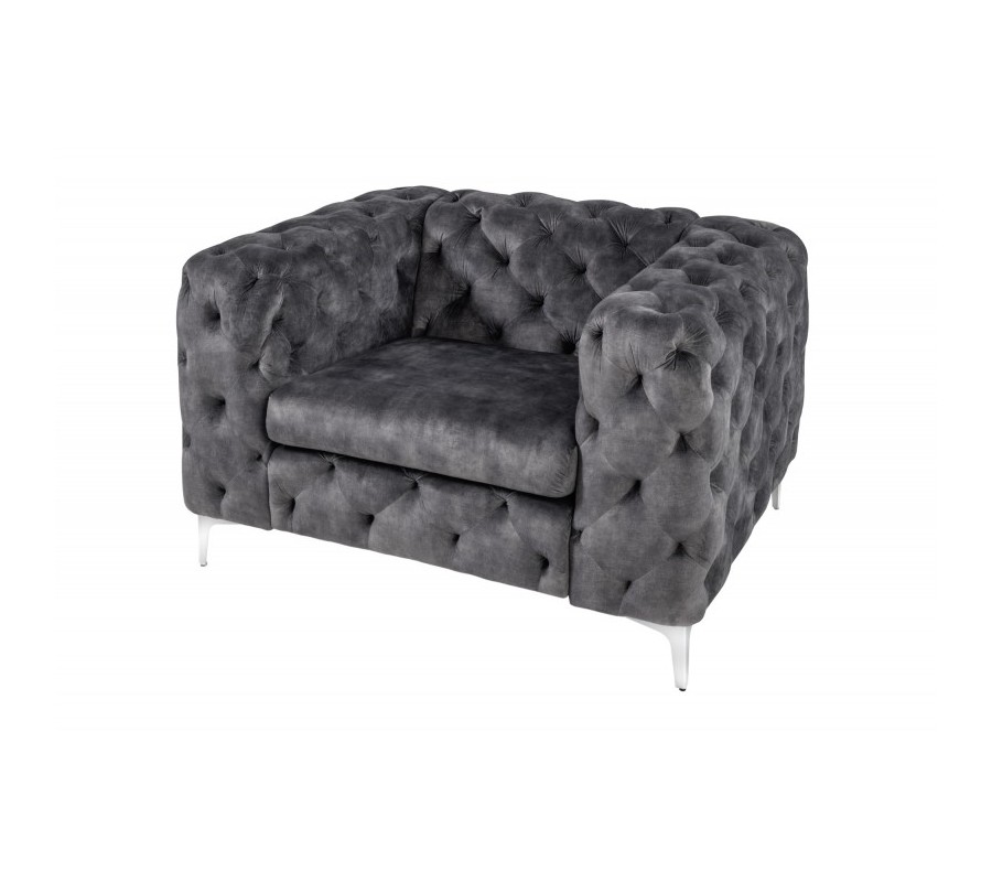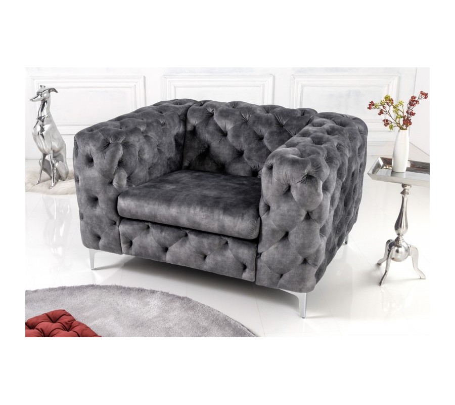 Chesterfield kreslo Modern Barock v glamour štýle so sivým zamatovým čalúnením a striebornými nožičkami 120cm