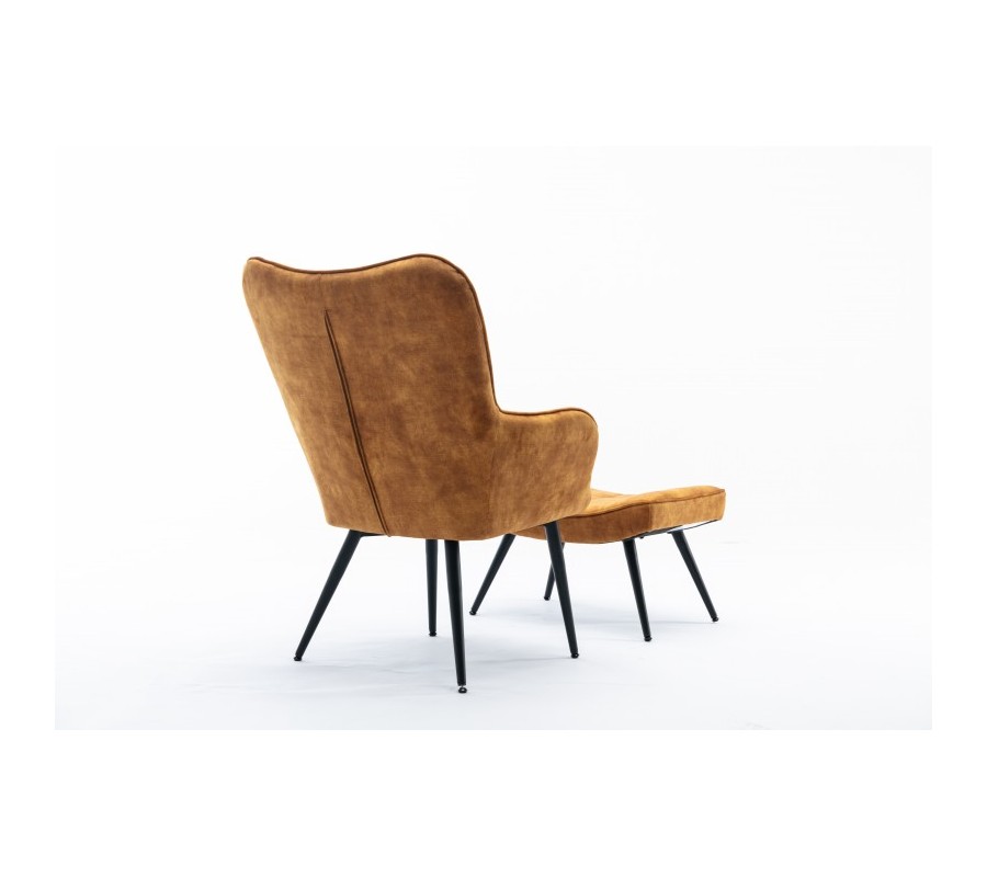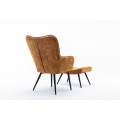 Moderné kreslo Scandinavia s horčicovo žltým čalúnením a s čiernymi kovovými nohami 99cm