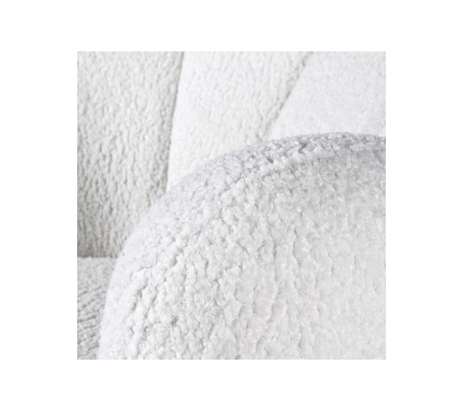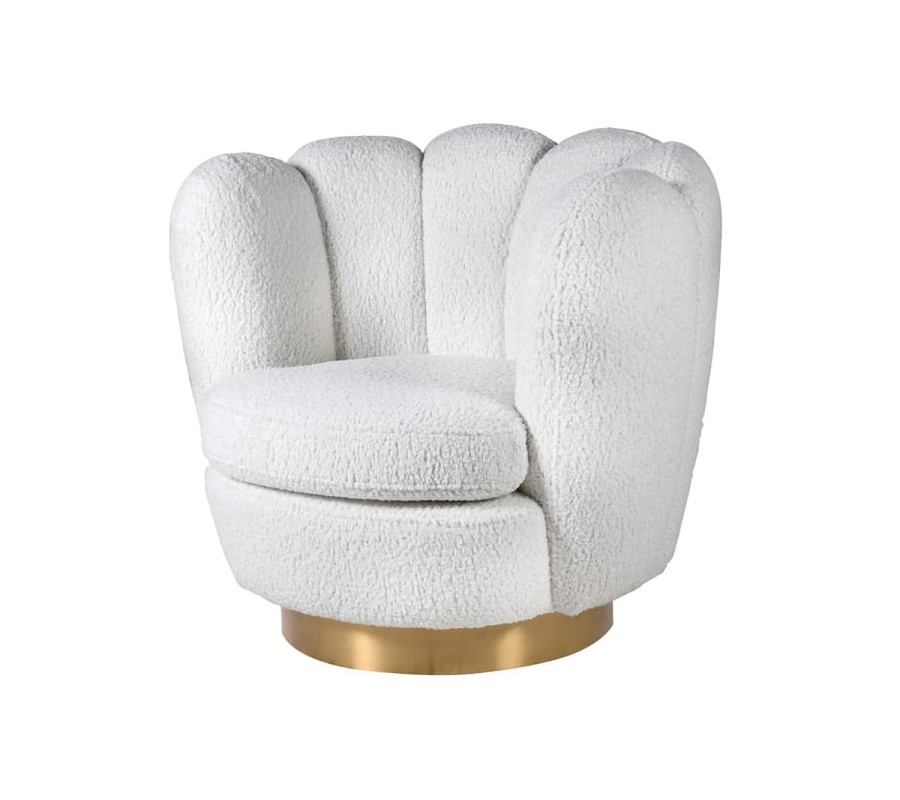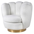 Exkluzívne kreslo Seashell vás prenesie do opulentných glamour víl z dvadsiateho storočia. Vo vašom interiéri navnadí nezameniteľný art deco vzhľad a spestrí priestory nejednej obývačky, hosťovskej izby či dizajnové priestory tématicky ladených kaviarní či beauty salónov. Kreslo Seashell zaujme predovšetkým svojím lastúrovitým tvarom, ktorý okrem štýlového vzhľadu zabezpečuje aj dokonalé pohodlie. K vášmu komfortu prispeje aj mäkké čalúnenie z tkaniny buklé, ktorá sa vyznačuje svojím vlneným vzhľadom a jemnosťou. Biela farba je univerzálna a zároveň nádherne a elegantne presvetlí aj tmavšie priestory. Art deco štýl kresla umocňuje okrúhla zlatá podstava z kovu. Kombináciou s kovovým či skleneným art deco nábytkom dosiahnete štýlový glamour vzhľad, ktorý vašu obývačku nádherne spestrí a oživí! Výška sedenia 45cm.