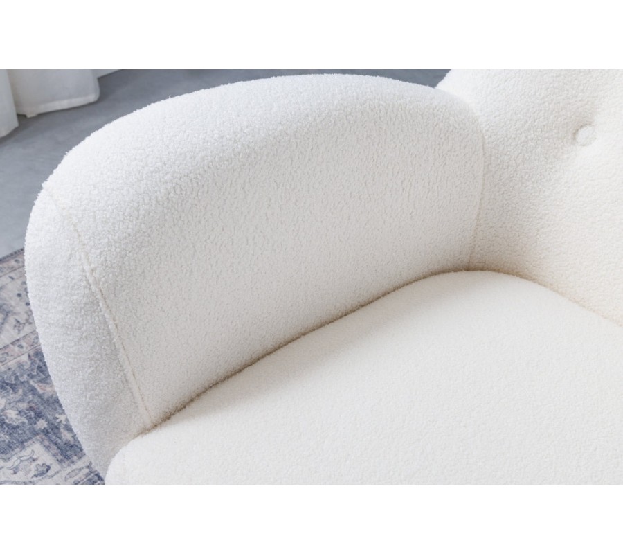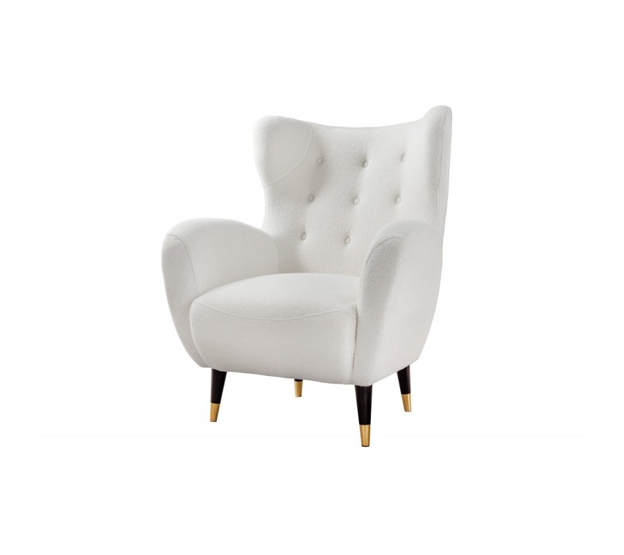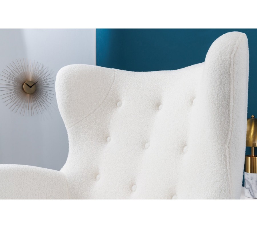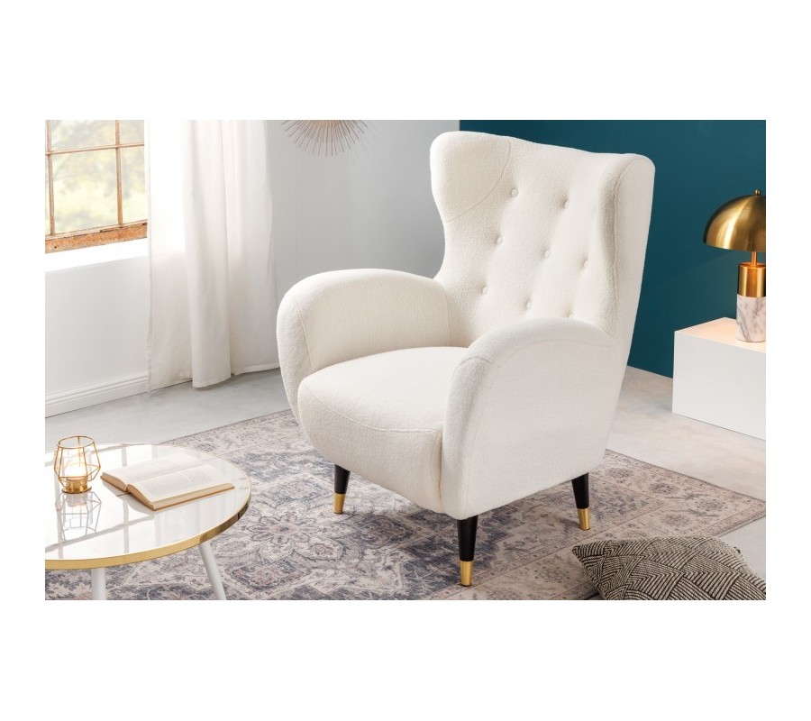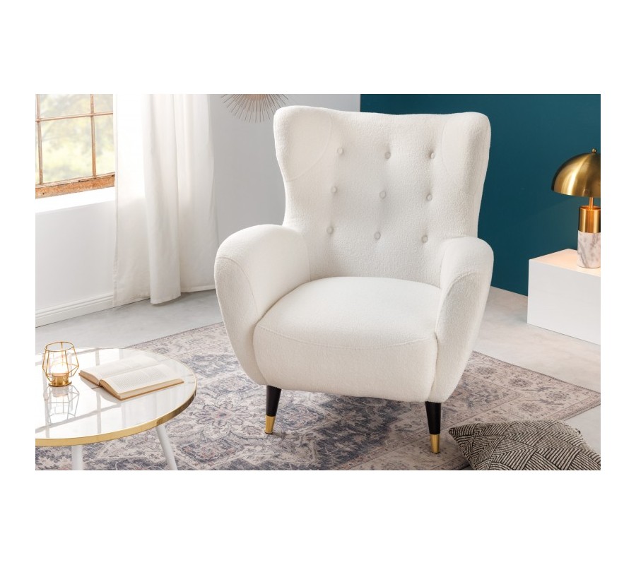 Štýlové kreslo Bolte je elegantným a pohodlným kúskom ideálnym na spestrenie moderných obývačiek. Príjemné mäkké čalúnenie z buklé materiálu sa nesie v krémovej bielej farbe, čím vzniká vkusný a estetický vzhľad. Buklé tkanina sa zároveň vďaka svojej mäkkosti postará o váš dokonalý komfort. Dopomôže k nemu aj pohodlné vysoké operadlo doplnené o vkusné gombíky a praktické podrúčky. Biele čalúnenie kontrastne dopĺňajú čierne nožičky z kovu s jemnými zlatými prvkami v spodnej časti, ktoré dodávajú kreslu elegantný glamour nádych. Celkový dizajn kresla Bolte si vás okrem modernách materiálov a nadčasovej farebnosti získa svojimi elegantnými zaoblenými líniami a vkusným nadčasovým nádychom. Kreslo sa dá vynikajúco kombinovať s výraznými tmavými farbami, čím vznikne moderný kontrast, a rovnako tiež s doplnkami z kovu či skla. Okrem obývačiek vkusne doplní aj priestory hotelov, dizajnových kaviarní či beauty salónov.