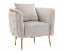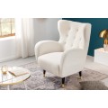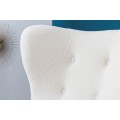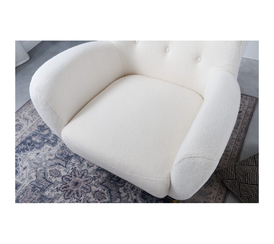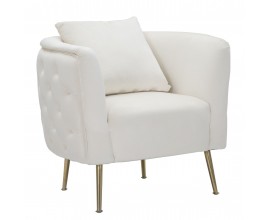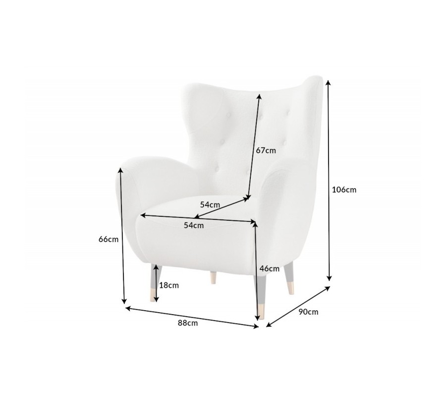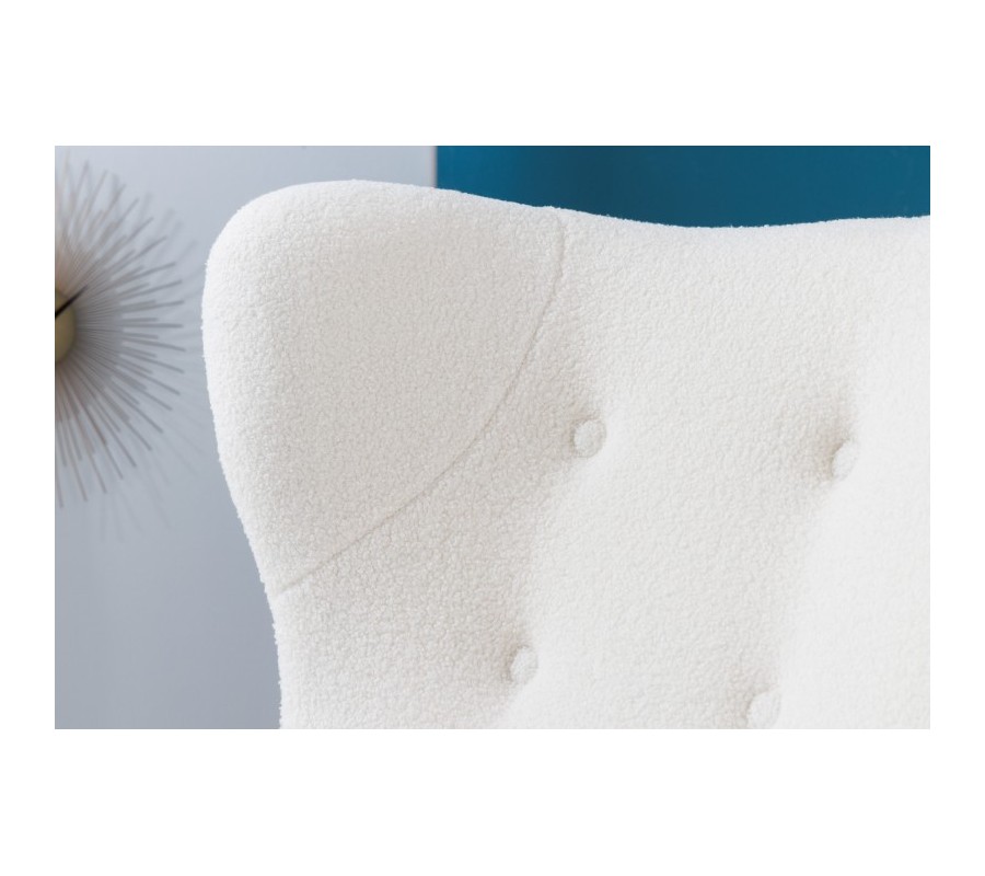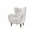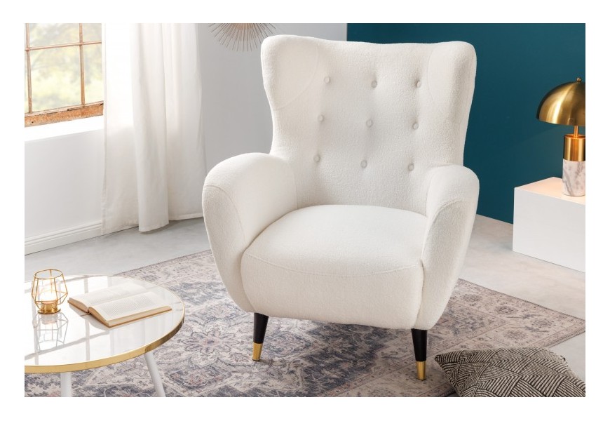 Štýlové kreslo Bolte je elegantným a pohodlným kúskom ideálnym na spestrenie moderných obývačiek. Príjemné mäkké čalúnenie z buklé materiálu sa nesie v krémovej bielej farbe, čím vzniká vkusný a estetický vzhľad. Buklé tkanina sa zároveň vďaka svojej mäkkosti postará o váš dokonalý komfort. Dopomôže k nemu aj pohodlné vysoké operadlo doplnené o vkusné gombíky a praktické podrúčky. Biele čalúnenie kontrastne dopĺňajú čierne nožičky z kovu s jemnými zlatými prvkami v spodnej časti, ktoré dodávajú kreslu elegantný glamour nádych. Celkový dizajn kresla Bolte si vás okrem modernách materiálov a nadčasovej farebnosti získa svojimi elegantnými zaoblenými líniami a vkusným nadčasovým nádychom. Kreslo sa dá vynikajúco kombinovať s výraznými tmavými farbami, čím vznikne moderný kontrast, a rovnako tiež s doplnkami z kovu či skla. Okrem obývačiek vkusne doplní aj priestory hotelov, dizajnových kaviarní či beauty salónov.
