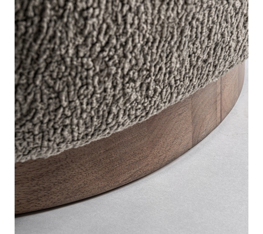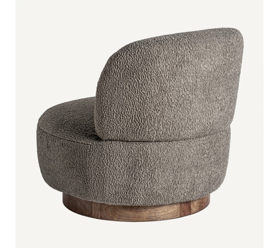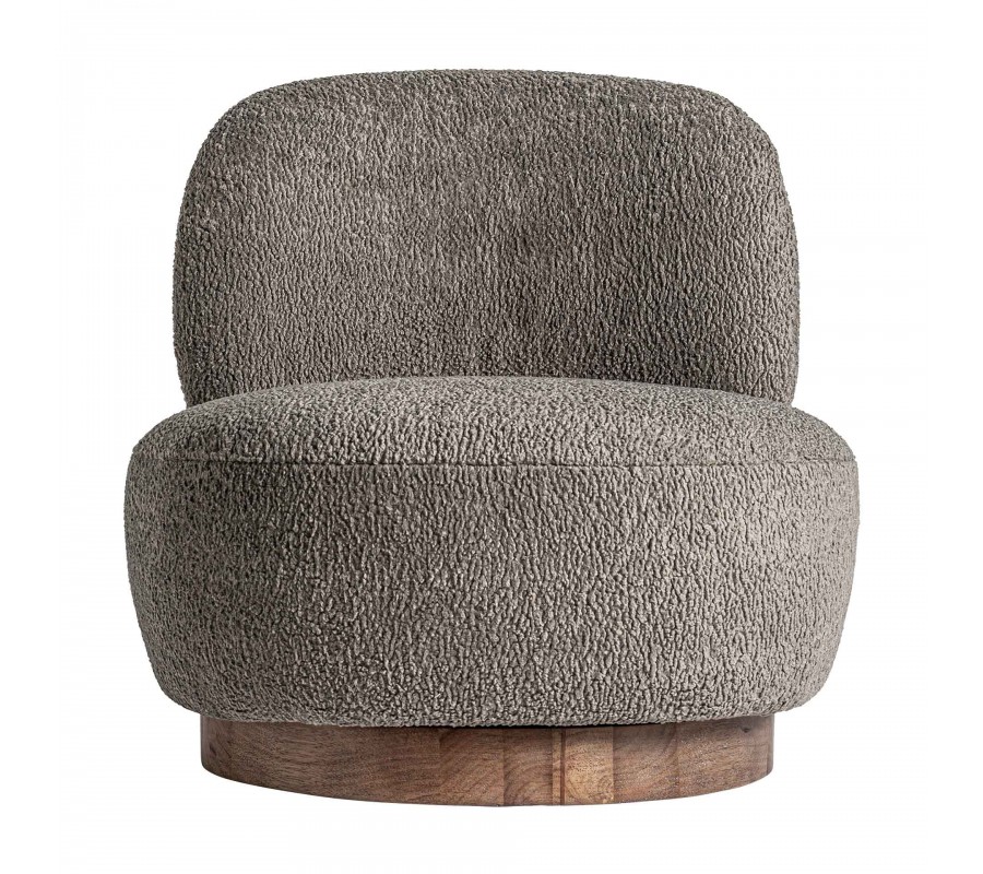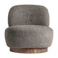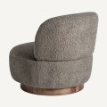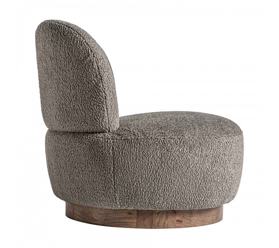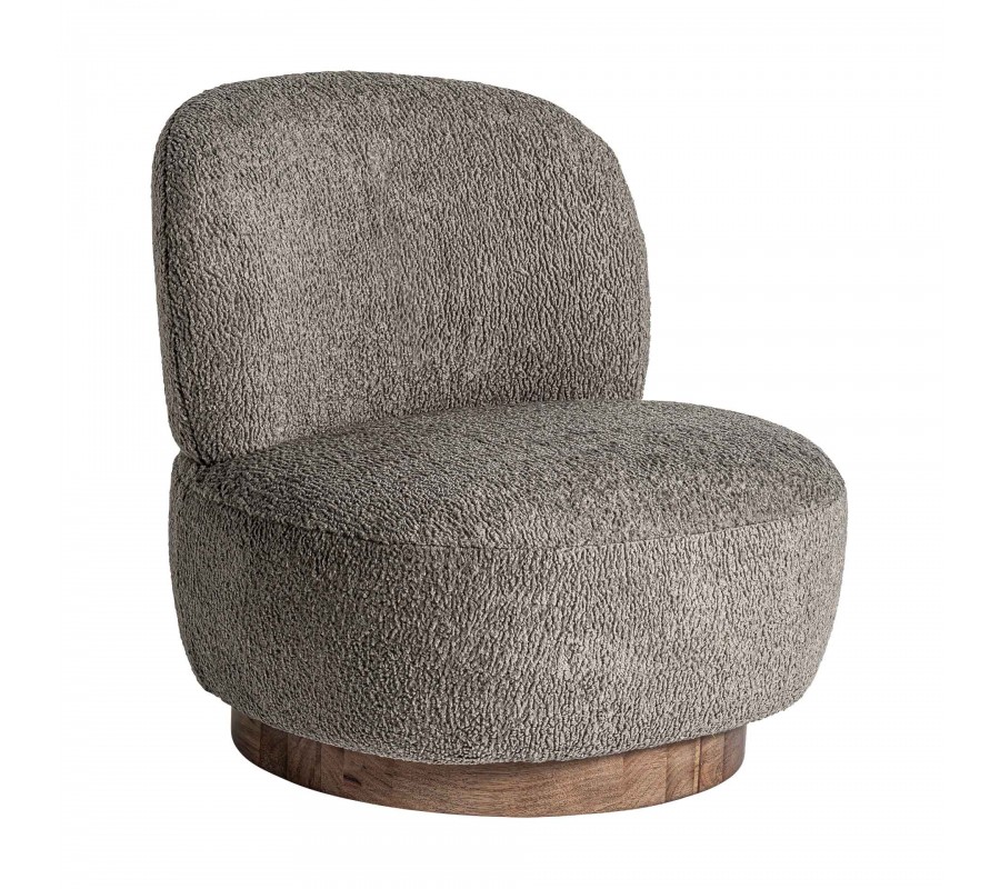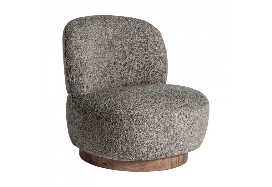 Moderné buklé kreslo Aurelia sivej farby s kruhovou hnedou podstavou z masívneho dreva 80cm