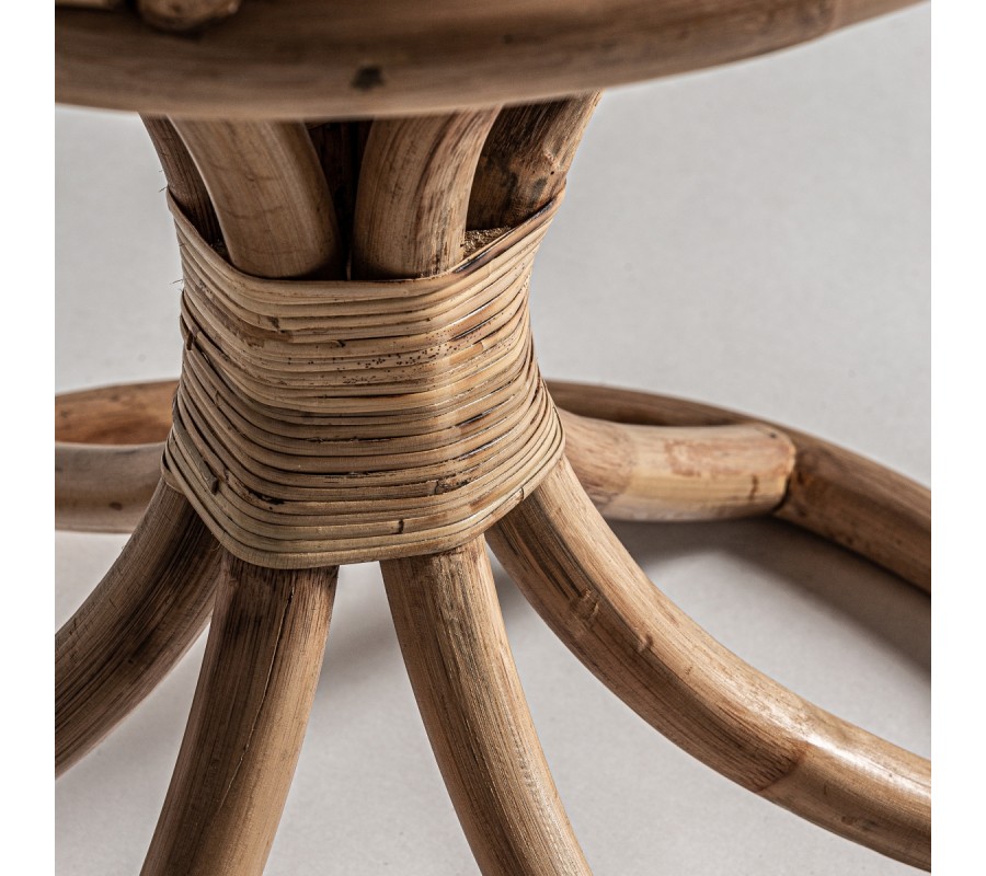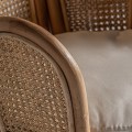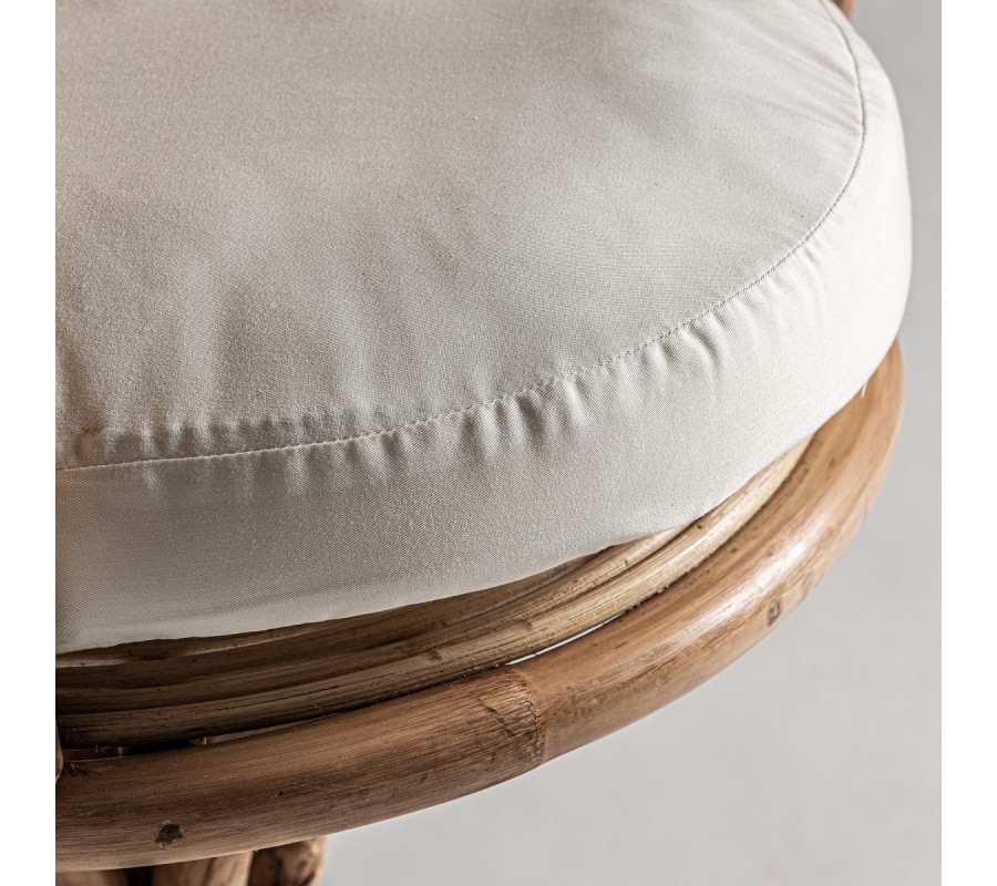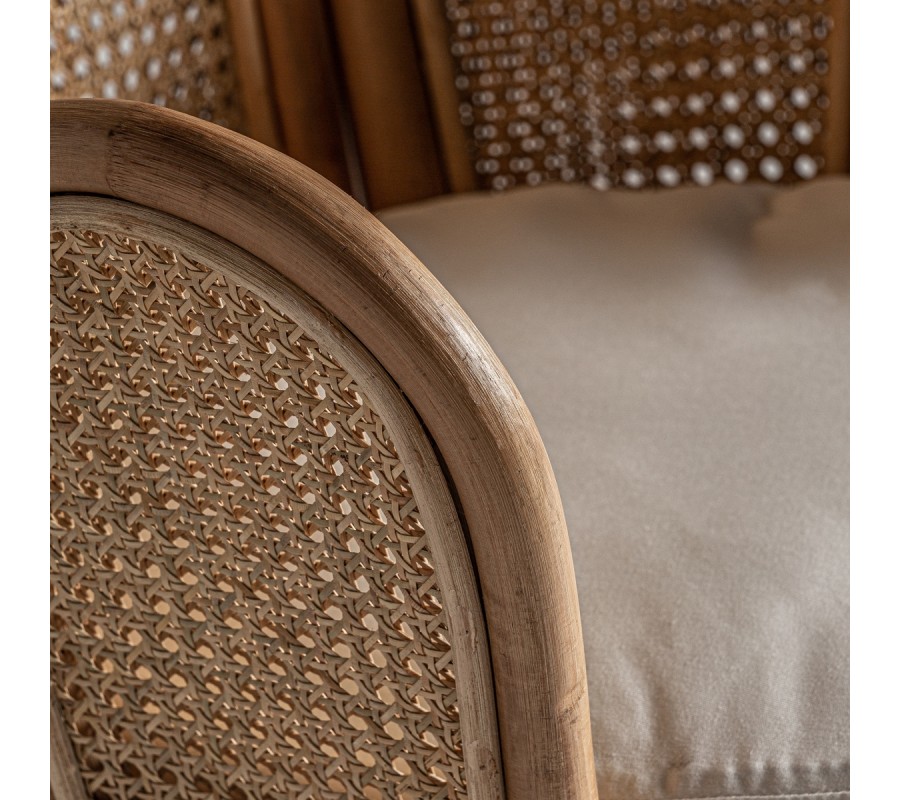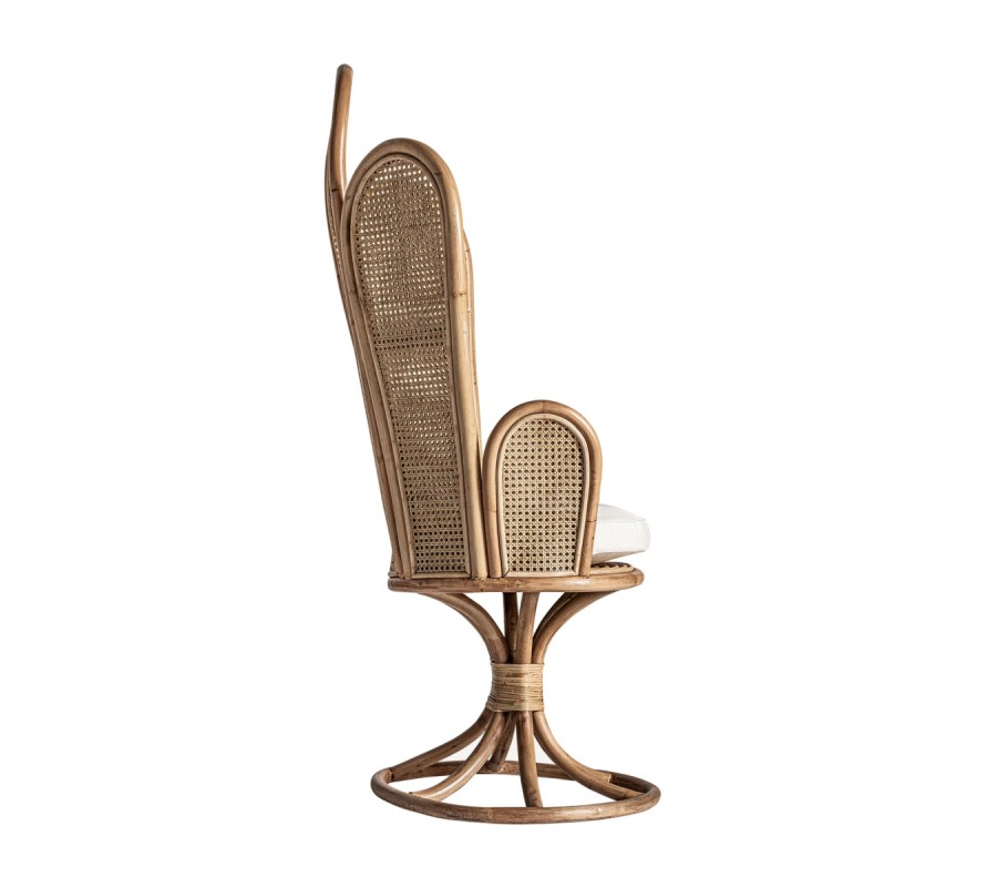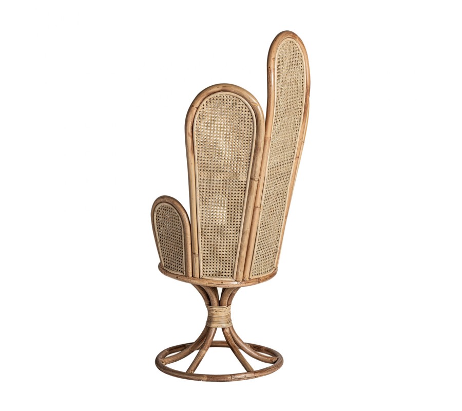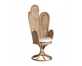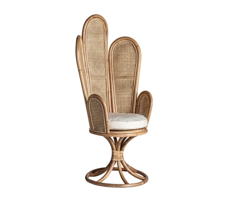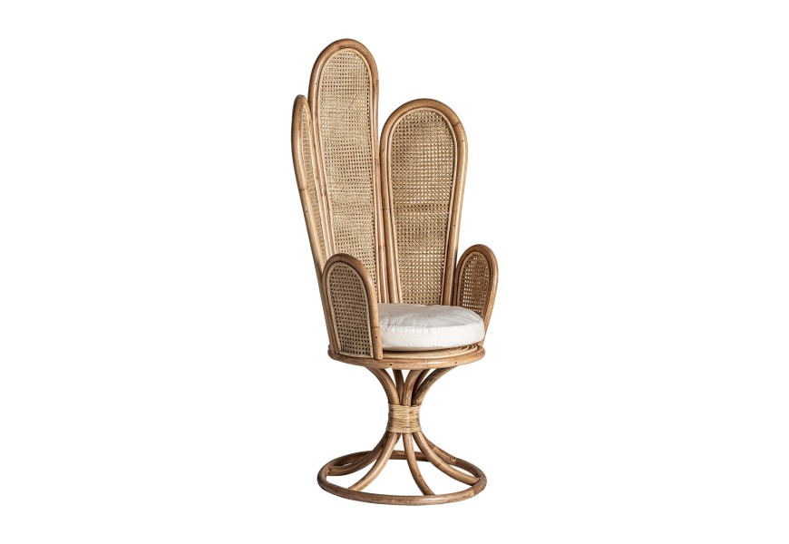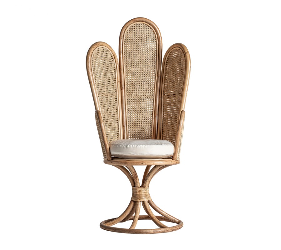 Neštandardný interiérový doplnok v podobe kresla Ryah zaujme už na prvý pohľad. Špecifickým je najmä vďaka svojmu vysokému operadlu pozostávajúcemu z jednotlivých poloblúkovitých častí vyplnených ratanovým výpletom, čím vzniká jedinečný tvar pripomínajúci lastúru. Celá konštrukcia kresla Ryah je vyrobený z ratanového dreva v prírodnej svetlohnedej farbe. Operadlo dopĺňajú tiež praktické podrúčky a okrúhla sedacia časť s príjemným vankúšikom v bielej farbe. Kreslo tak zabezpečuje nielen dizajnový estetický vzhľad, ale aj nadštandartný komfort. Vďaka prírodnému materiálu aj farbe je kreslo Ryah vhodné predovšetkým na doplnenie etno či vidiecky ladených interiérov. Okrem súkromných priestorov obývačiek môže skvelo doplniť aj hotelové či kaviarenské priestory. Kreslo Ryah odporúčame kombinovať s masívnym nábytkom a doplnkami v naturálnych odtieňoch.