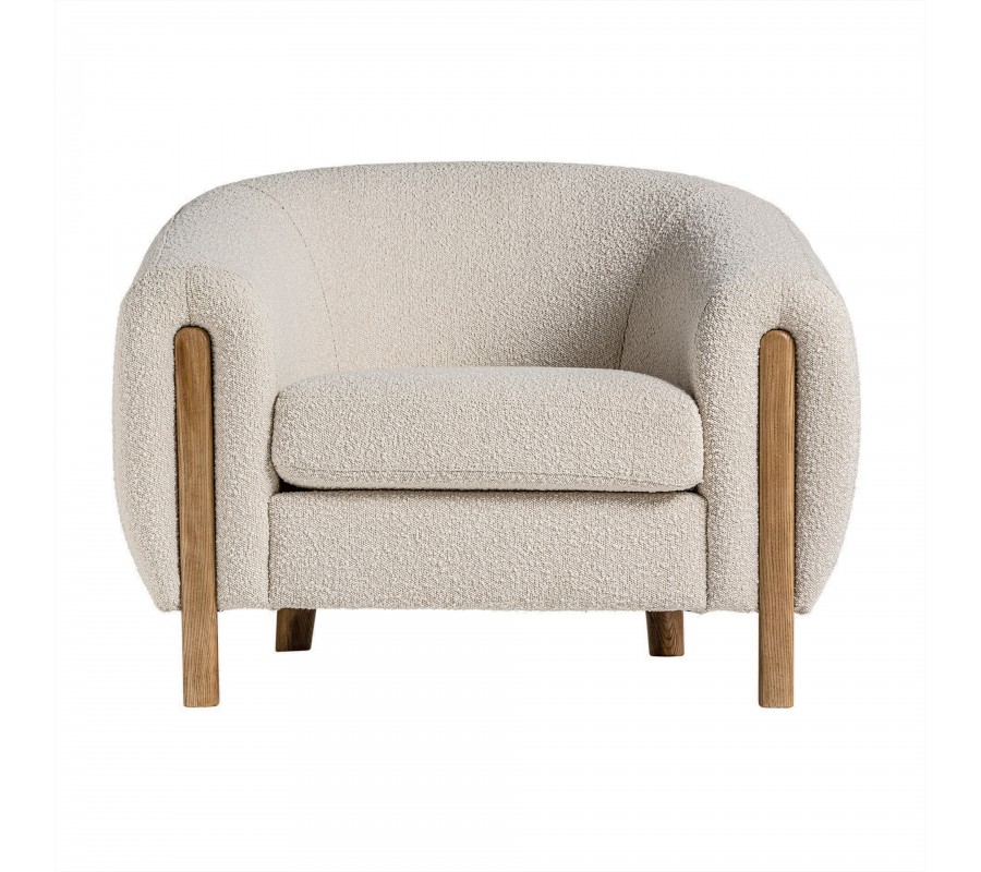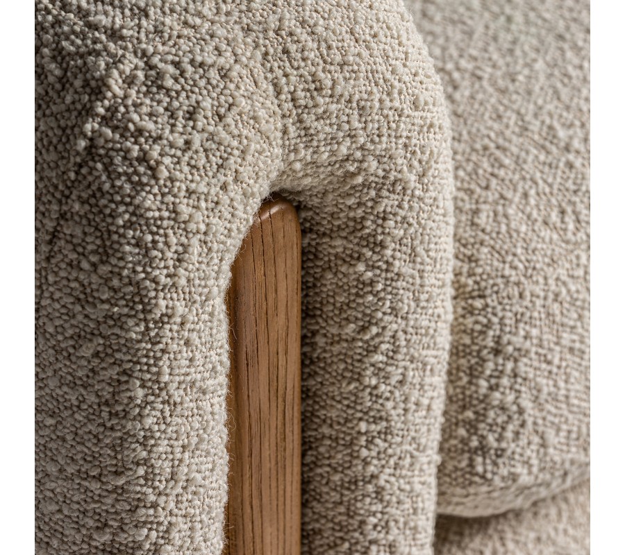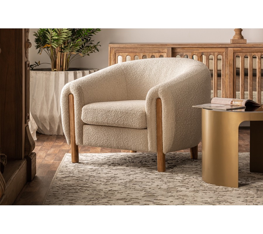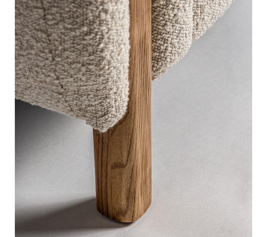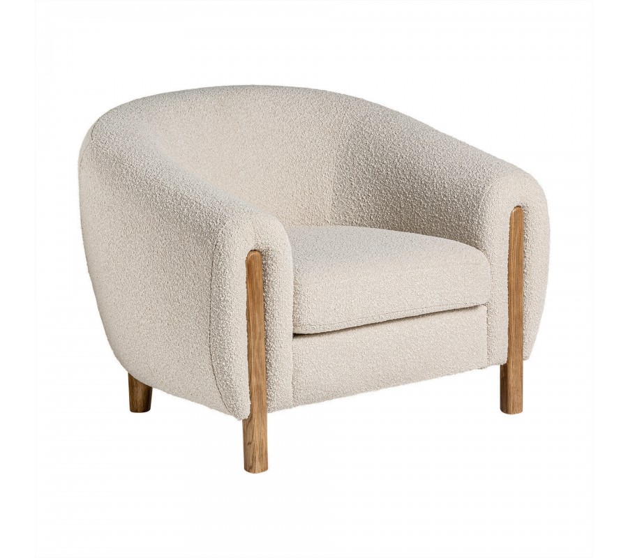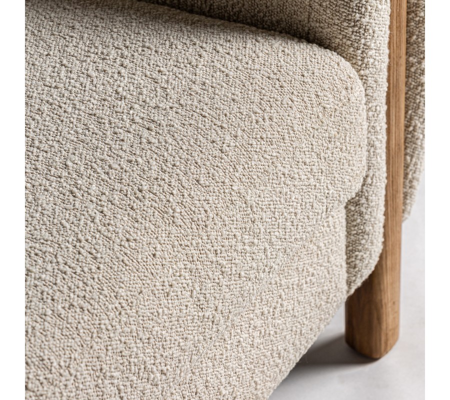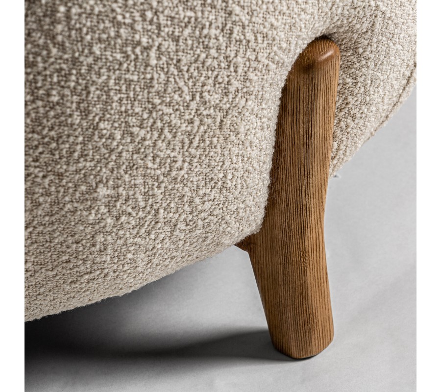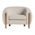 Dizajnové moderné kreslo Aurelia je kúskom, ktorý spája kvalitné vyhotovenie a komfortný sed, aby Vám prinieslo maximálny pôžitok zo sedenia vo Vašej luxusnej obývačke. Základ kresla Aurelia tvorí trvácne dubové masívne drevo v prírodne hnedej farbe, ktoré v prednej časti bočných opierok krásne vyčnieva aby Vám ukázalo svoj povrch s viditeľnou kresbou dreva. Dizajnu kresla dominuje príjemné, krémovo biele čalúnenie v štýle bouclé z bavlny. Jemne zaoblený tvar chrbtovej opierky a bohaté polstrovanie komfortného podsedáku zaručí pohodlné sedenie, ktoré Vás donúti leňošiť celé dni. Komfortná stránka v neposlednom rade disponuje praktickými bočnými opierkami, nesúcimi sa v jednej línií s chrbtovou opierkou. Luxusné buklé kreslo Aurelia odporúčame kombinovať v moderných a art-deco ladených interiéroch s hnedým masívnym nábytkom, krémovými kobercami, sedačkami, a taktiež s modernými dekoráciami.