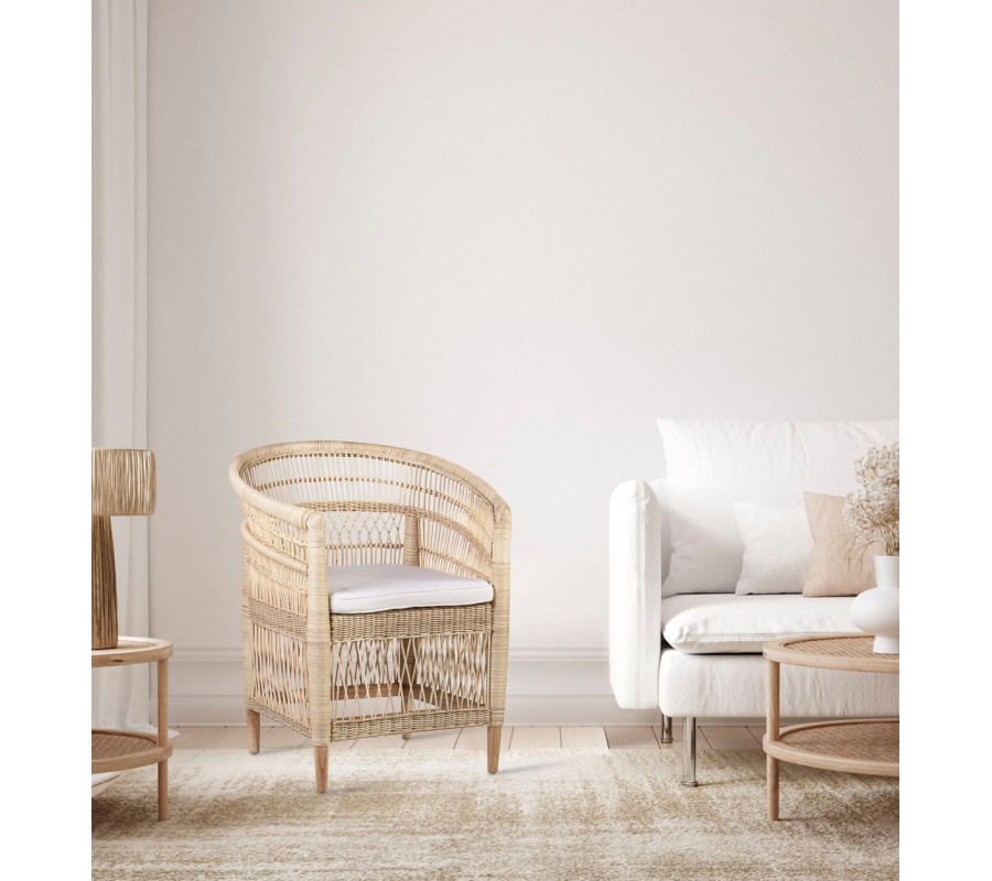 Ratanové štýlové kreslo Toreno so zaobleným operadlom, svetlohnedým výpletom a bielym vankúšom 84cm
