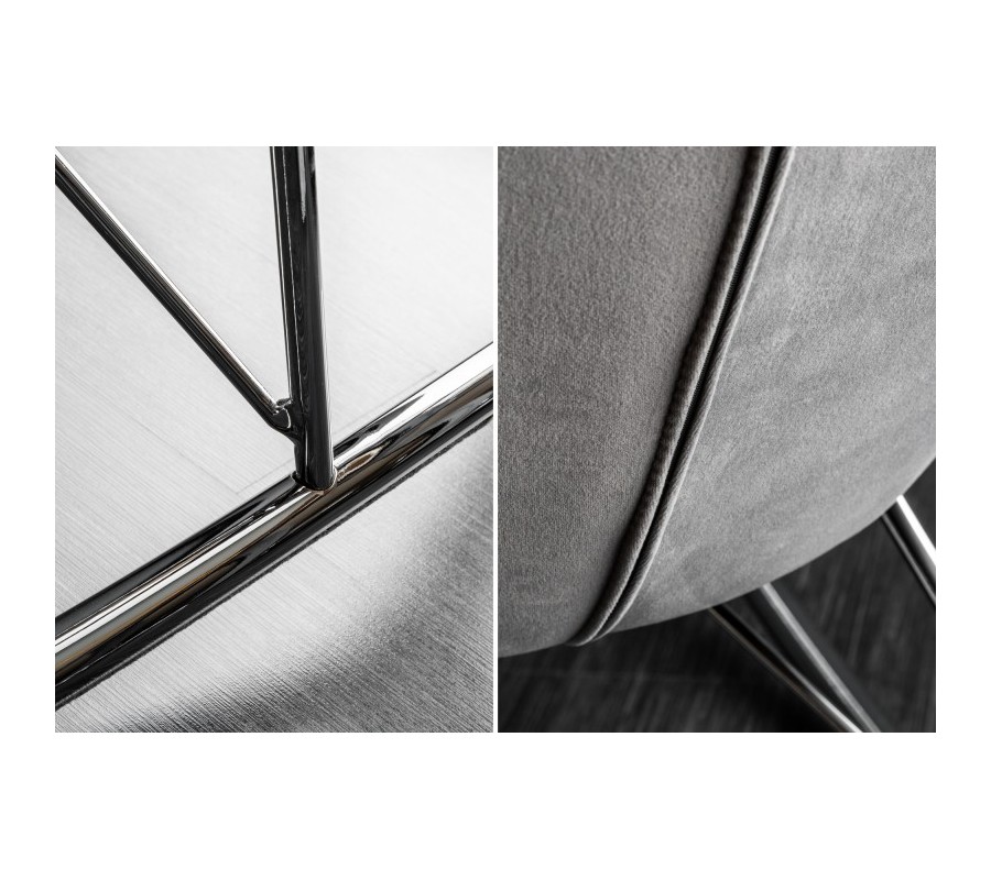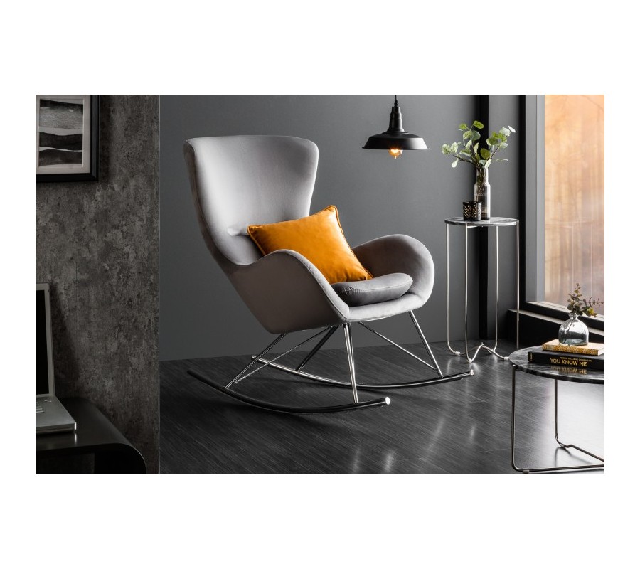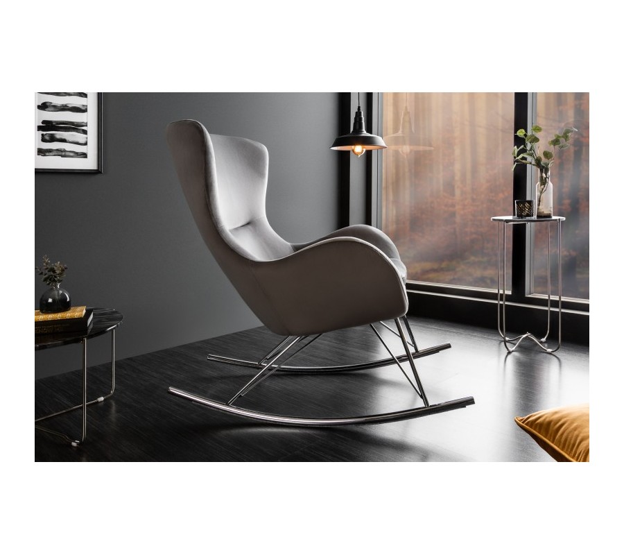 Dizajnové škandinávske hojdacie kreslo Foamin so sivým zamatovým čalúnením a s chrómovou konštrukciou 99cm