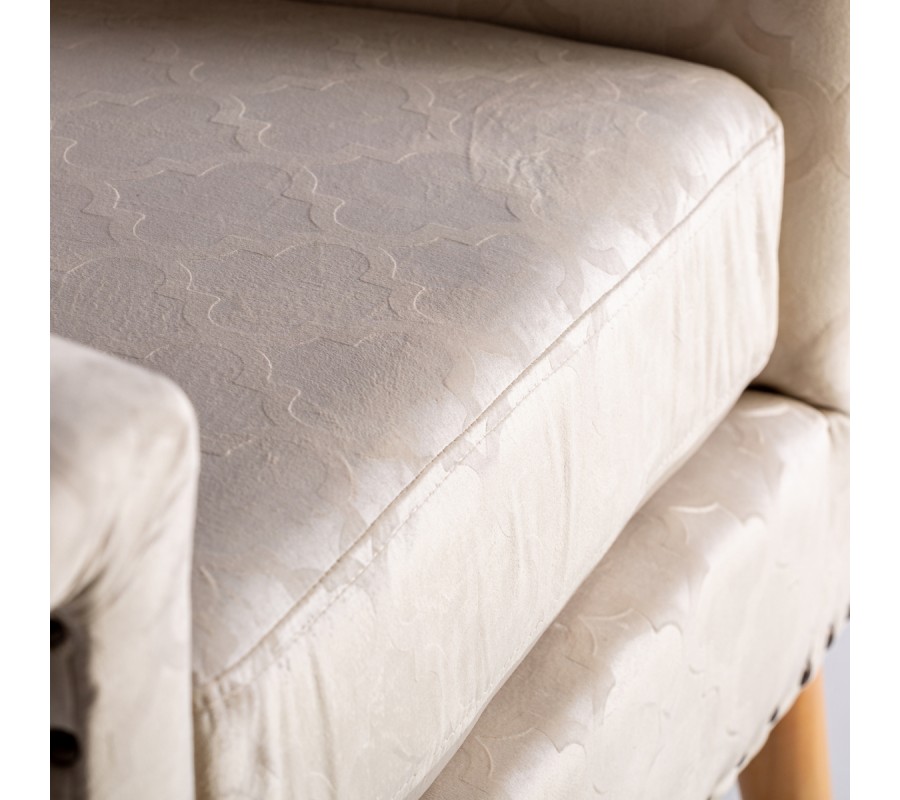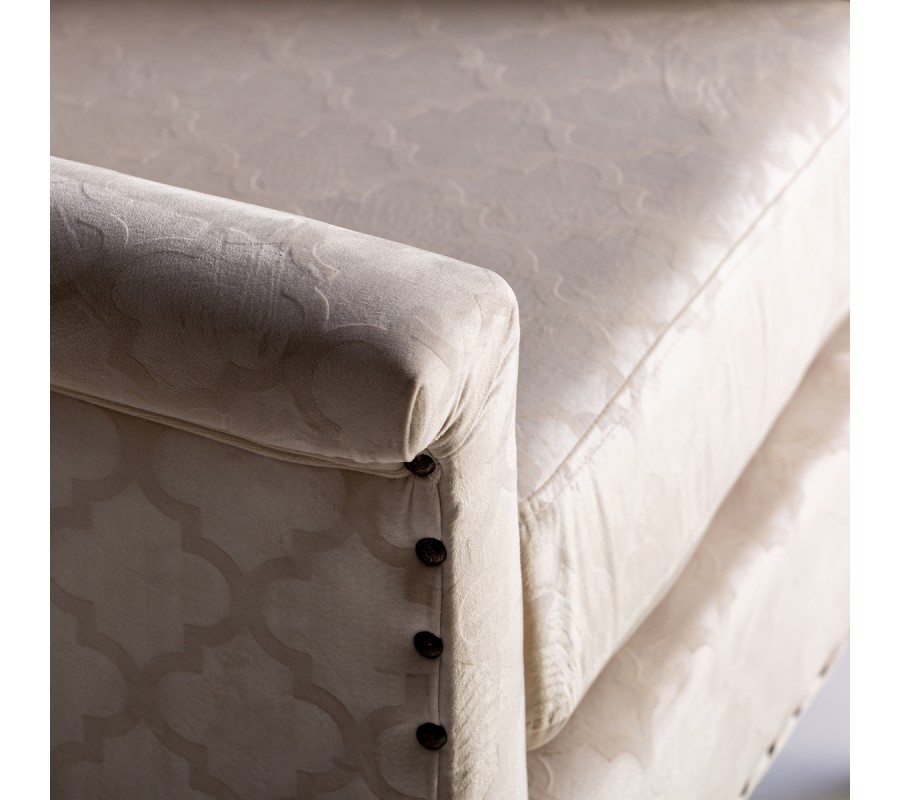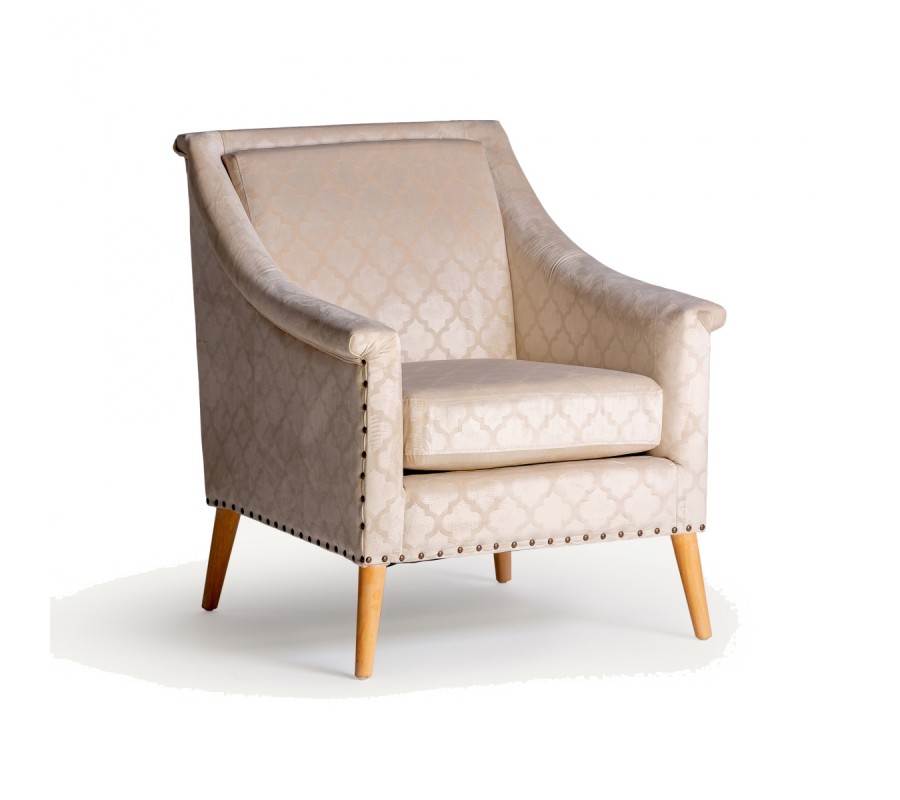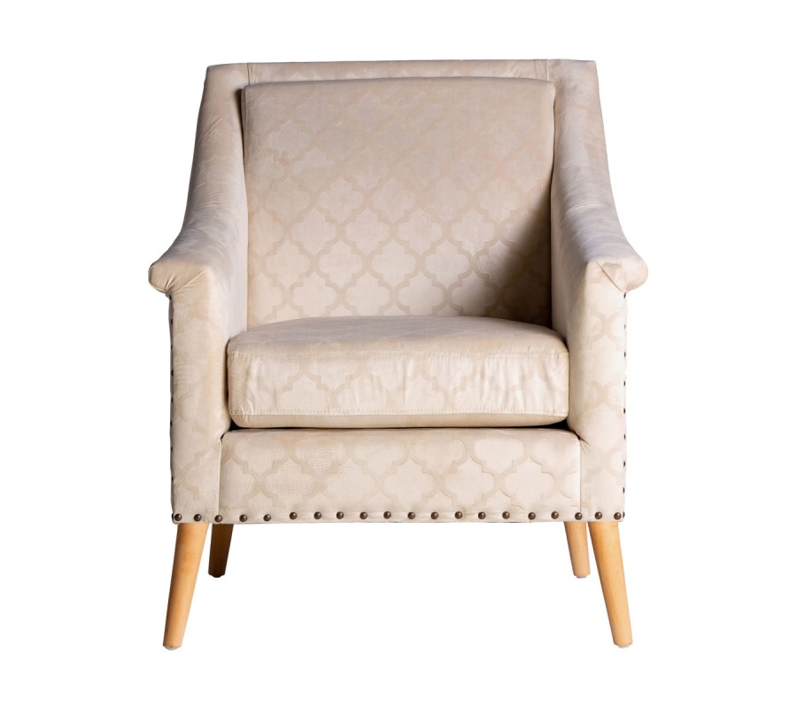 Jedinečné kreslo Perugia si váz získa svojím dizajnom prepájajúcim prvky klasického a vintage štýlu. Ak si túžite svoj interiér doplniť o pohodlný a zároveň estetický kúsok nábytku, môže byť tou správnou voľbou pre vás! kreslo nádherne zapadne do vintage i klasicky ladených obývačiek v kombinácii s masívnym nábytkom. Vznikne tak unikátny luxusný efekt a zároveň elegancia kresla vaše priestory príjemne zútulní. Kreslo Perugia disponuje príjemným látkovým čalúnením v svetlej béžovje farbe, pričom celý poťah zároveň zdobí jemná dekoratívna potlač. Lesklé prevedenie poťahovej látky vytvára luxusný nádych, ktorý umocňuje kovové vybíjané zdobenie na spodnom leme. Dokonalé pohodlie vám zaručí mäkká sedacia časť, jemne tvarované operadlo a podrúčky. V kresle Perugia si tak môžete dopriať dokonalý oddych a relax po dlhom pracovnom dni, šálku čajú s priateľmi či dobrou knihou! K vynikajúcej stabilite a praktickejšej manipulácii tiež dopomáhajú drevené nožičky v prírodnej hnedej farbe. Doplňte si kreslom Perugia svoju obývačku, ale i kancelárske, hotelové či kaviarenské priestory, a obohaťte ich o unikátny nádych luxusného klasického štýlu!