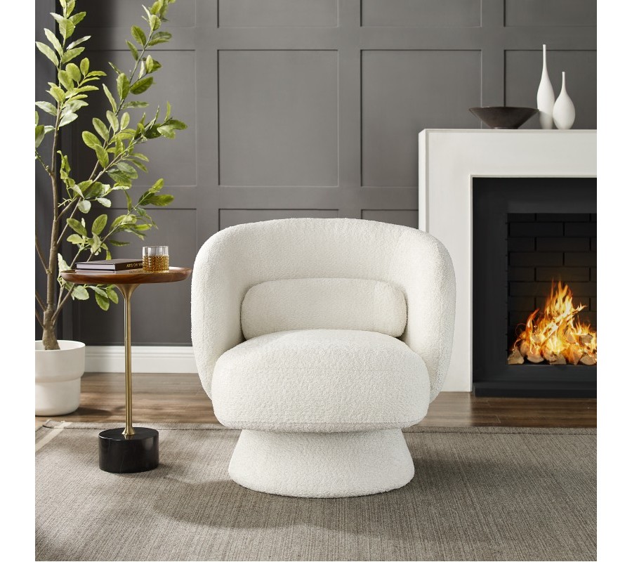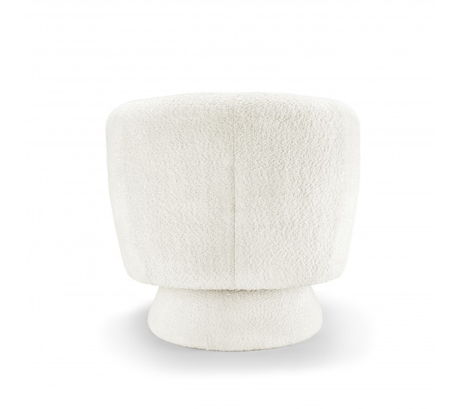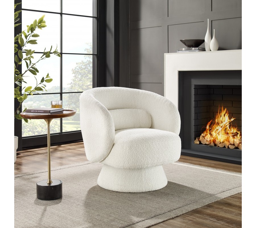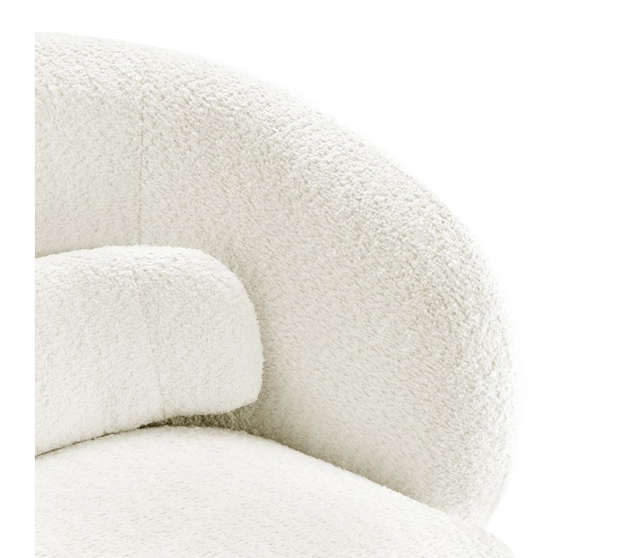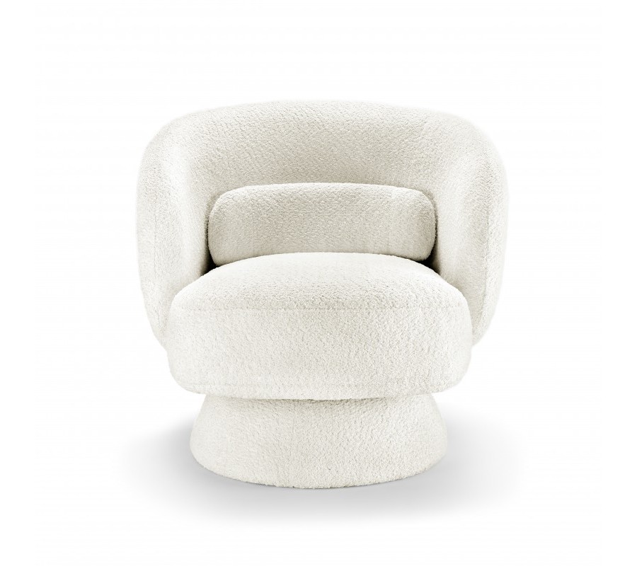 Dizajnové kreslo Elain zaujme svojím okrúhlym tvarom, čistým elegantným vzhľadom a príjemným poťahom. Vo svojom dizajne spája prvky moderného štýlu s materiálom buklé, ktorý predstavuje klasiku a stálicu v interiérovom dizajne. Buklé materiály sa dnes opäť vracajú do módy a spojenie s moderným dizajnom je tak skutočne pútavým a vkusne doplní i minimalistickejšie ladené priestory. Jemný a mäkký povrch kresla vám spríjemní sedenie rovnako ako aj zaoblený tvar operadla doplnený vankúšikom. Poťahom disponuje celá konštrukcia kresla vrátane podstavy, čím vzniká zaujímavý jednotný a čistý vzhľad. Vďaka bielej farbe nebudete mať problém kreslo Elain doplniť do vašich priestorov, či už sú zariadené monochromaticky, v prírodných alebo vo výraznejších farebných odtieňoch. Skvelo doplní obývačky či pracovné priestory zariadené masívnym nábytkom, ale i nábytkom z kovu či skla.