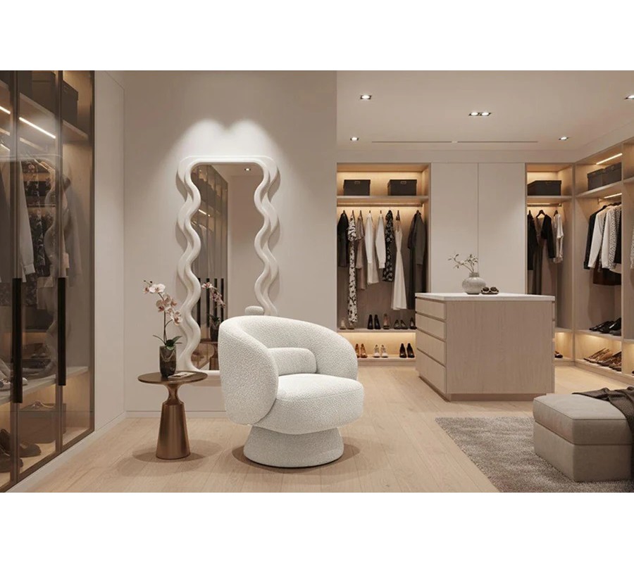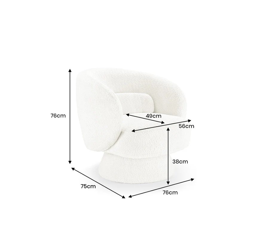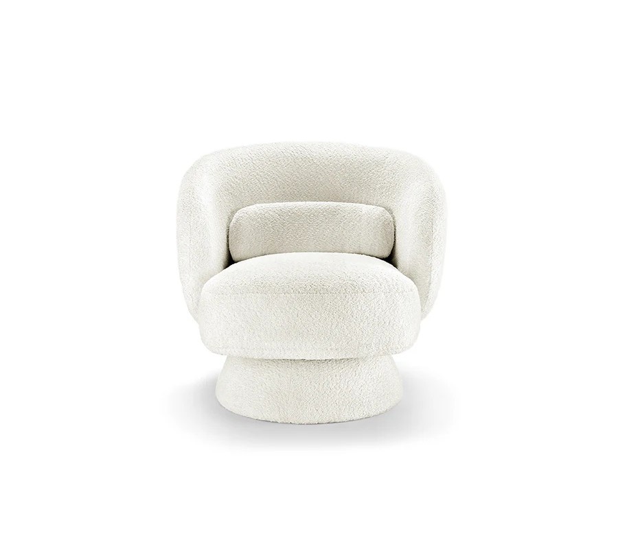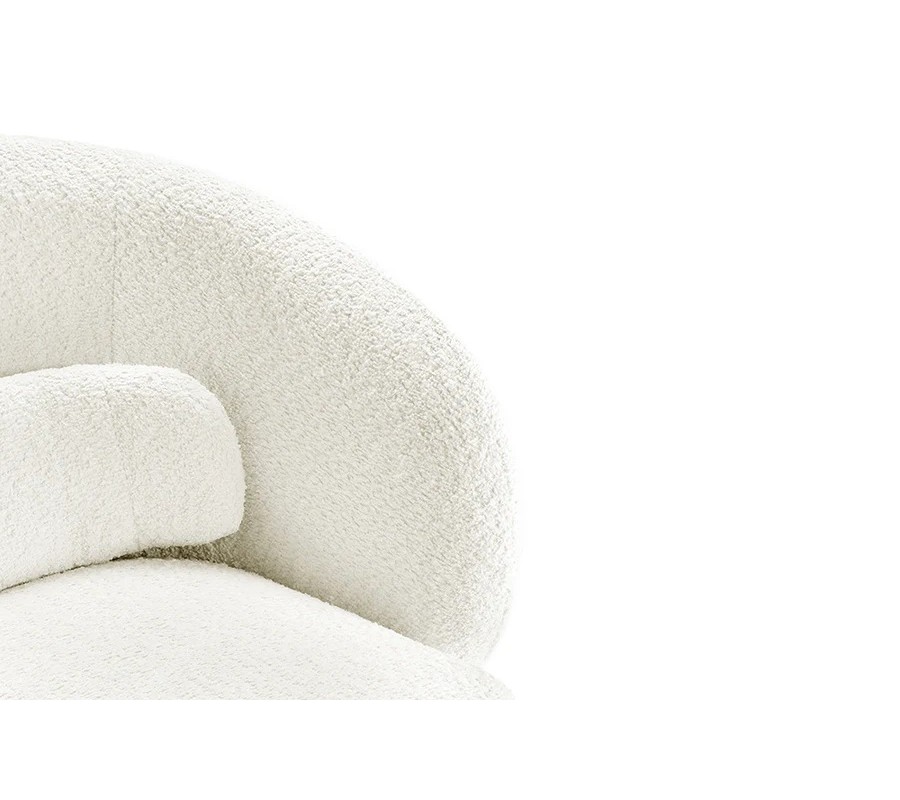 Kreslo je čalúnené bielym buklé poťahom, ktorý je mäkký, jemne štruktúrovaný a mimoriadne príjemný na dotyk. Tento materiál patrí medzi obľúbené stálice interiérového dizajnu a v spojení s moderným tvarom dodáva kreslu sofistikovaný, no zároveň útulný charakter. Zaoblené operadlo spolu s integrovaným vankúšikom poskytujú pohodlnú oporu chrbta a zvyšujú komfort pri sedení.