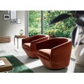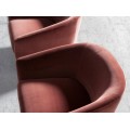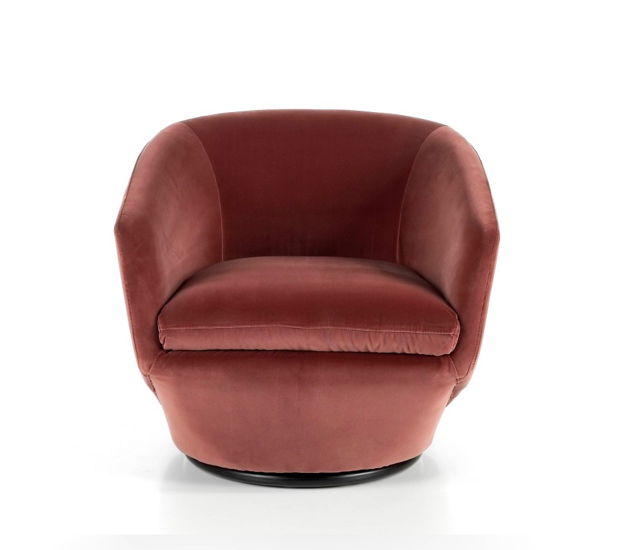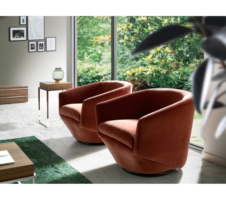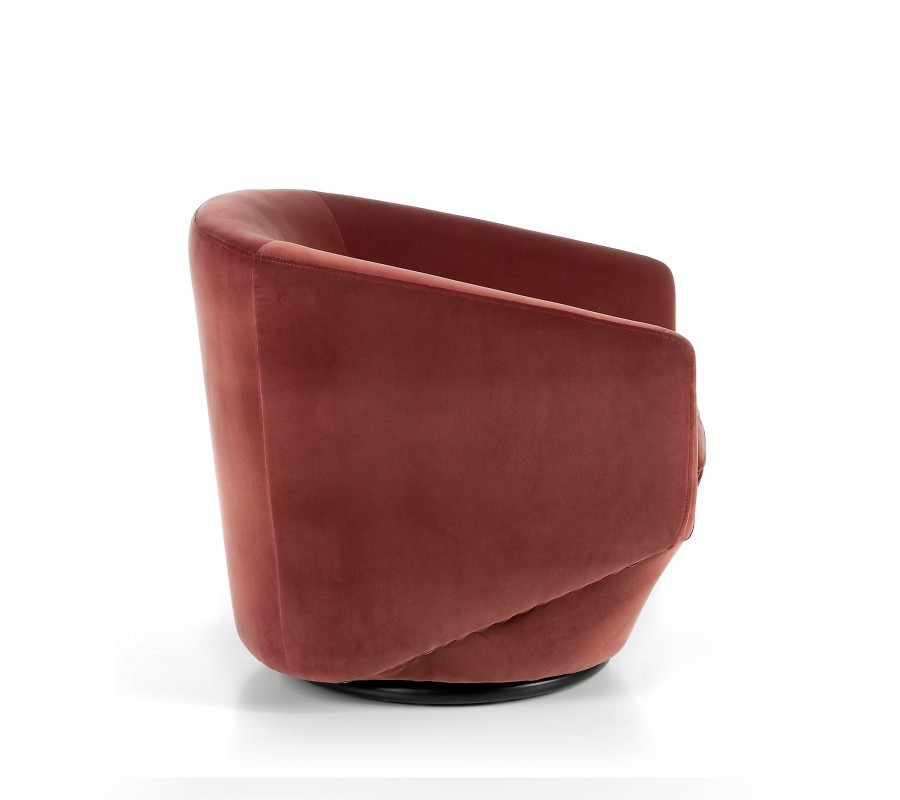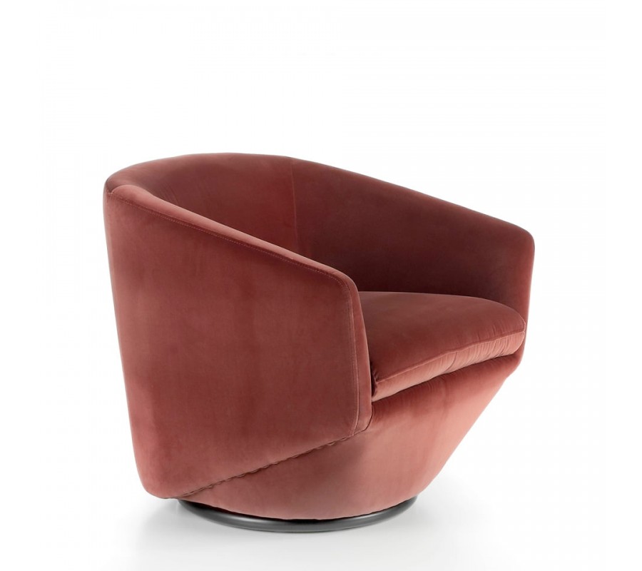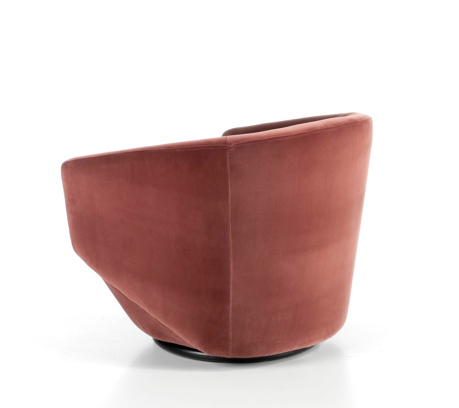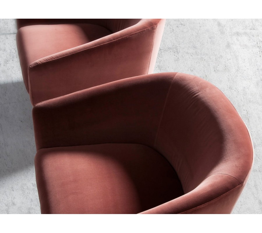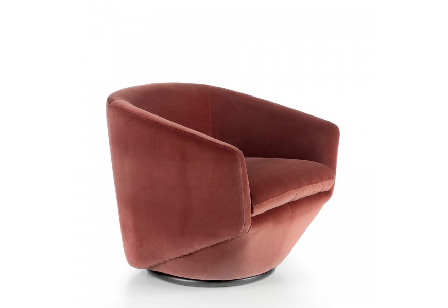 Toto otočné kreslo ponúka jedinečný taliansky dizajn, obohatený o nádych art-deco štýlu vďaka svojmu vyhotoveniu. Tomu dominuje nízka, obopínajúca chrbtová opierka s bočnými opierkami, ktoré sa nesú v jednej línií. Kreslo Forma Moderna disponuje zamatovým čalúnením v broskyňovo červenej farbe, ktoré dodá dotyk jemnosti a elegancie. Kreslo je zasadené do okrúhleho podstavca z čiernej leštenej ocele, ktoré krásne doplní celkový elegantný vzhľad kresla.