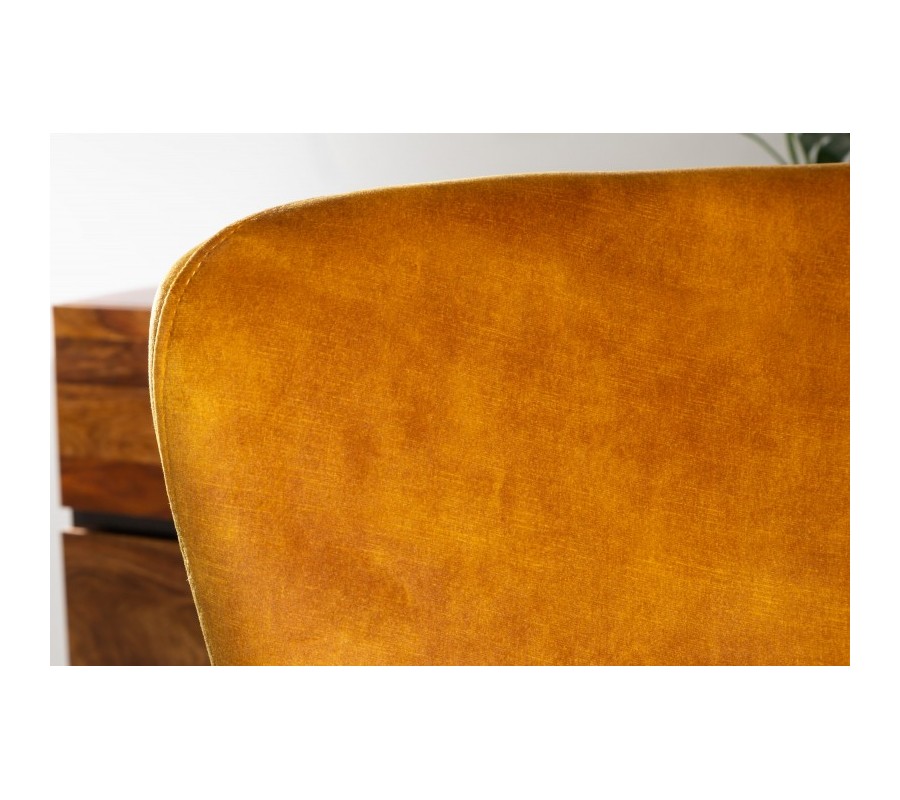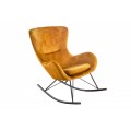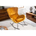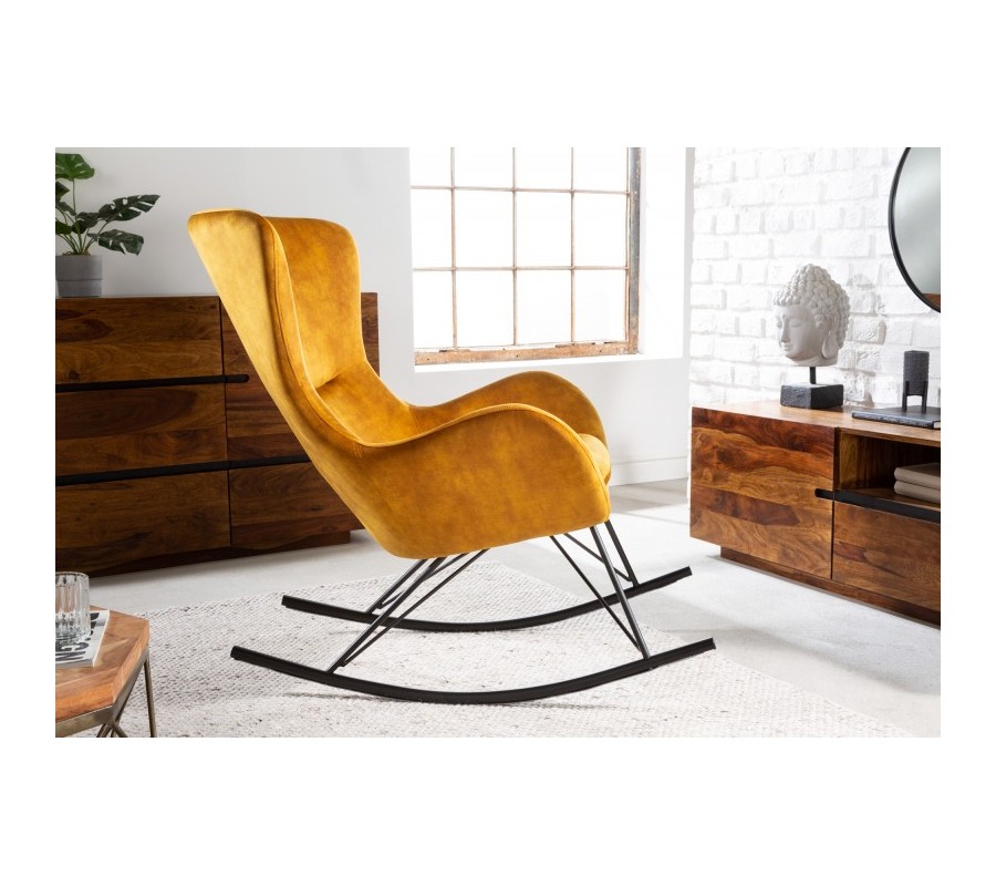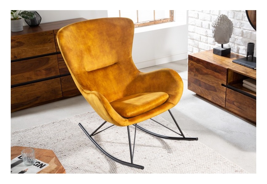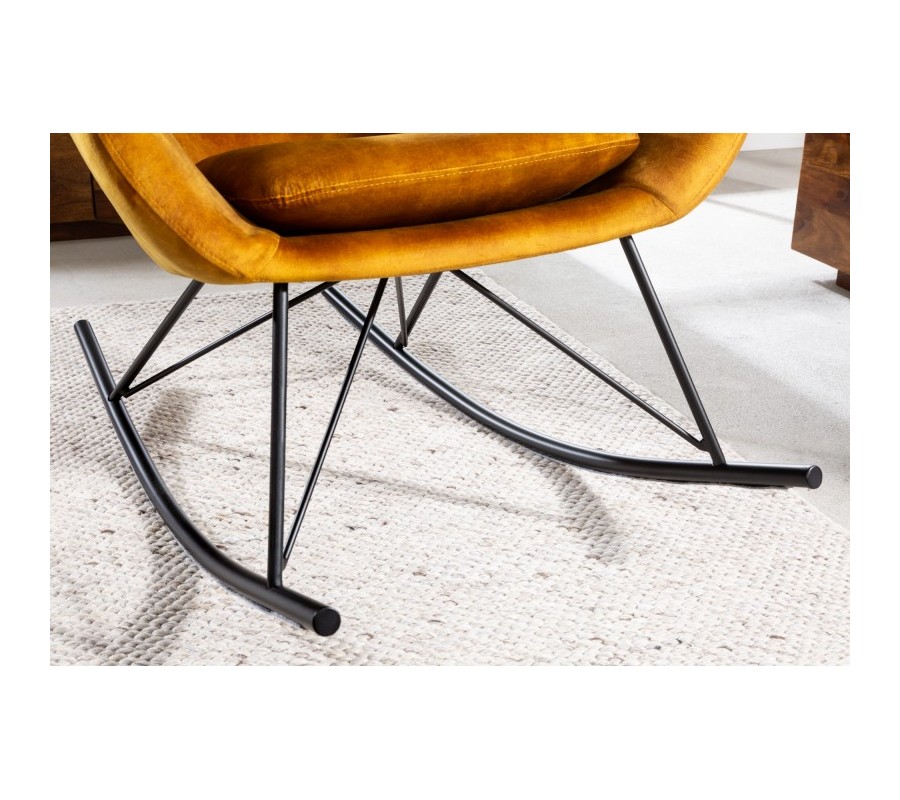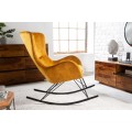 Dizajnové hojdacie kreslo Foamin s horčicovožltým zamatovým poťahom a s čiernou podstavou z kovu 99cm