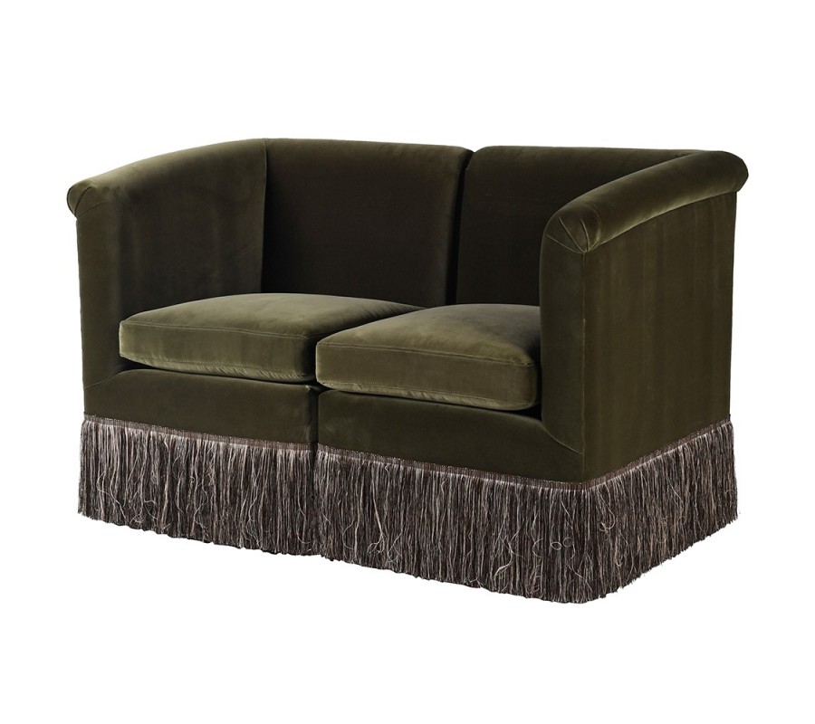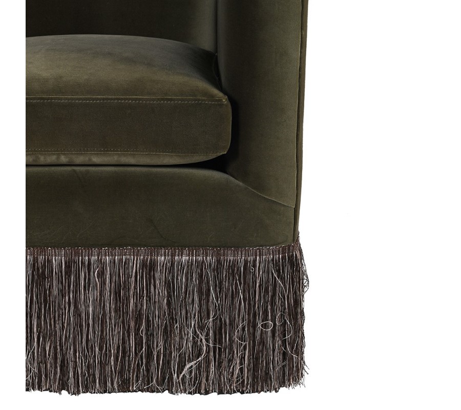Luxusné rohové kreslo Fring disponuje zamatovým čalúnením zo 100% bavlny v tmavozelenej farbe, ktoré sa vyznačuje svojou jemnou textúrou a pohodlím. Dizajnová stránka je doplnená o elegantný prvok v podobe štýlových strapčekov v tmavosivej farbe, vďaka ktorým rohové kreslo Fring získa svoj retro nádych.