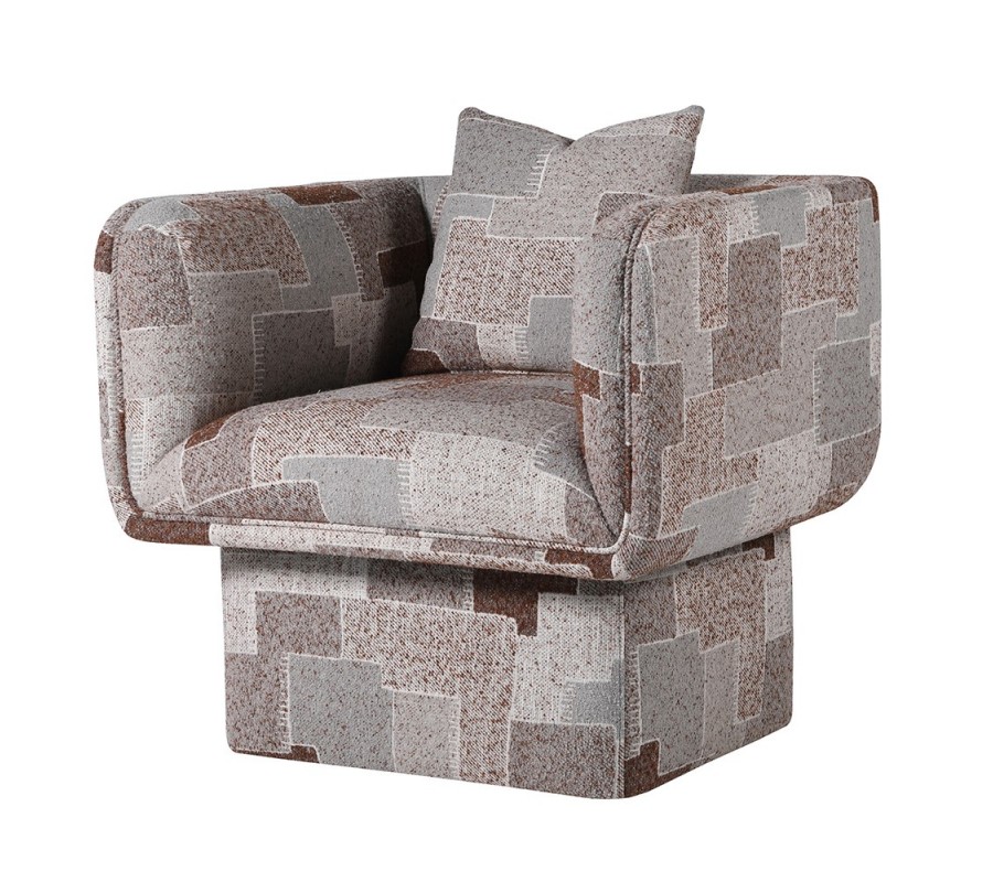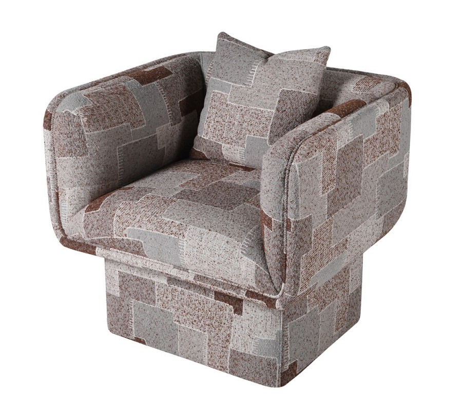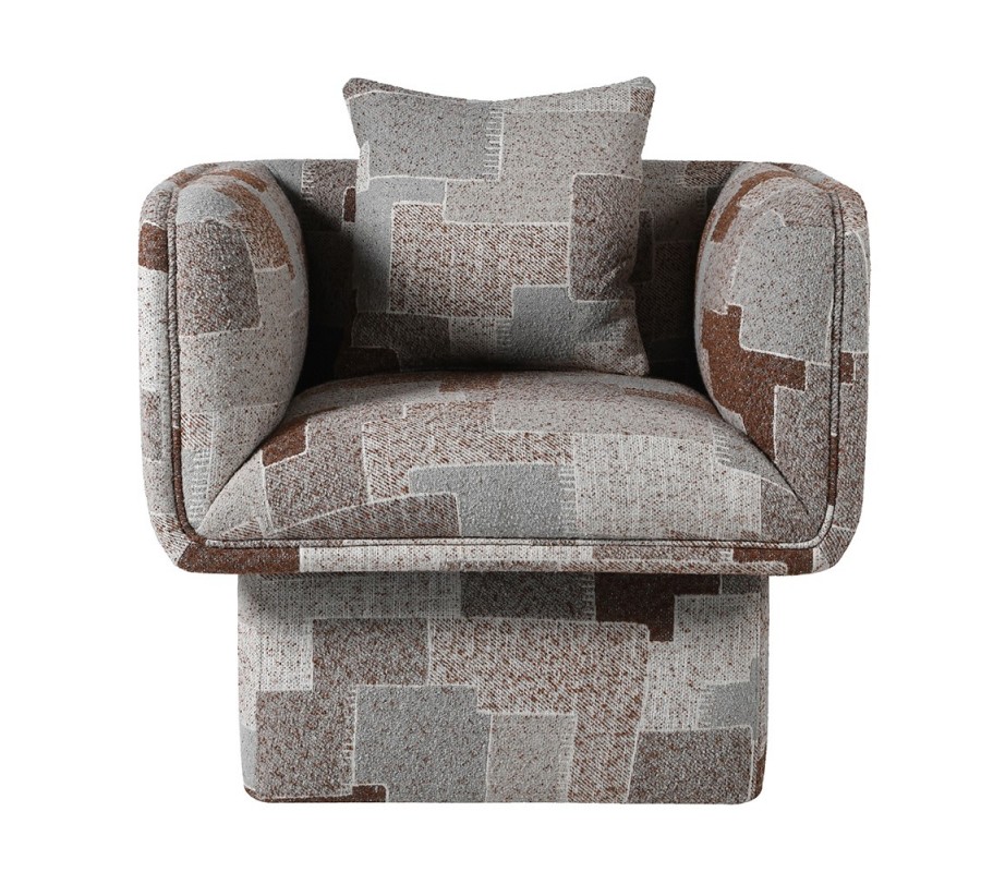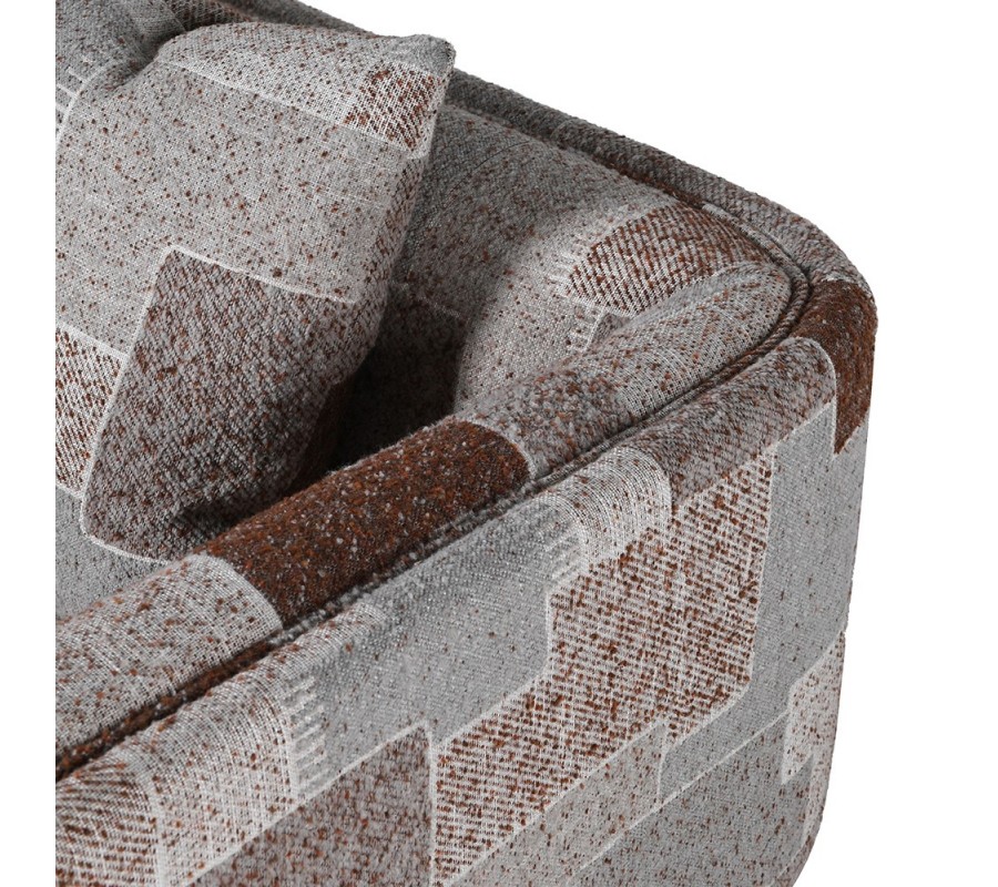 Kreslo Bimba zaujme svojím jedinečným geometrickým vzorom v sivo-hnedej farebnej kombinácii, ktorý pridáva dynamiku a vizuálny pôvab do Vašej modernej obývačky. Čalúnenie kresla je vyrobené z kvalitného textilu a ľanu, čo zaručí jemný a príjemný povrch kresla.