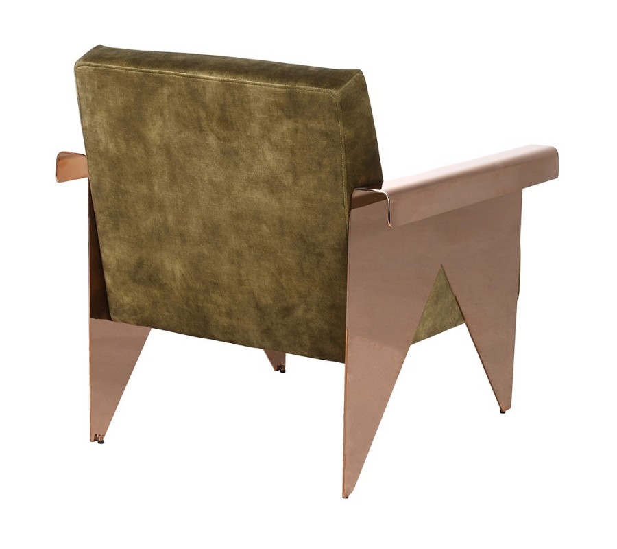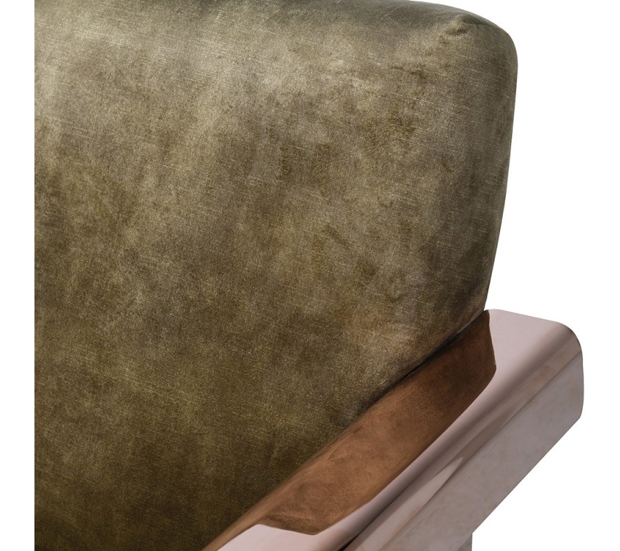 Moderné kreslo Triangulo je dizajnovým skvostom. Na prvý pohľad zaujmú bočné panely v bronzovej farbe s lesklým priehľadným lakom. Na spodnej strane sa nachádza výrez v tvare trojuholníka. Tento negatívny priestor vytvára predné a zadné nožičky, taktiež v tvare trojuholníkov, ktoré sa spájajú na úrovni sedacej časti a plynule prechádzajú do opierky na ruky, ktorá je zahnutá do vonkajšej strany. Jej jemné zaoblenie sa prepája s tvarom sedacej časti a chrbtovej opierky. Tá svojimi rovnými líniami tiež nadväzuje na geometrické dizajnové tendencie bočných strán kresla. Zamatový poťah v olivovo zelenej farbe výborne ladí s bronzovou farbou kovových častí. Tieto prírodné teplé odtiene vytvárajú estetický kontrast s moderným tvarom kresla. V interiéroch v štýle glamour ho môžete prepojiť s ďalším nábytkom s lesklými kovovými prvkami vďaka bronzovej farbe zvýraznenej vrchným lesklým lakom. Takýmto spôsobom môžete kreslo doplniť aj art deco nábytkom. Okrem zamatu a lesklého bronzu ho s estetikou tejto éry spájajú aj čisté geometrické tvary. Ak chcete, aby vo vašej obývačke, pracovni, či spálni vynikla originálna silueta, odporúčame kombináciu s jednoduchým moderným lineárnym nábytkom, čím dodáte vášmu interiéru nadčasový vzhľad.