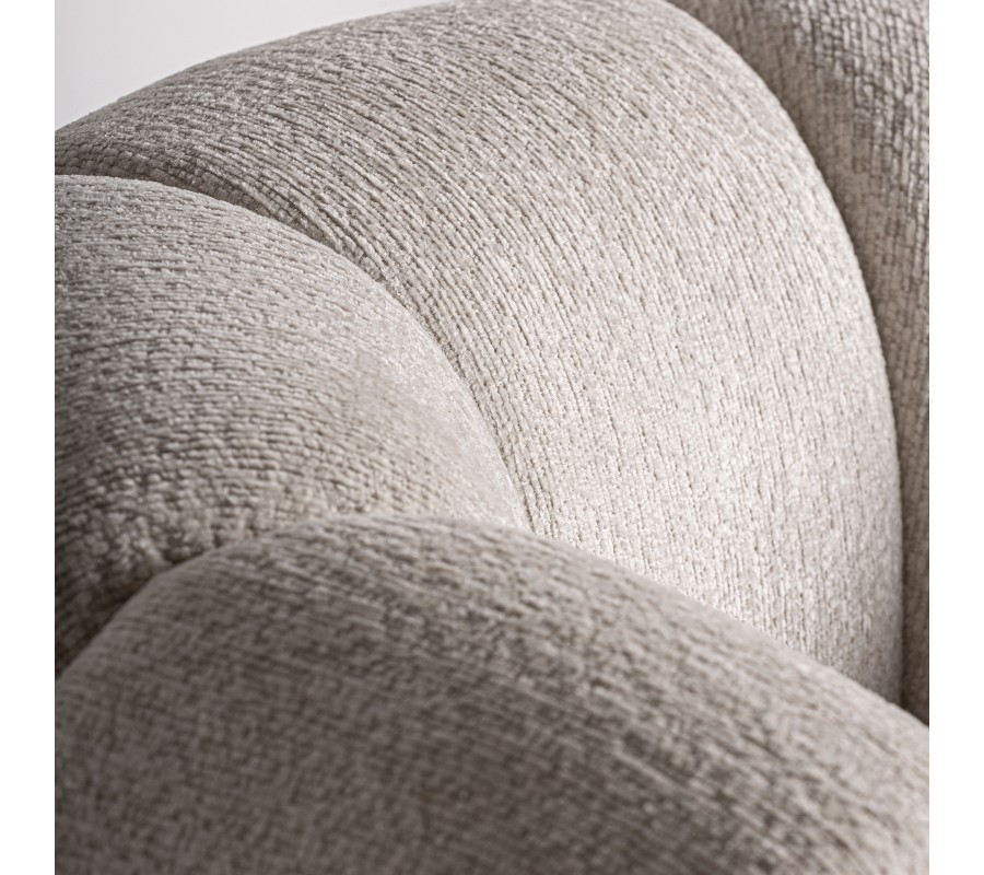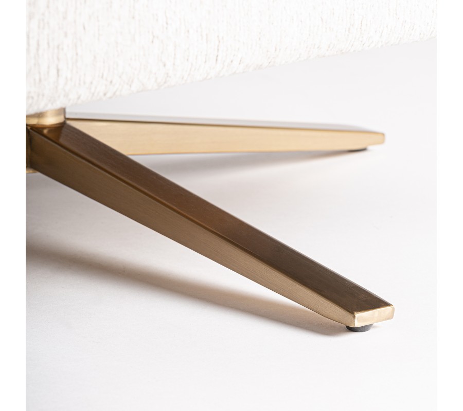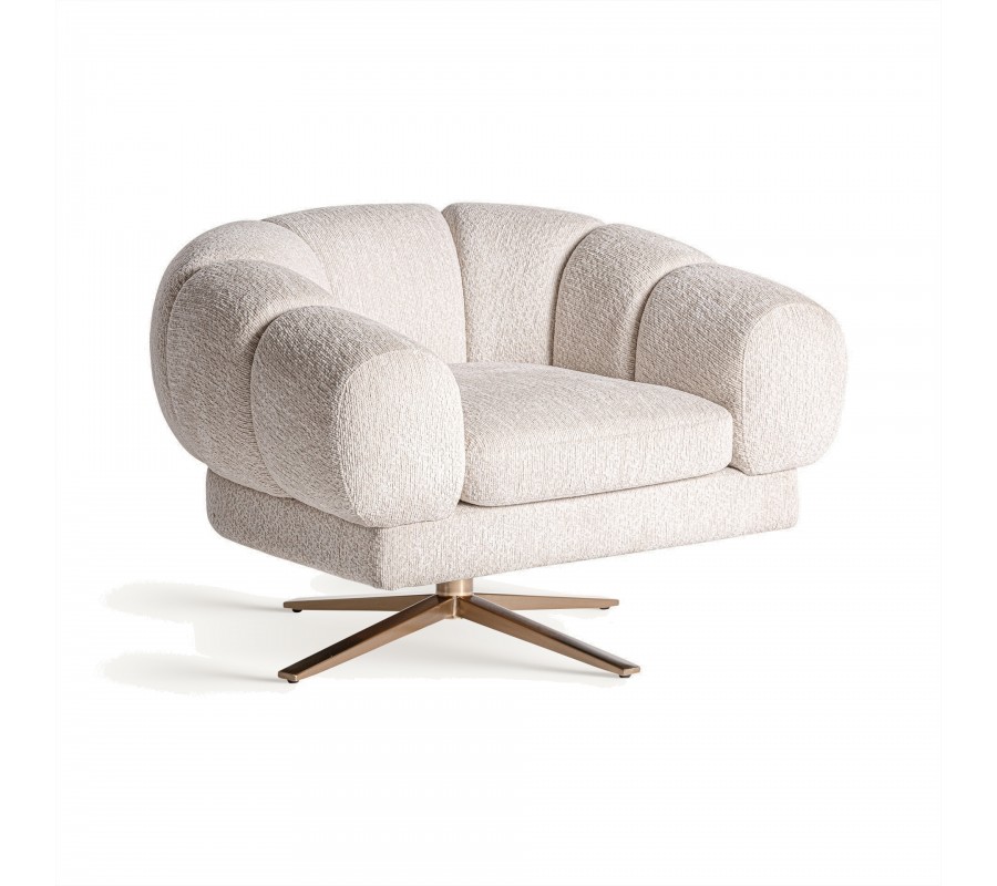 Otočné kreslo Jean je príkladom glamour elegancie a pohodlia, inšpirovaným Art Deco štýlom, ktorý ponúka luxusný vizuál a komfortné posedenie. Jeho prešívaný zamatový poťah v šedo-bielej farbe odráža sofistikovanosť a ponúka hmatový zážitok, pričom zdôrazňuje jemné línie a oblúkové tvary dizajnu. Prešívane detaily nie len že pridávajú vizuálny rozmer, ale zároveň zvyšujú pocit pohodlia pri sedení. Medené nožičky kresla sú prekrížené v štýle X, čo dodáva celkovému dizajnu stabilnú oporu a zároveň elegantný, takmer klenotný vzhľad. Ich lesklý povrch krásne kontrastuje s matným zamatovým poťahom, čo je charakteristickým rysom Art-deco štýlu. Svojimi rozmermi a tvarom je kreslo Jean ideálne na rozmanité použitie, či už ako dominantný kus nábytku v obývacej izbe, pohodlné sedadlo v čítacej zóne, alebo ako štýlový doplnok v spálni. Jeho unikátne estetické prvky a nezameniteľný charakter poskytujú neobyčajný príklad toho, ako dizajn môže ovplyvniť atmosféru miestnosti a zároveň poskytovať užívateľský komfort.