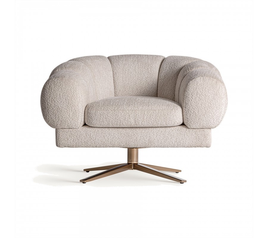 Luxusne otočne art-deco kreslo Jeans so zamatovým prešívaným poťahom v sivo bielej farbe s nožičkami v medenej farbe 95cm